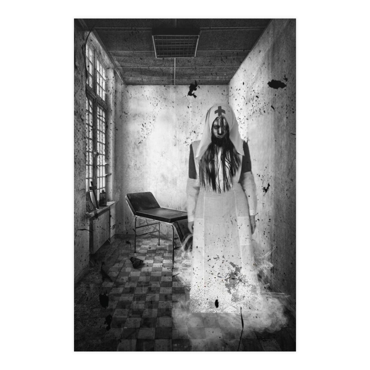 Introducing our exquisitely crafted Gothic Wall Art Poster, featuring a spine-chilling portrayal of a Creepy Nurse. This hauntingly captivating photo captures the essence of a Haunted Asylum, evoking an eerie ambiance that is sure to send shivers down your spine. Meticulously designed, this Horror Print showcases a perfect blend of macabre aesthetics and artistic finesse, making it an ideal addition to any Halloween-themed decor or Gothic art collection. With its intricate details and impeccable craftsmanship, this Goth Art Print Portrait is bound to captivate the imagination of horror enthusiasts and aficionados alike. Embrace the darkness and indulge in the enigmatic allure of this exceptional piece, as it effortlessly infuses an air of mystique and intrigue into any space it graces.