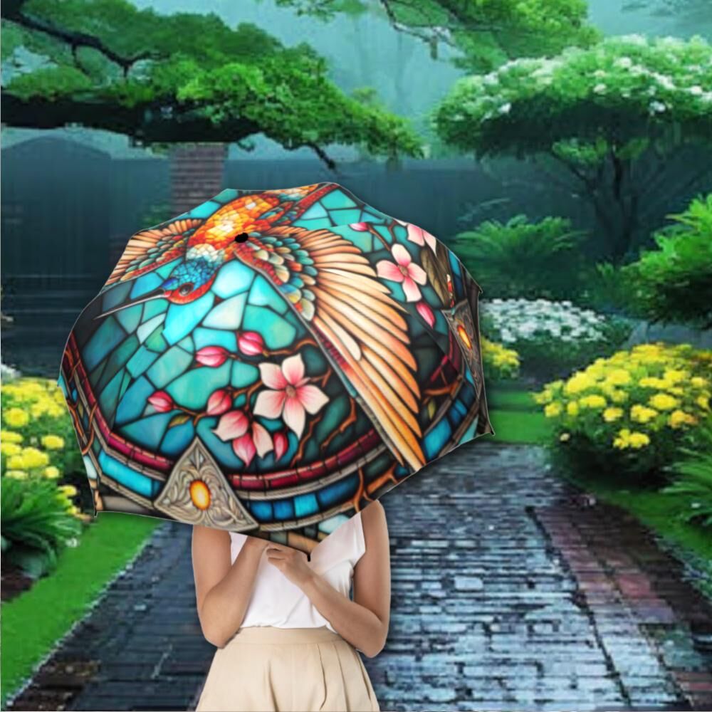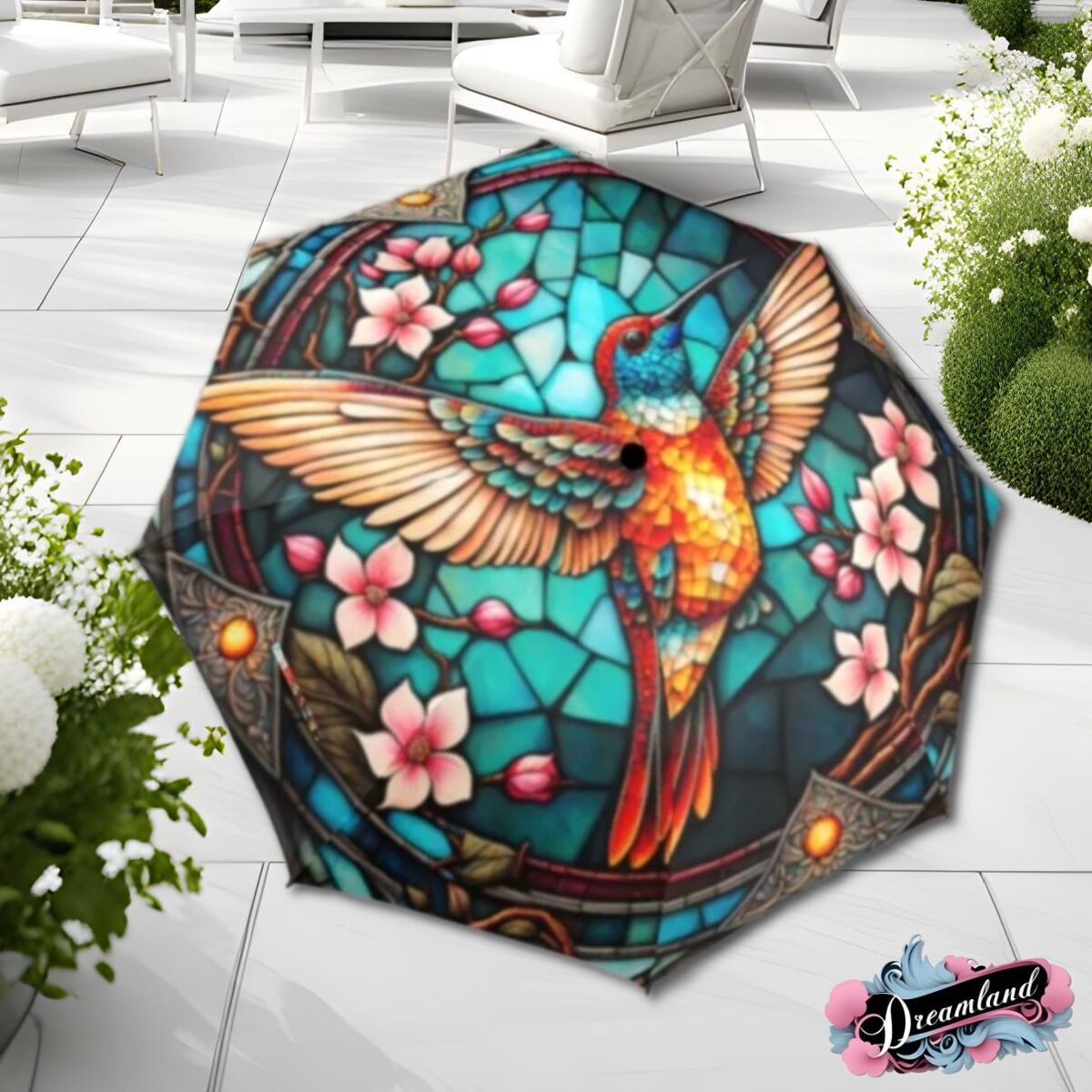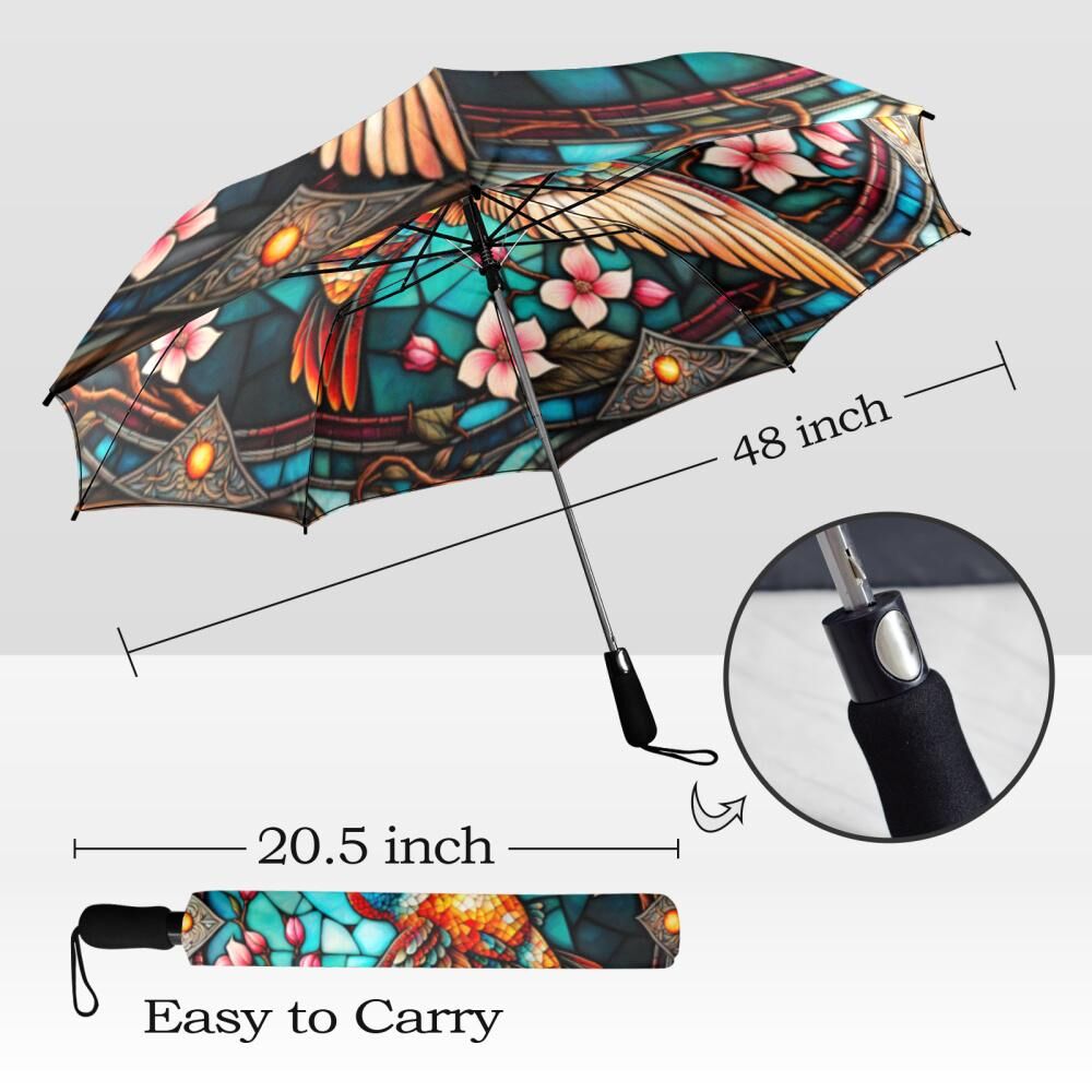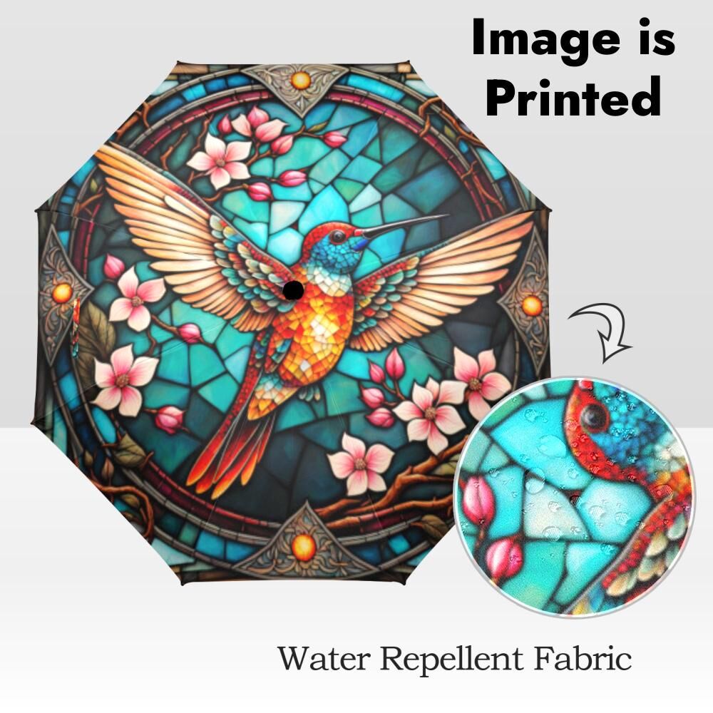 Hummingbird Romantic Umbrella Victorian Inspired Faux Stained Glass Flower Parasol Semi-Automatic Waterproof Foldable Umbrella