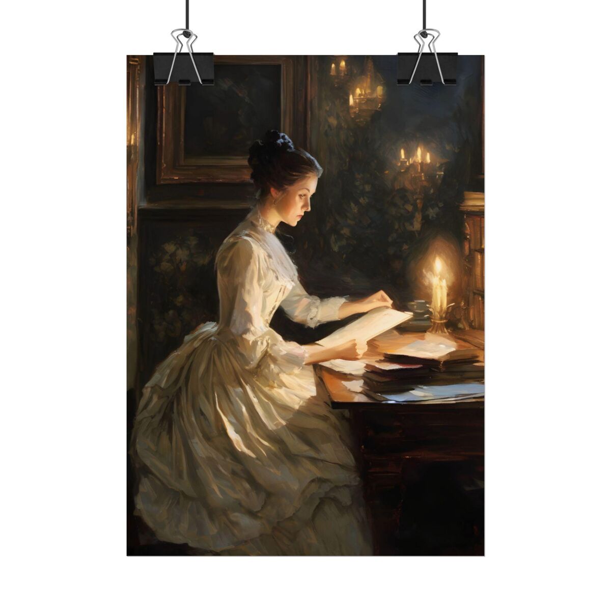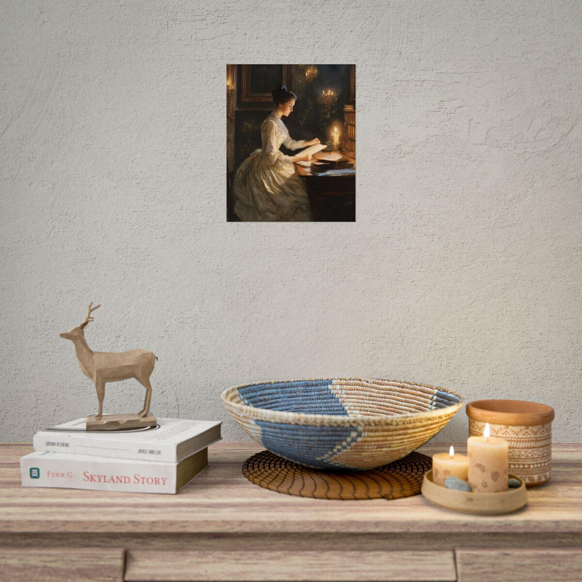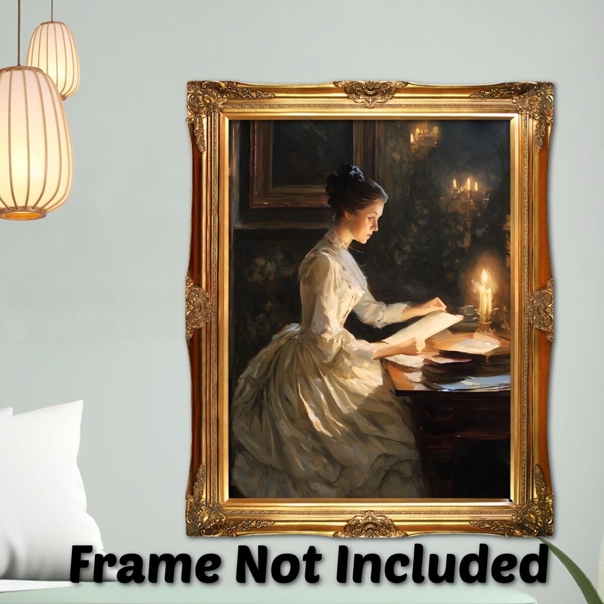 Enhance the ambiance of your living space with this captivating paining Print. This exquisite dark academia print features a mesmerizing lady in a dark library, exuding an enchanting aura that will add a touch of mystique to any room. This is a print of the original painting, and is exclusive to Dreamland