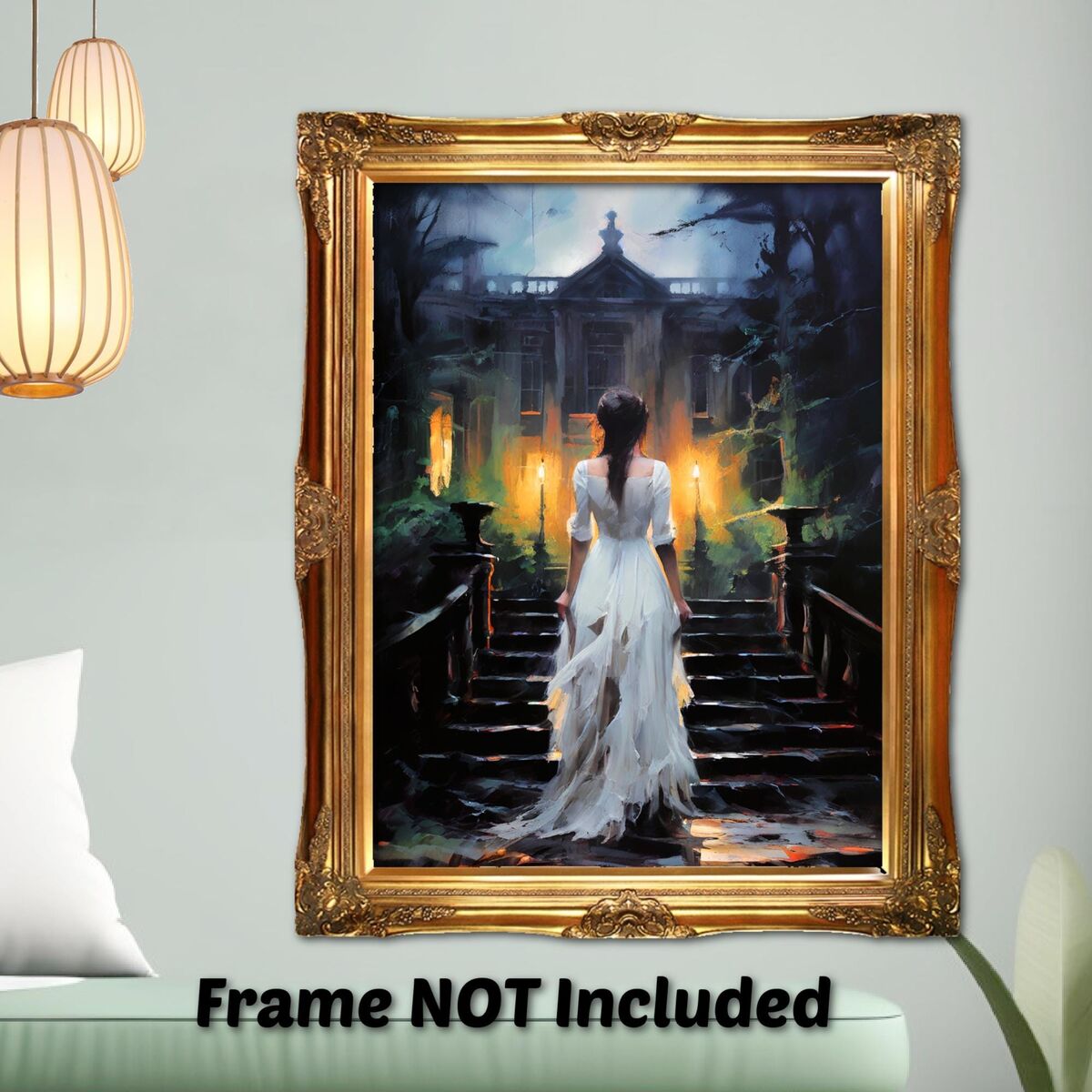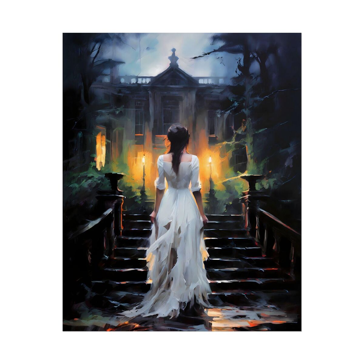 Lady In White Print Dark Academia Oil Painting Print Nocturne Girl Ghost At Haunted House Dark Victorain Dark Moody Wall Art
