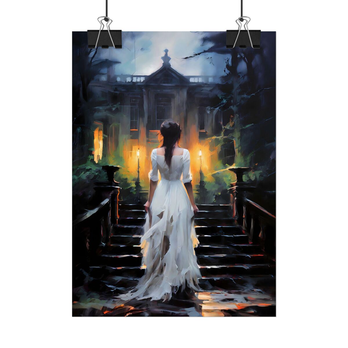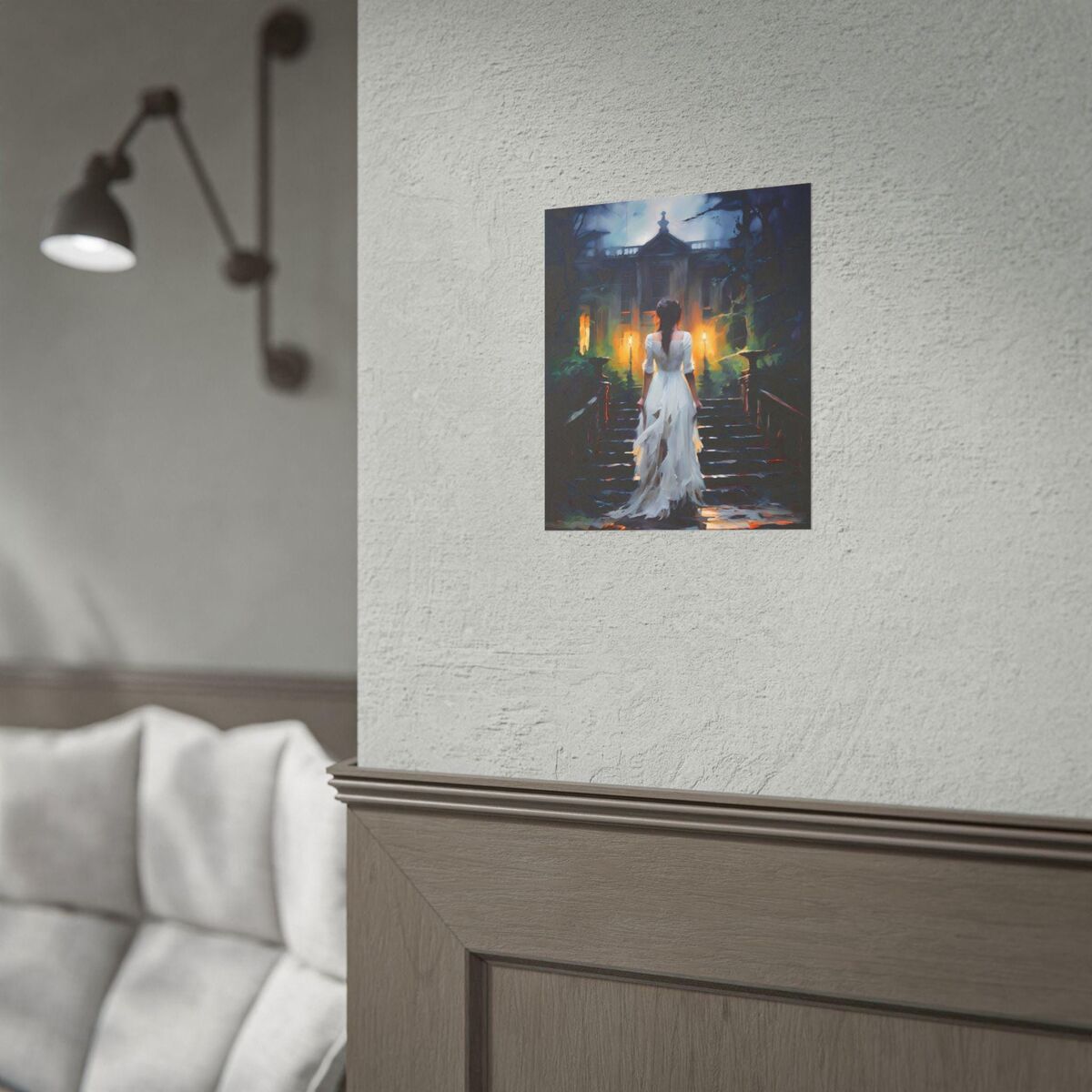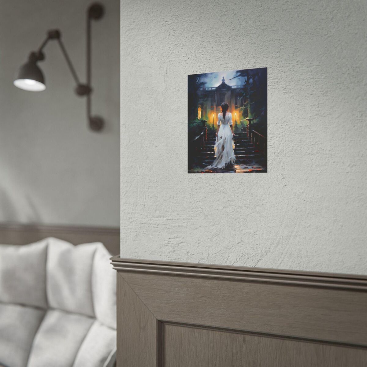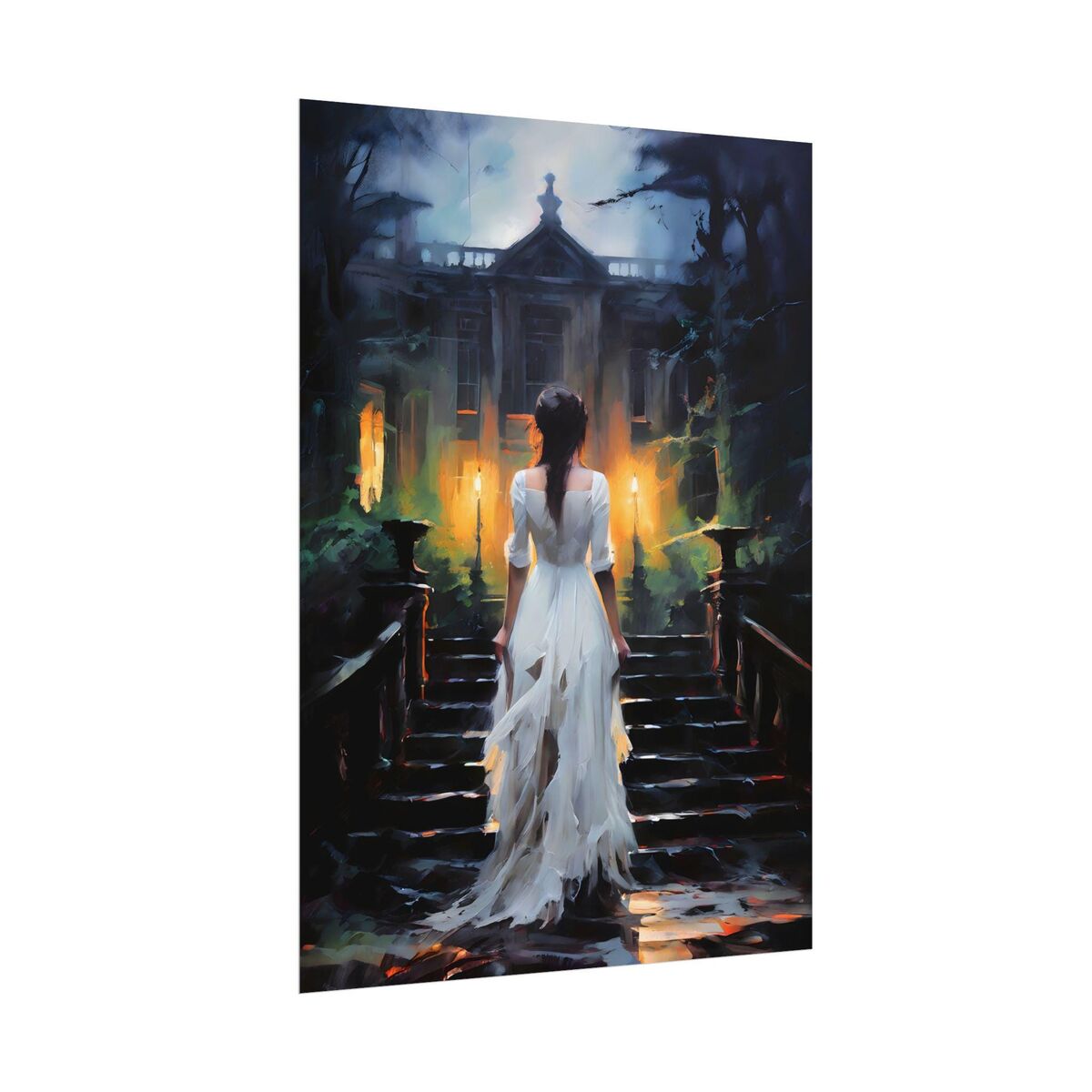 Enhance the ambiance of your living space with this captivating painting Print. This exquisite dark academia print features a mesmerizing ghost in front of a old house, exuding an enchanting aura that will add a touch of mystique to any room. This is a print of the original painting, and is exclusive to Dreamland