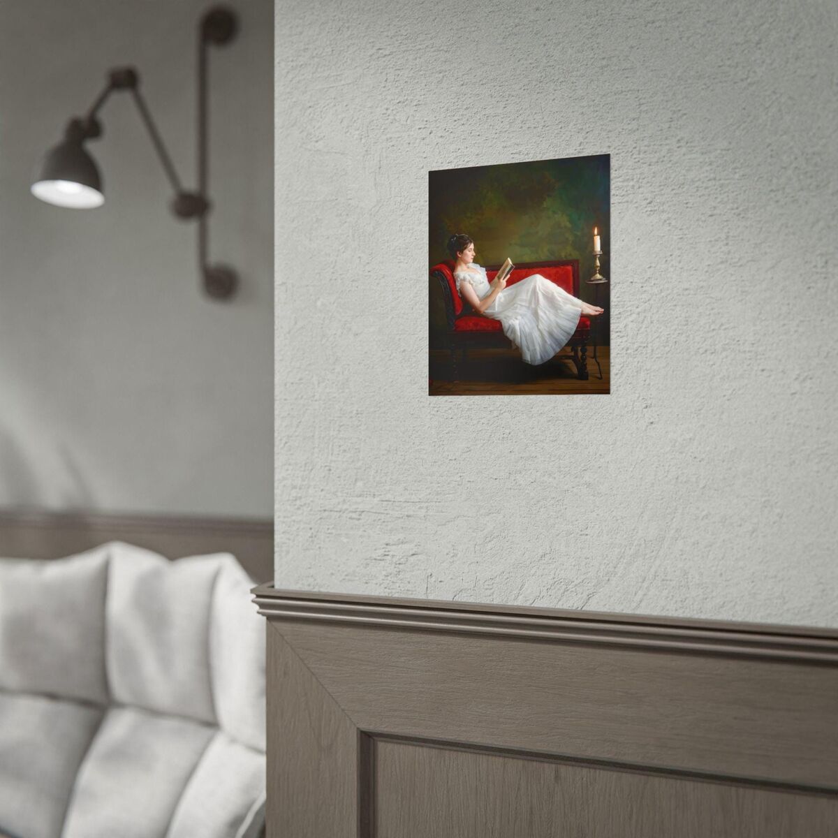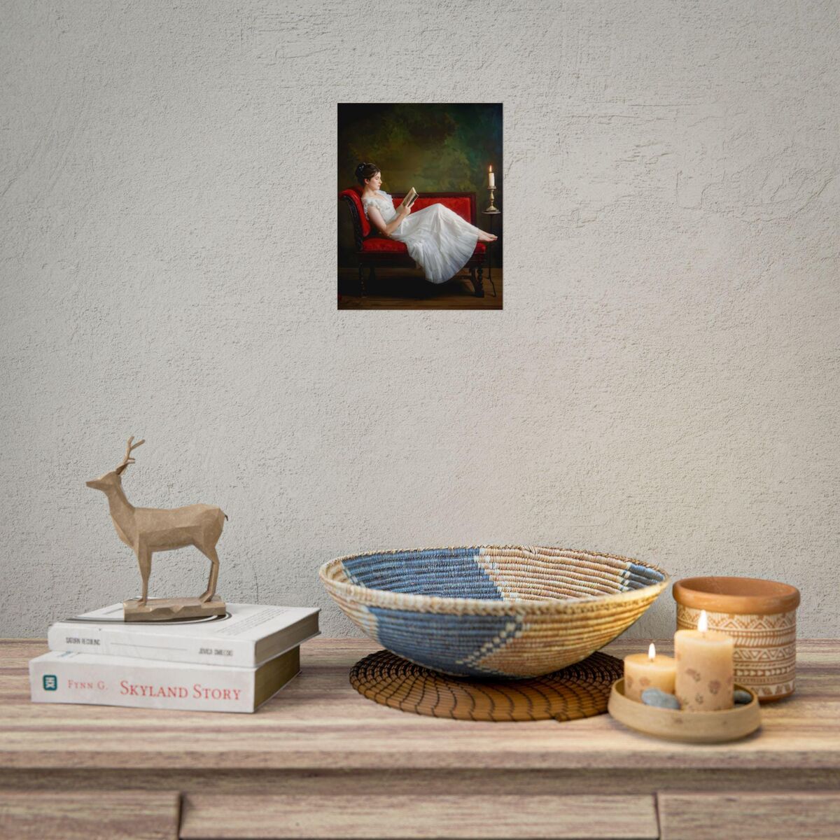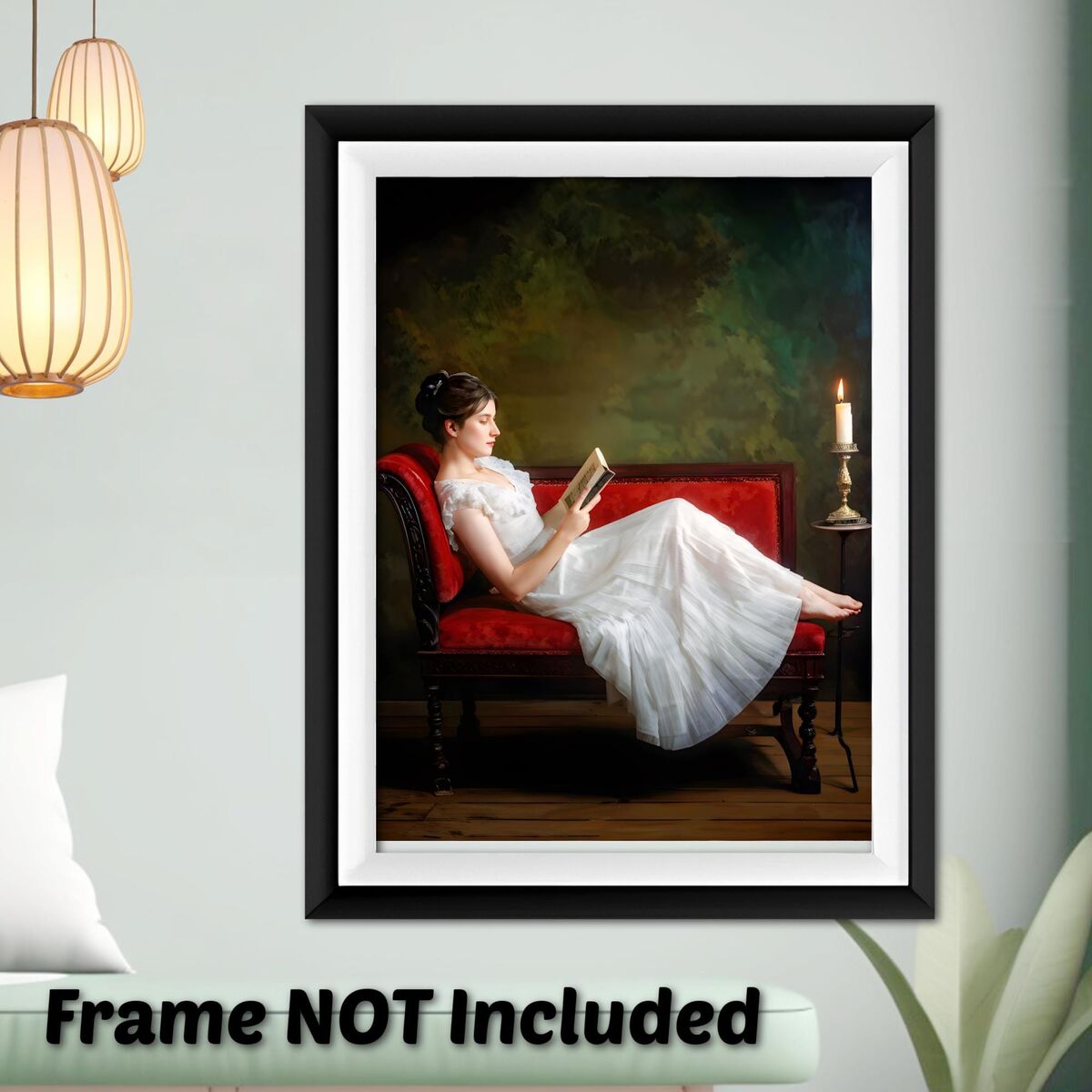 Enhance the ambiance of your living space with this captivating "Reading Jane Austin" Victorian Print. This exquisite dark academia print features a mesmerizing woman reading in the library print, exuding an enchanting aura that will add a touch of mystique to any room. This is a print of the original painting, and is exclusive to Dreamland