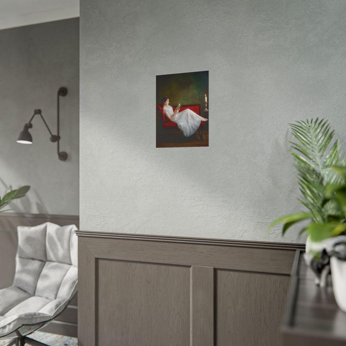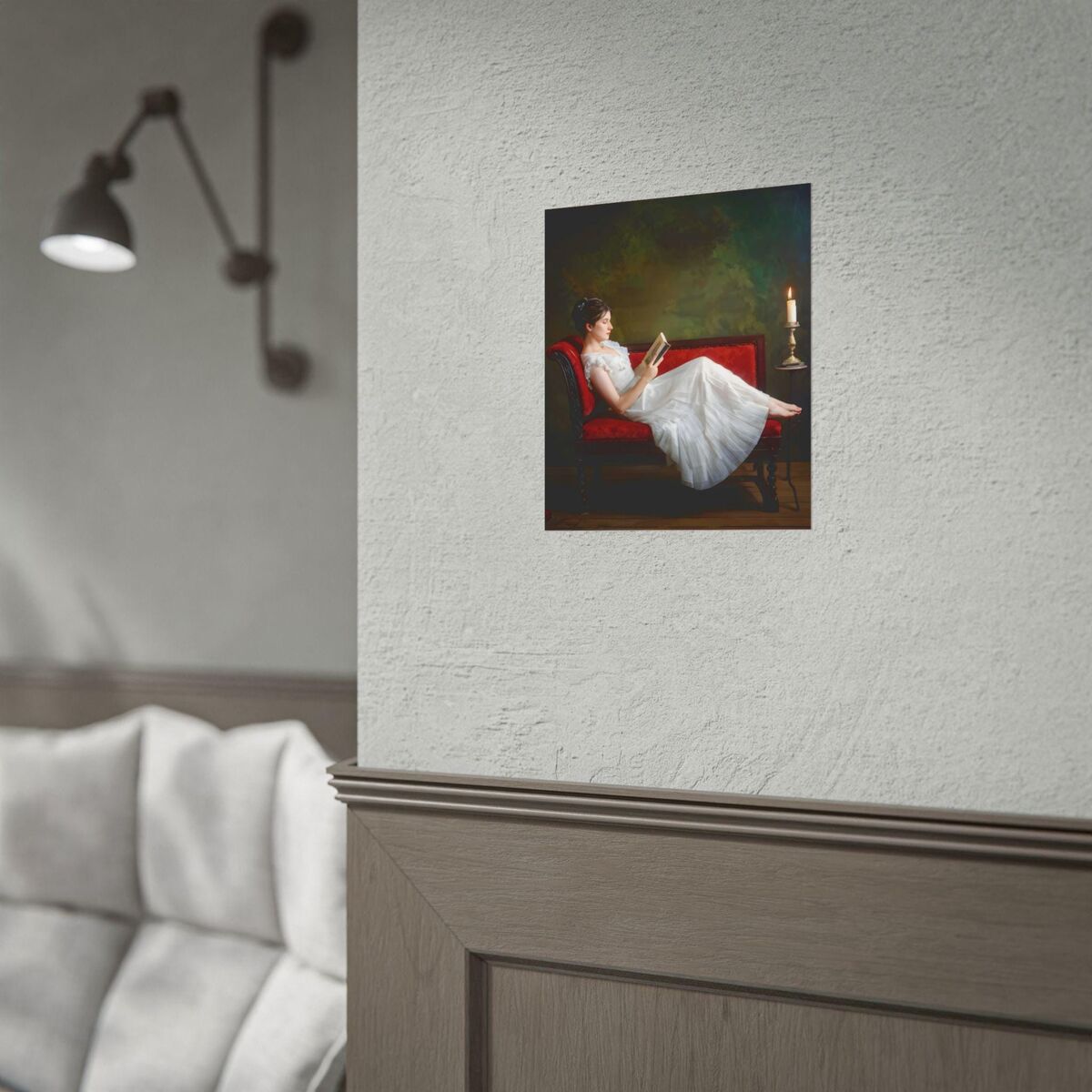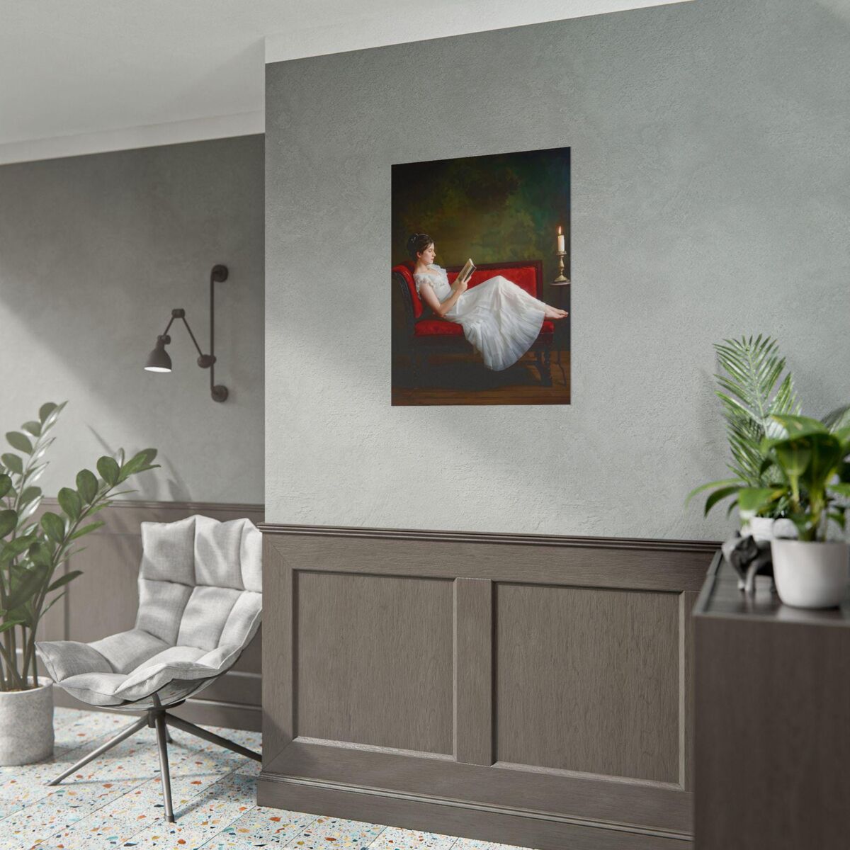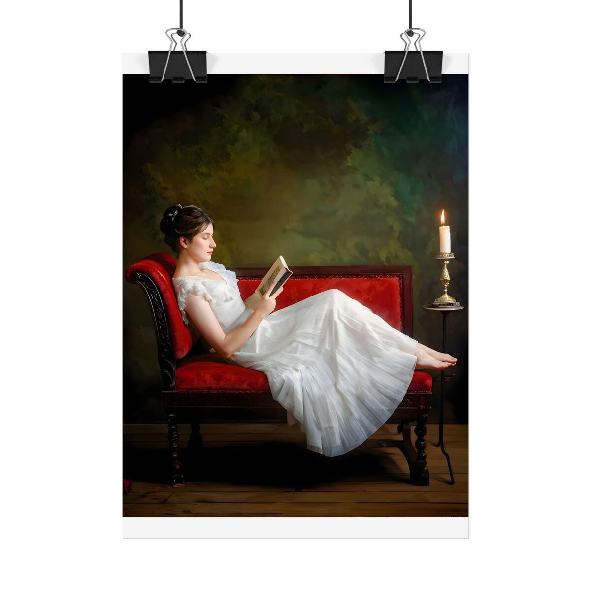 Enhance the ambiance of your living space with this captivating "Reading Jane Austin" Victorian Print. This exquisite dark academia print features a mesmerizing woman reading in the library print, exuding an enchanting aura that will add a touch of mystique to any room. This is a print of the original painting, and is exclusive to Dreamland