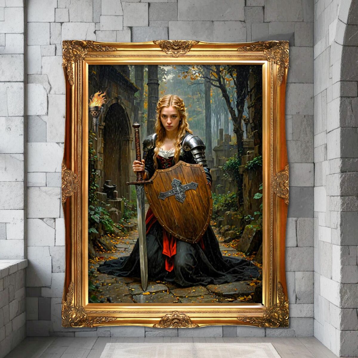 Lady Knight Art Painting Print Medieval Warrior Lady Sword Dark Academia Wall Art Oil Painting Print Dark Moody Wall Art
