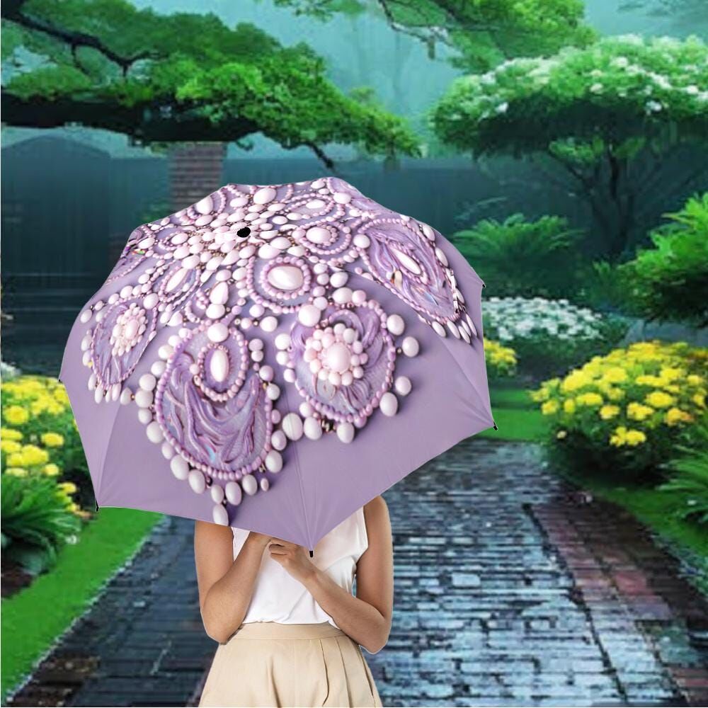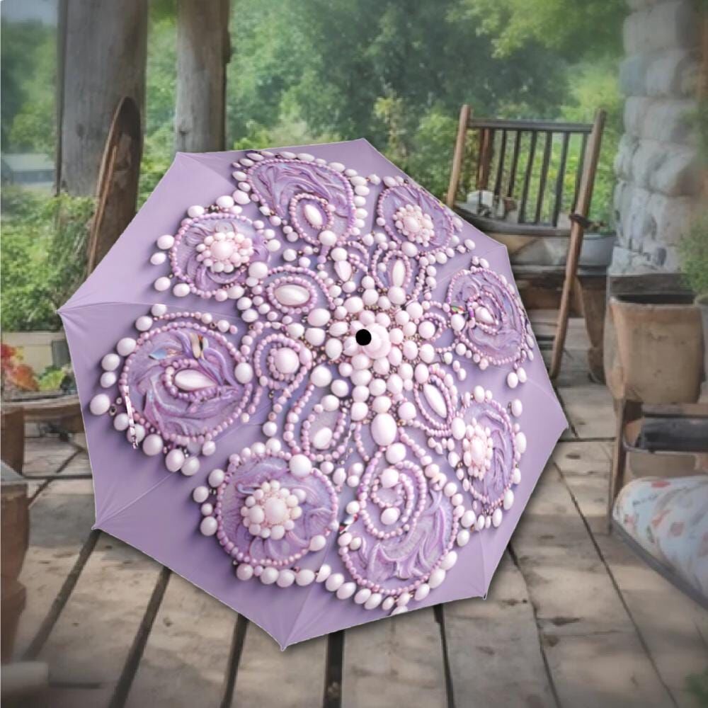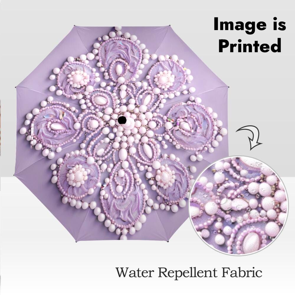 Lavender Purple Umbrella Victorian Inspired Faux Beaded Parasol Semi-Automatic Waterproof Foldable Umbrella