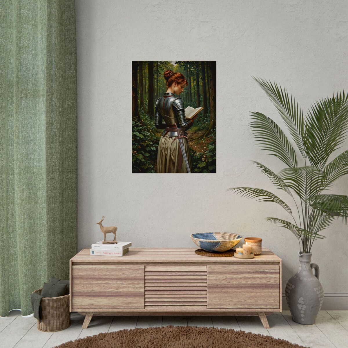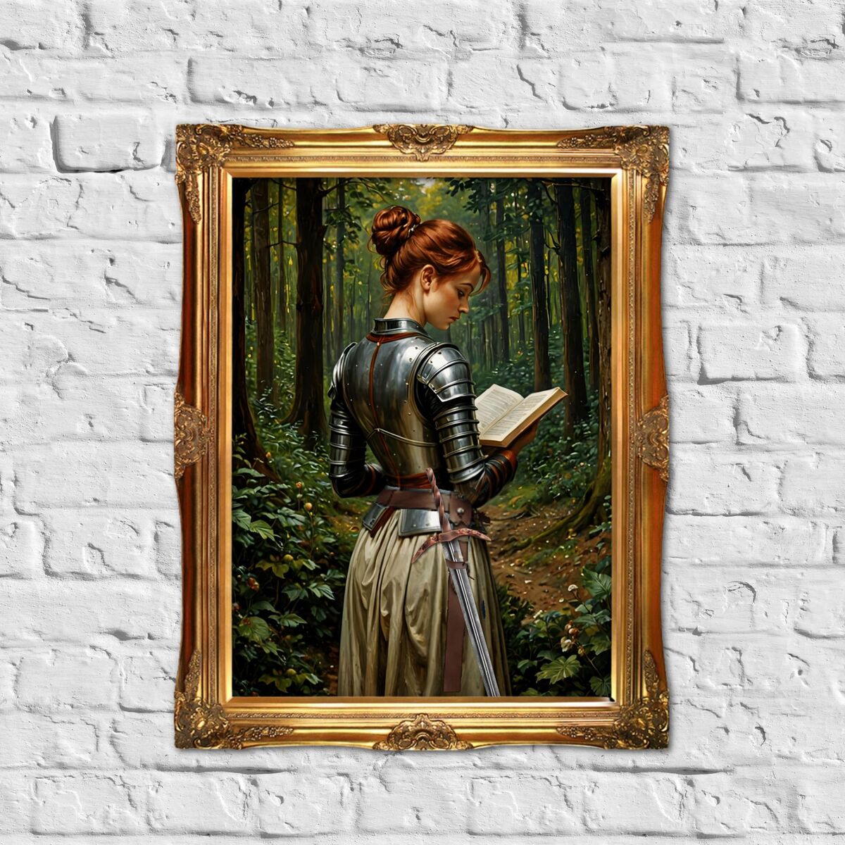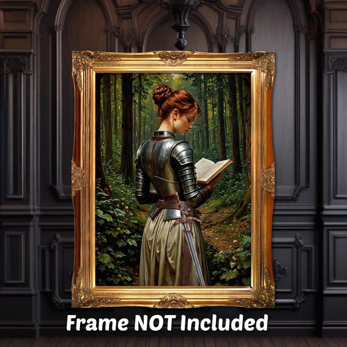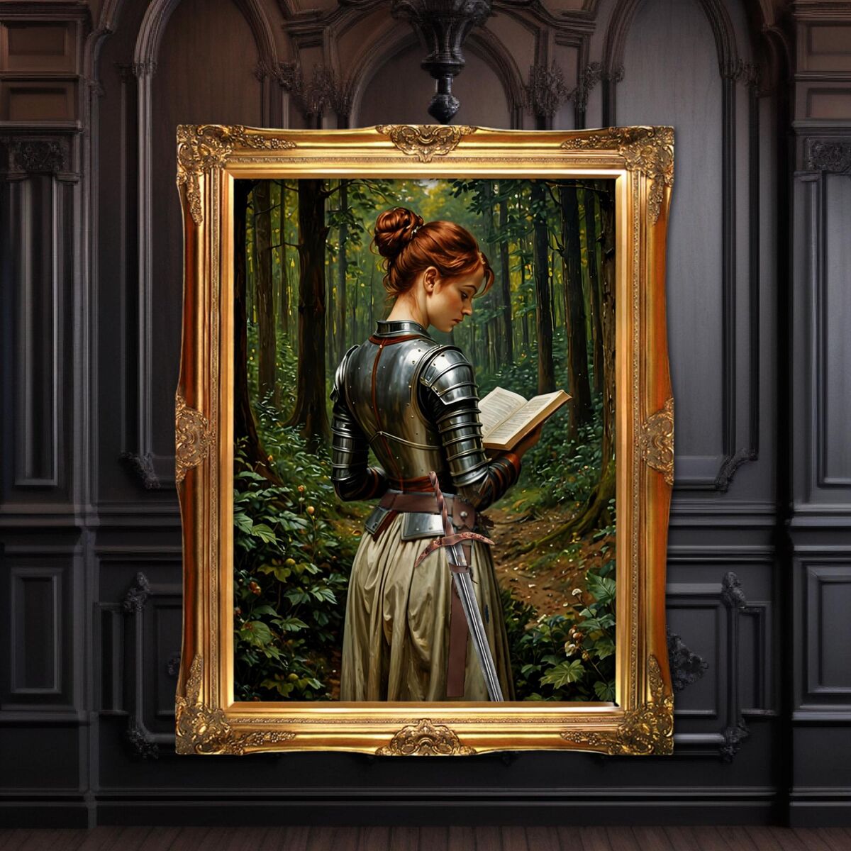 Medieval Painting Print Lady Knight Reading In Forest Dark Academia Wall Art Print Oil Painting Print Dark Moody Wall Art