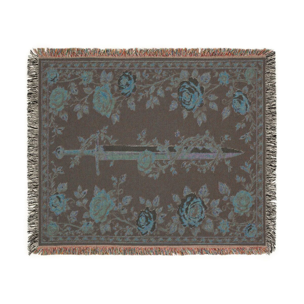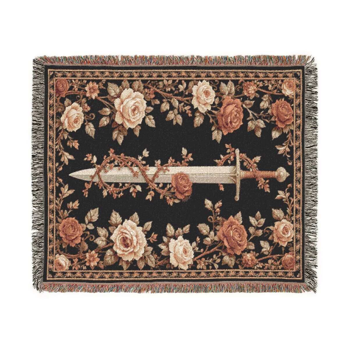 Transform your living space with the enchanting Medieval Woven Blanket featuring a captivating sword and rose This exquisite tapestry wall hanging not only serves as a cozy throw but also as a stunning piece of art that brings a touch of the medieval and medieval aesthetics to your home. Crafted with intricate details, it showcases a mystical forest scene that is perfect for those who appreciate fantasy and dark decor.
