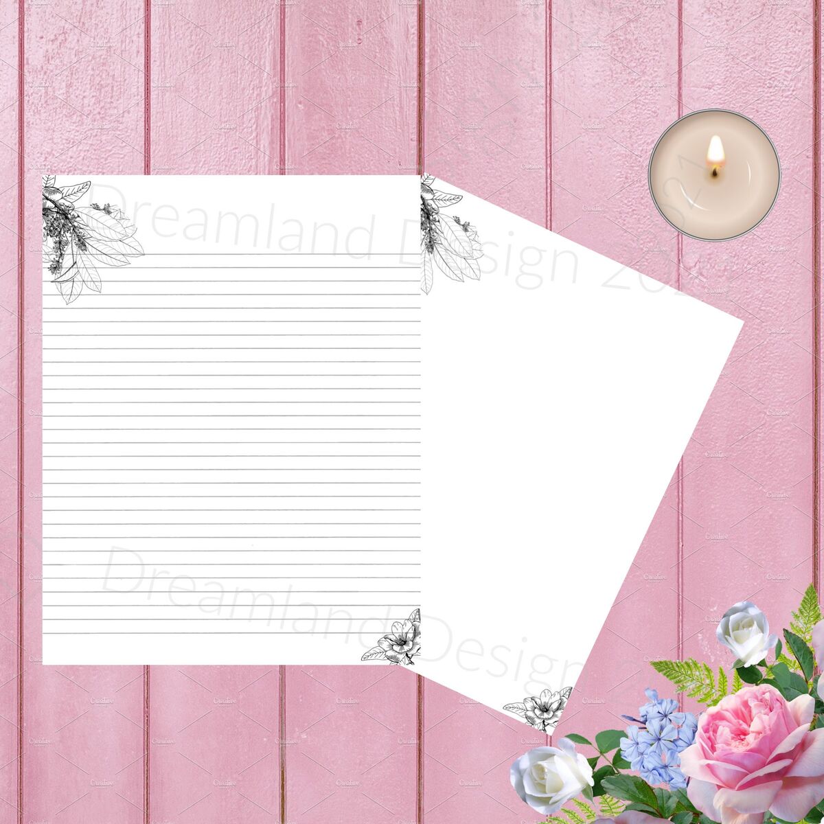 Stationary Minimalist Roses Printable Paper Botanical Leaves Flowers Blank Digital Writing Paper Lined Note Book Flower Paper