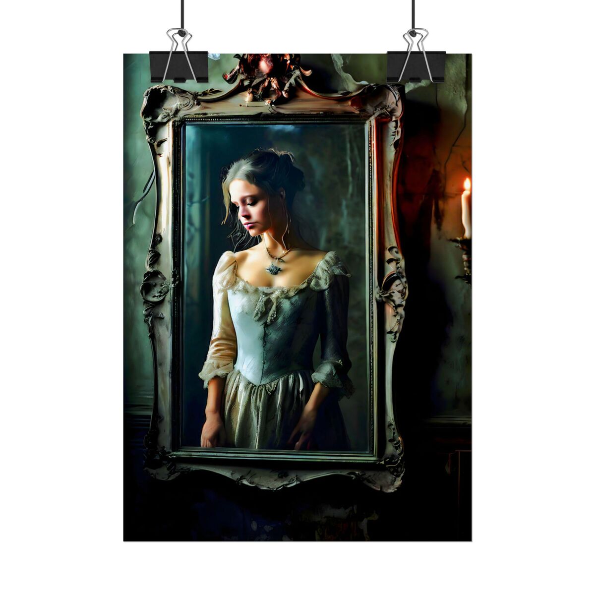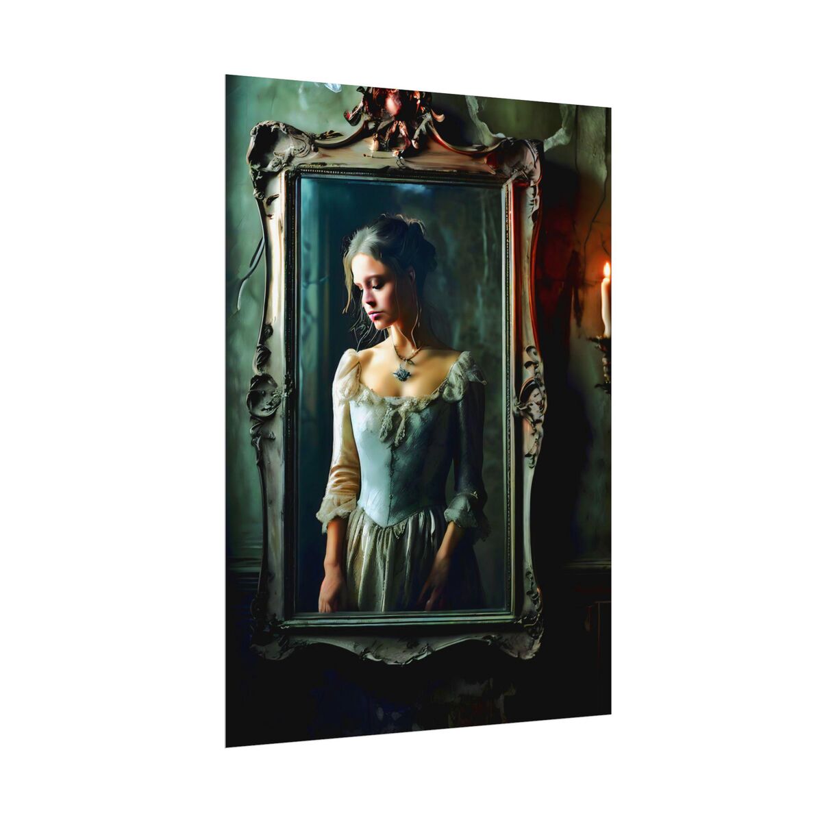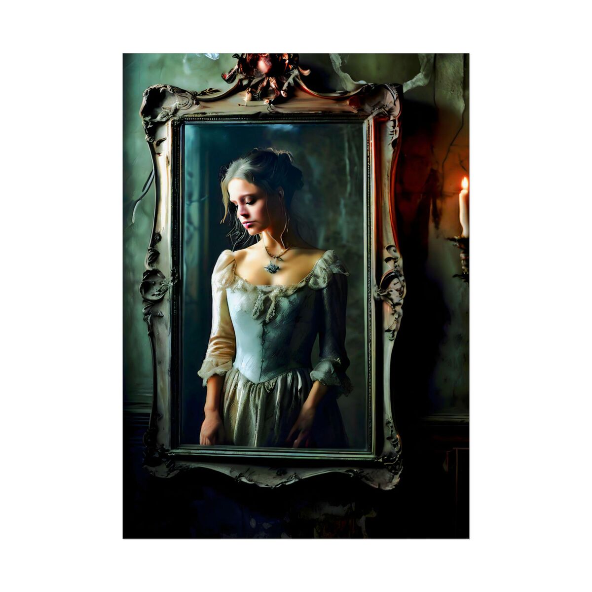 Enhance the ambiance of your living space with this captivating painting Print. This exquisite dark academia print features a mesmerizing girl trapped in the mirror, exuding an enchanting aura that will add a touch of mystique to any room. This is a print of the original painting, and is exclusive to Dreamland