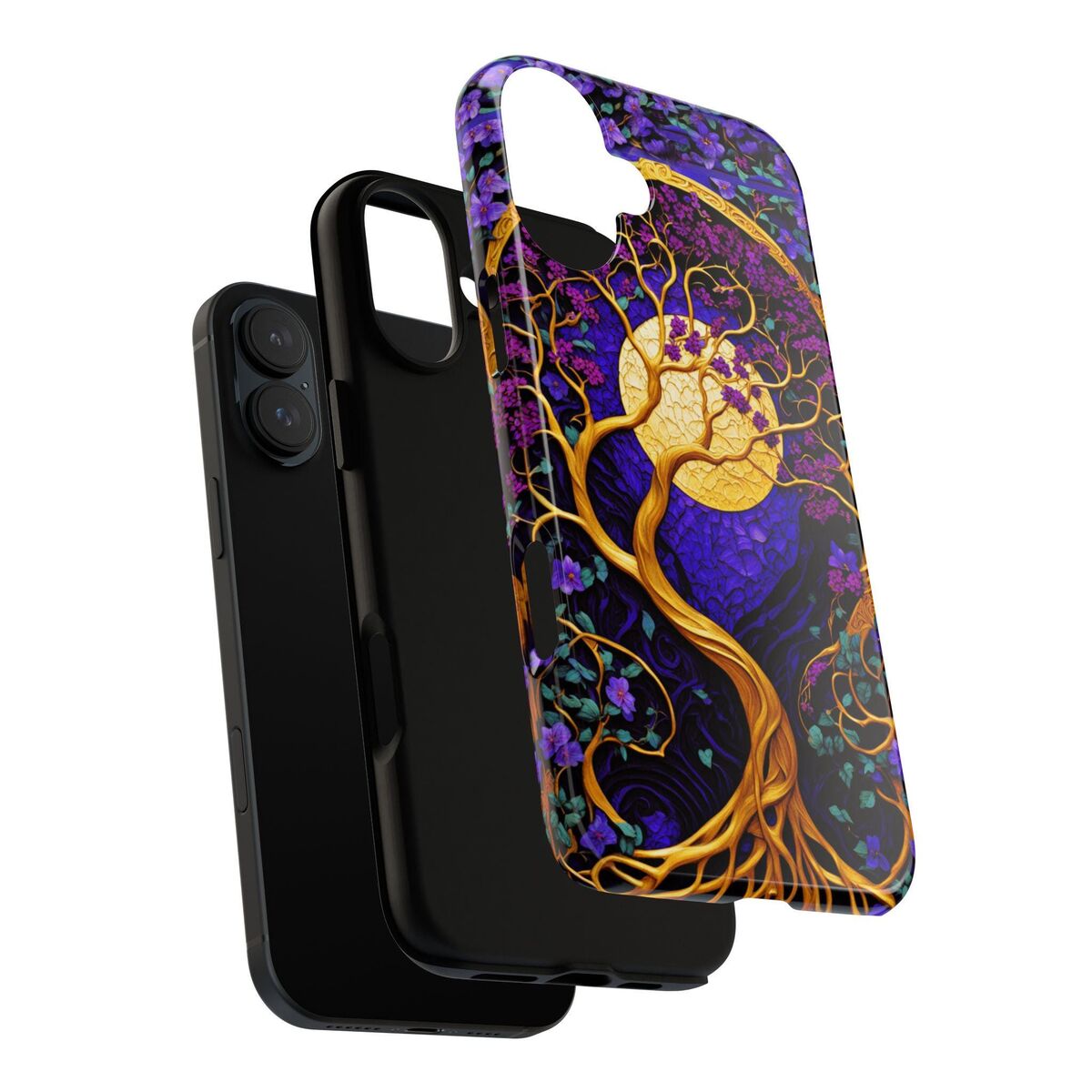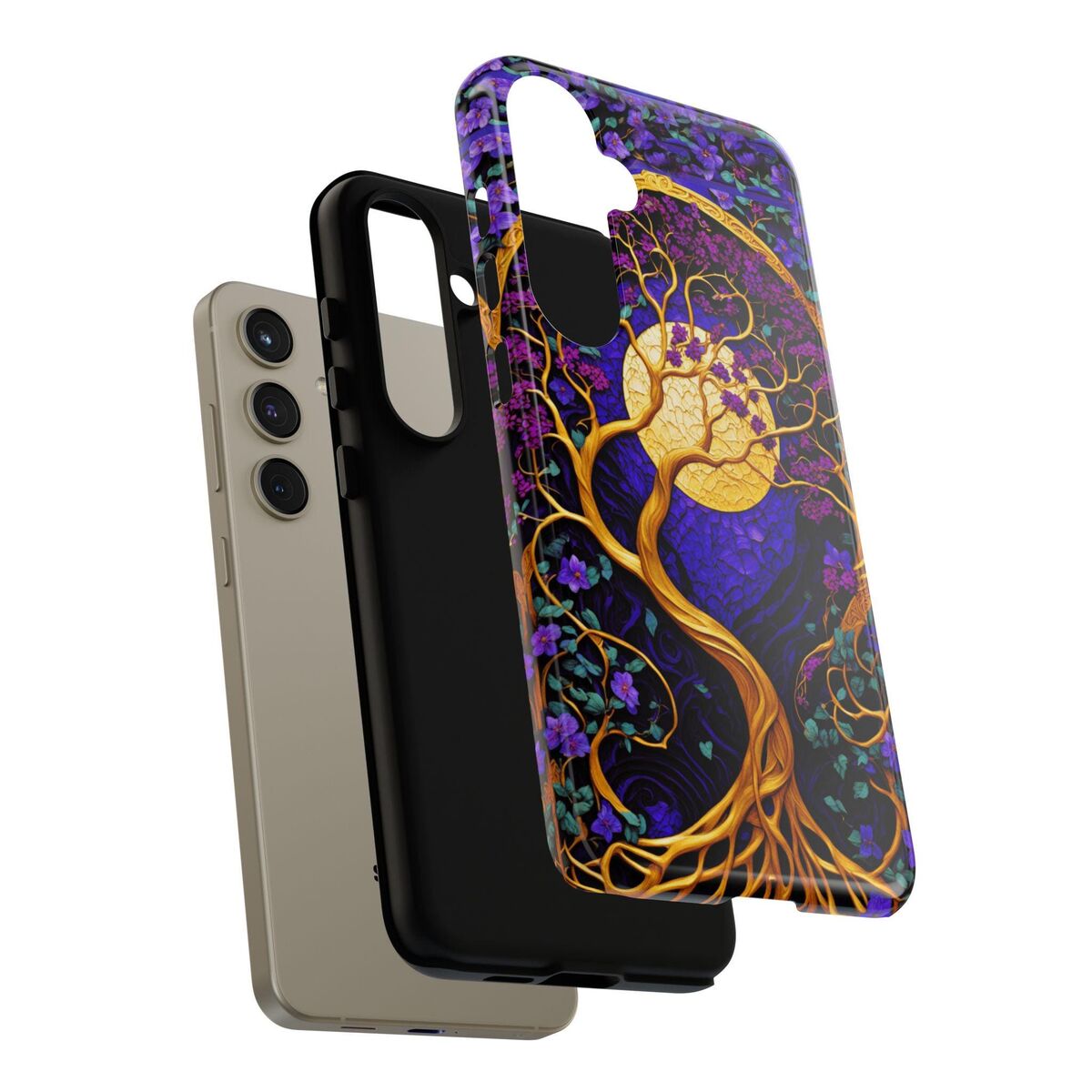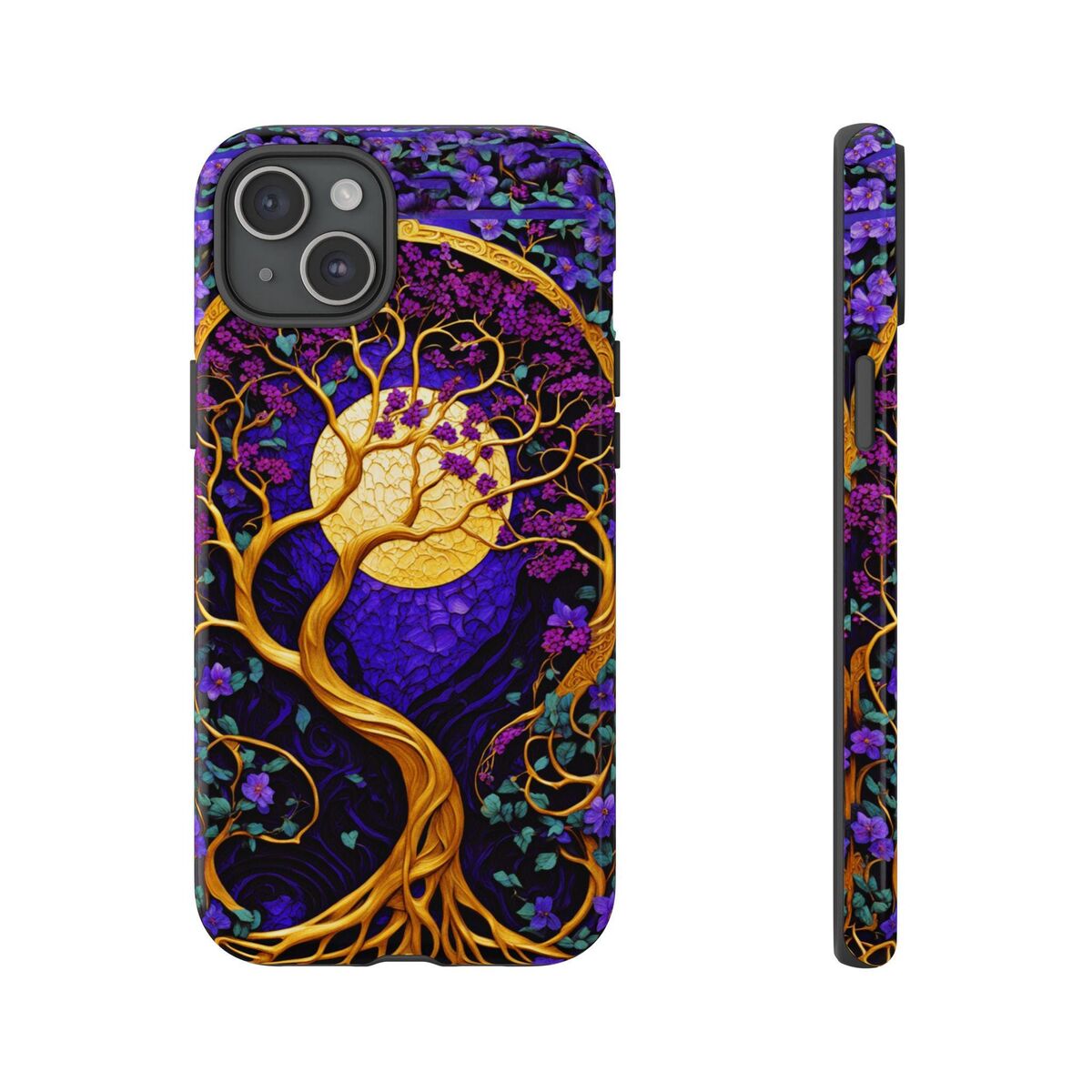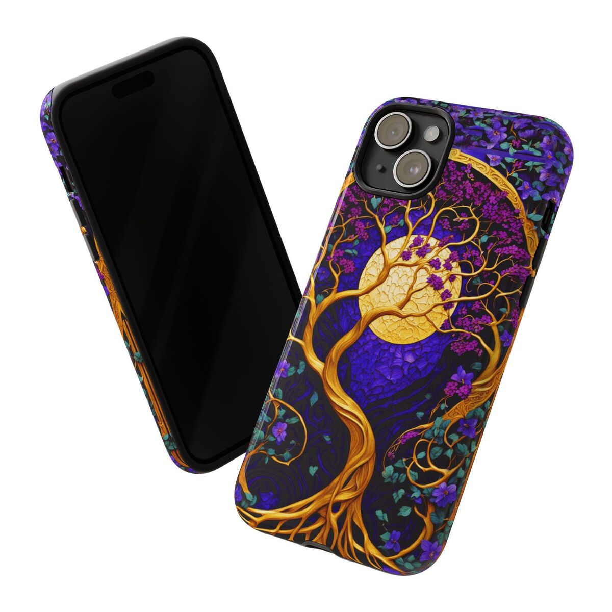 Moon Purple Phone Tough Case Faux Stained Glass Gold Tree Fits iphone 16 15 14 13 Pixel 8 Galaxy S24 S23 S 22 And More