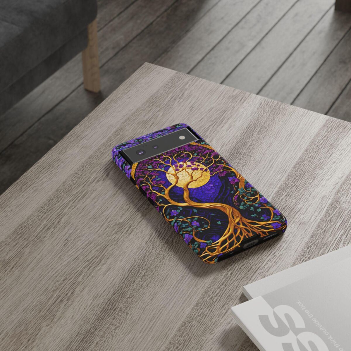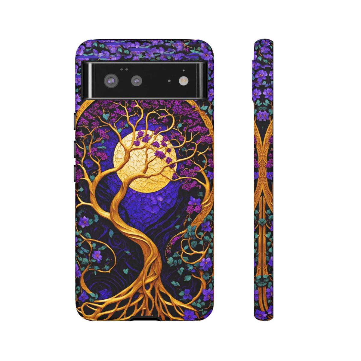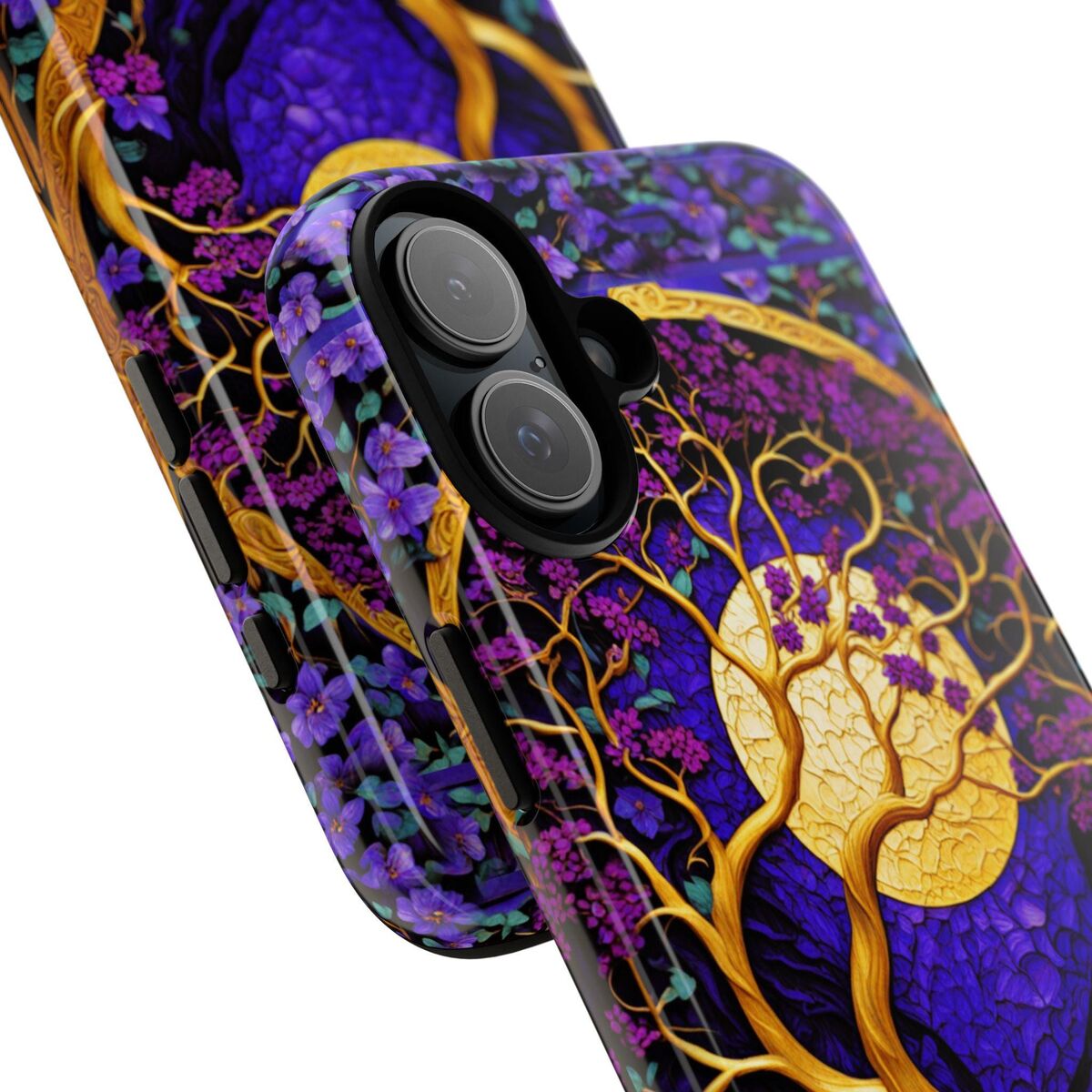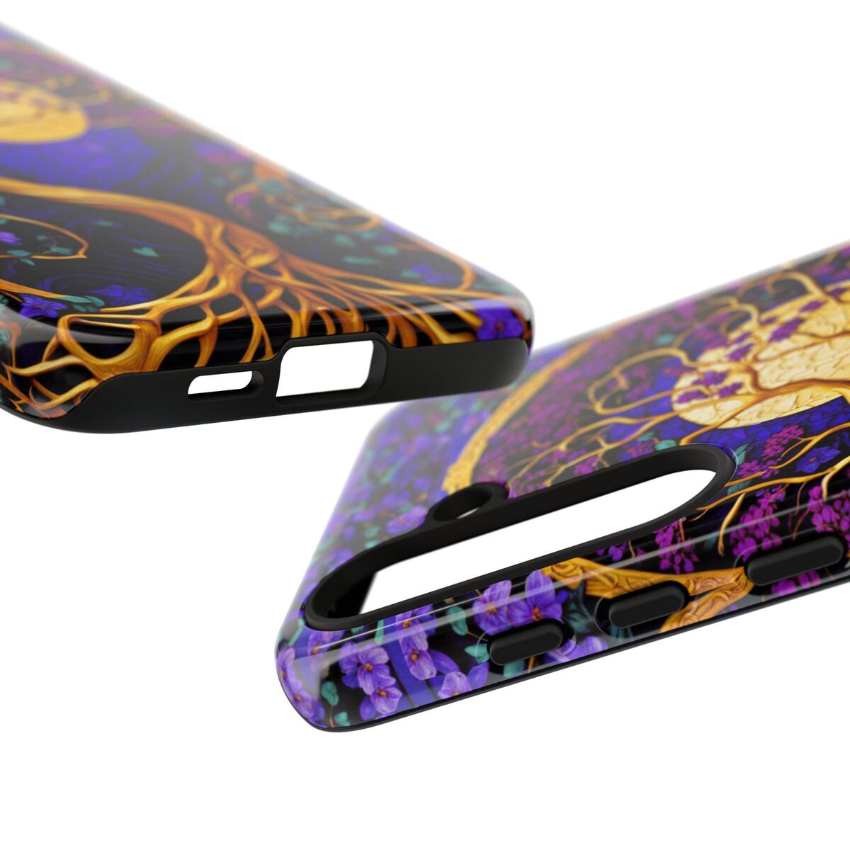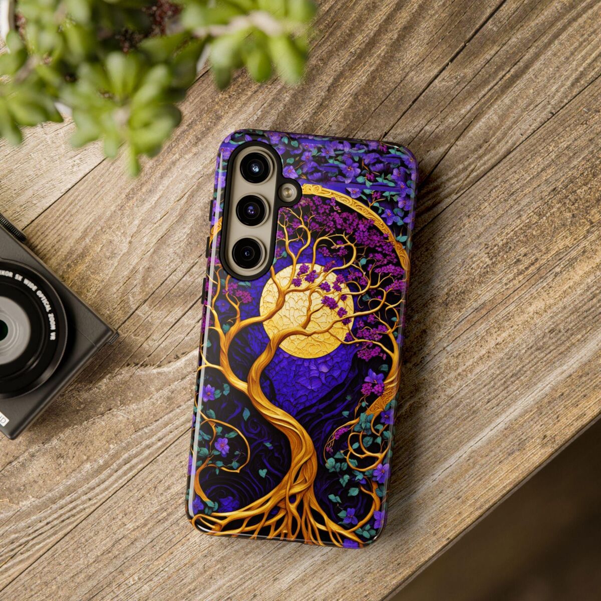 Moon Purple Phone Tough Case Faux Stained Glass Gold Tree Fits iphone 16 15 14 13 Pixel 8 Galaxy S24 S23 S 22 And More