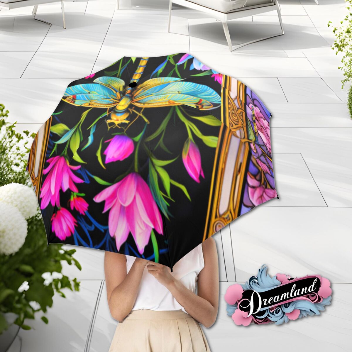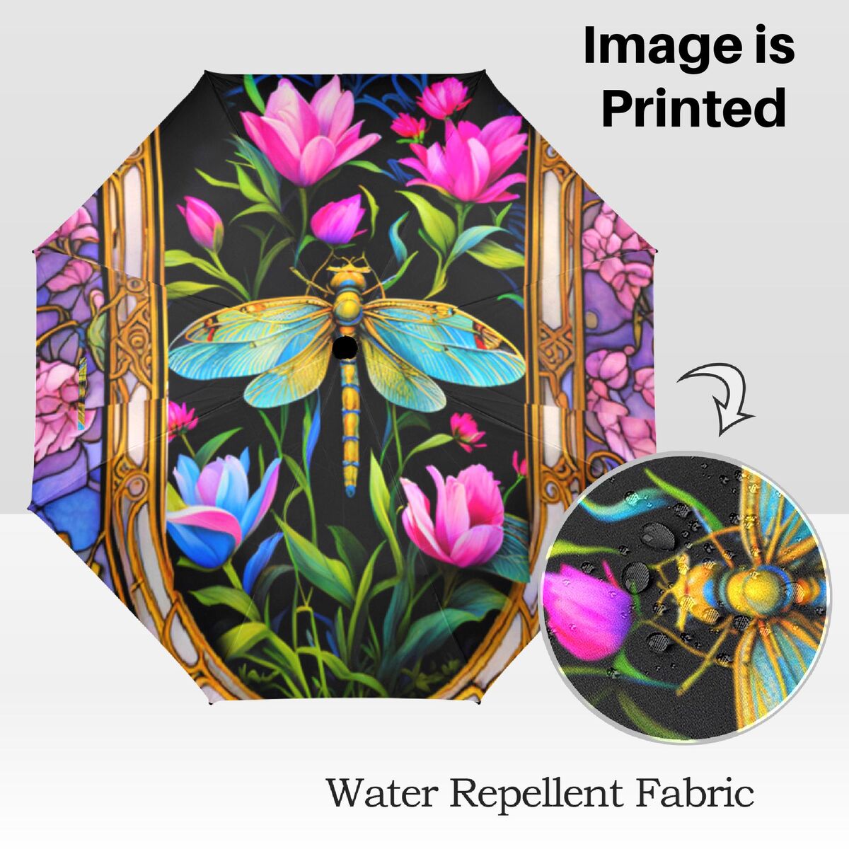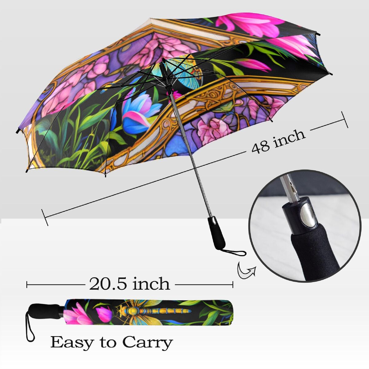 Moth Umbrella Romantic Art Nouveau Floral Flower Blossoms Faux Stained Glass Parasol Semi-Automatic Waterproof Foldable Umbrella