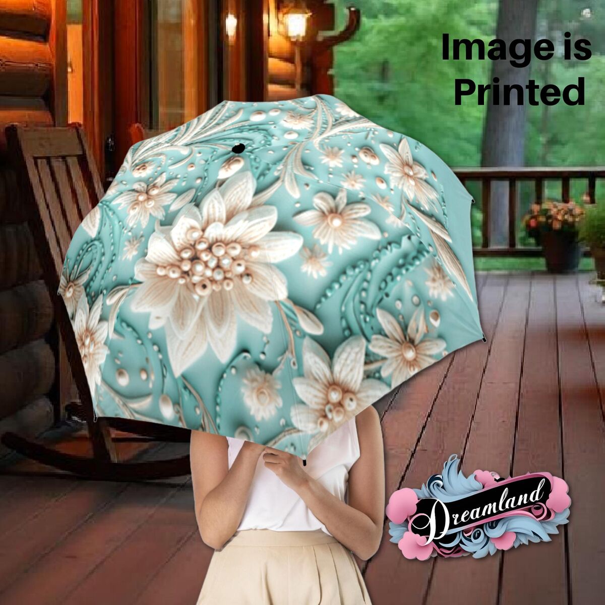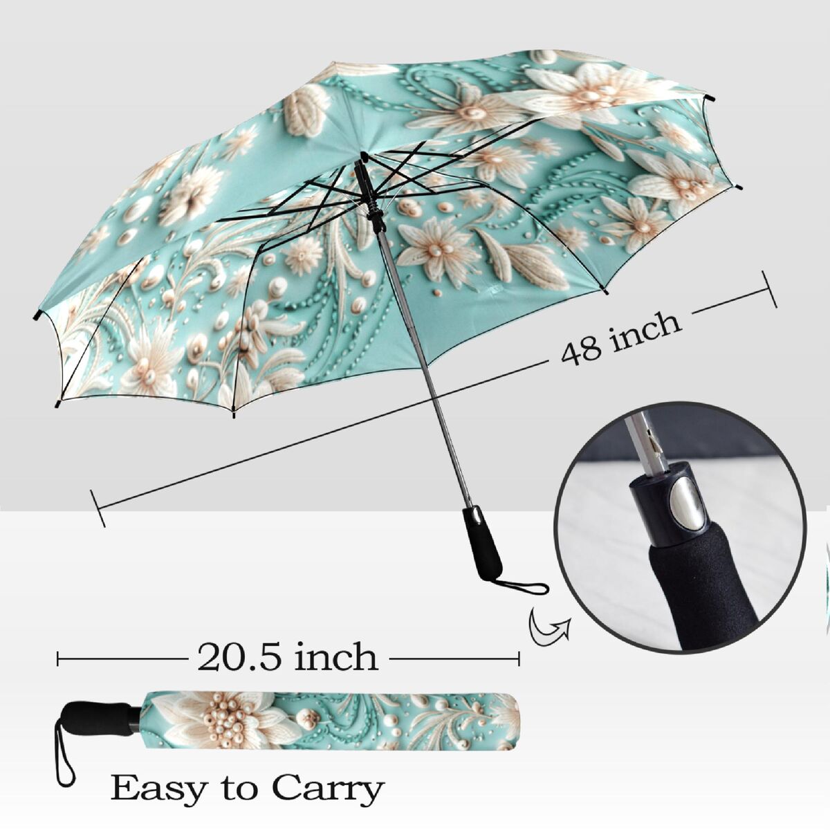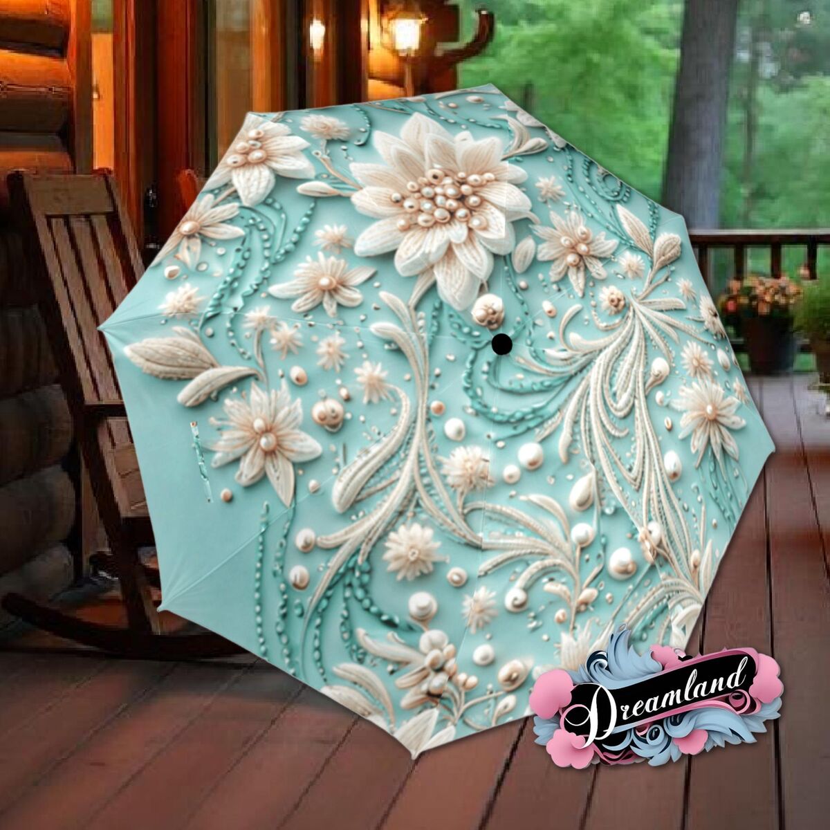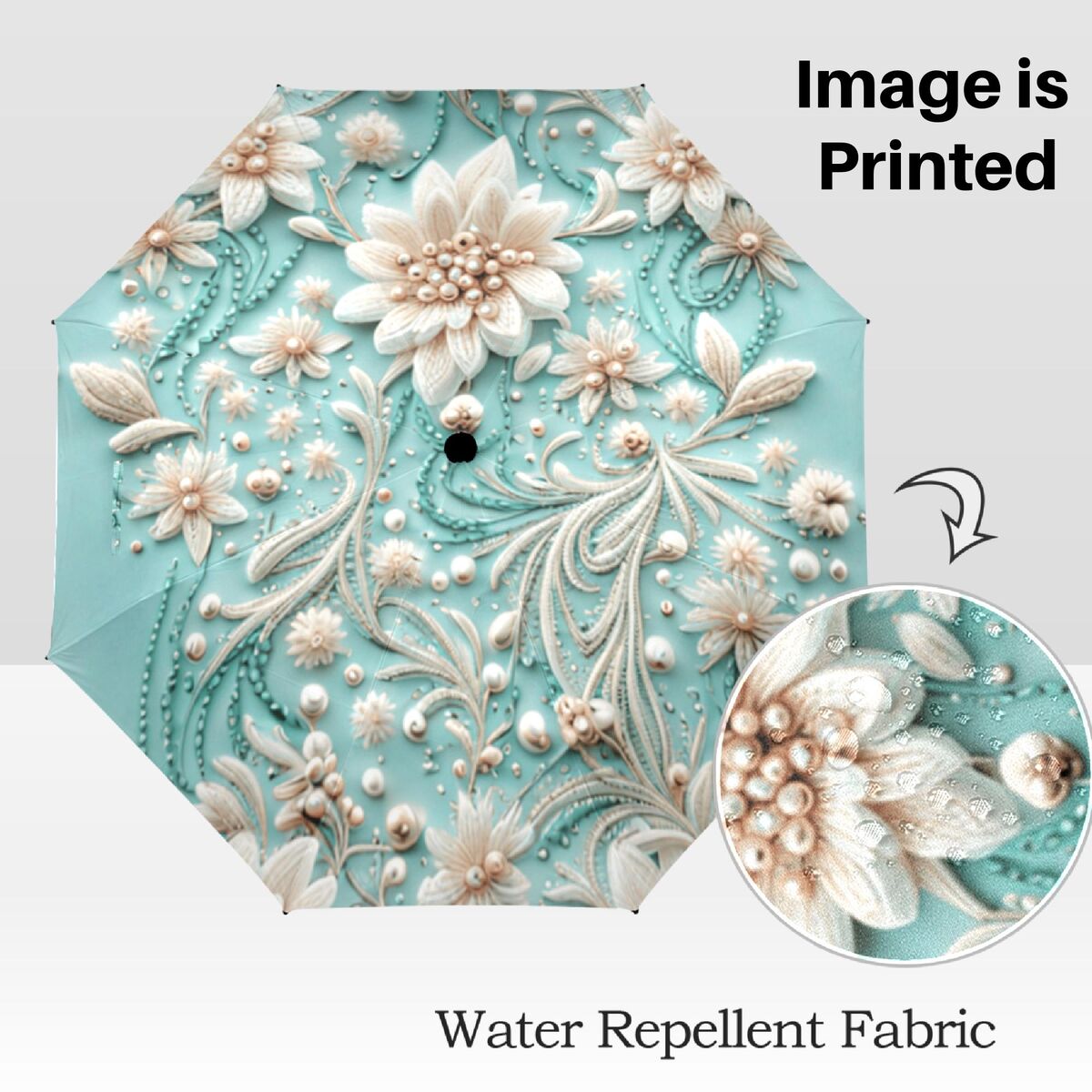 Pastel Blue Umbrella Romantic Flower Floral Art Nouveau Style Printed Faux Floral Lace Parasol Semi-Automatic Waterproof Foldable Umbrella