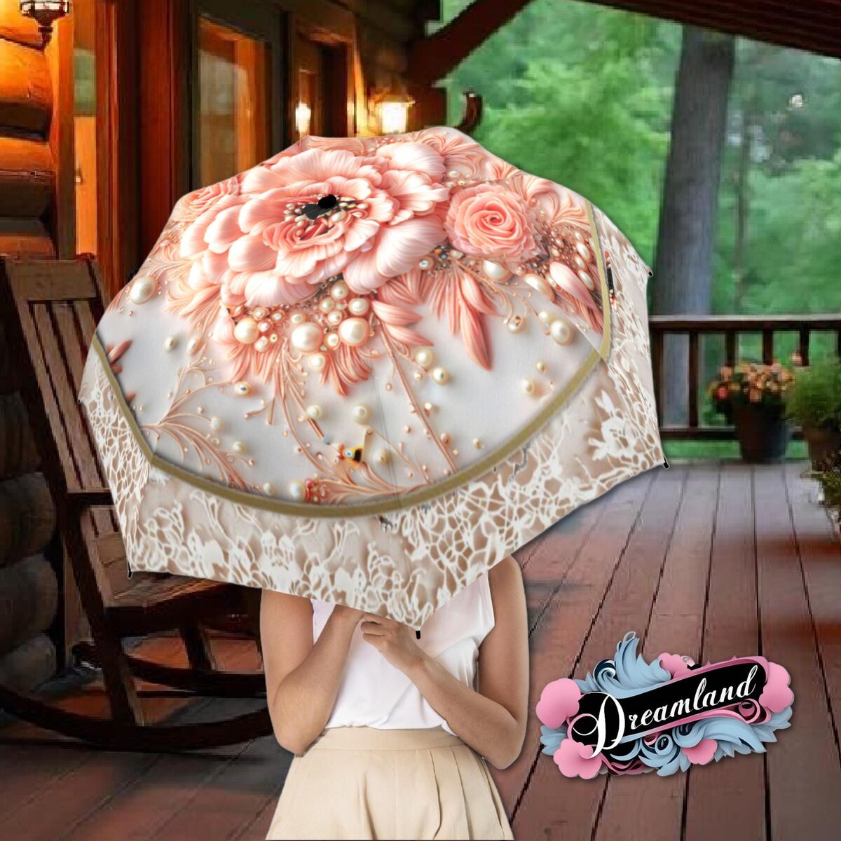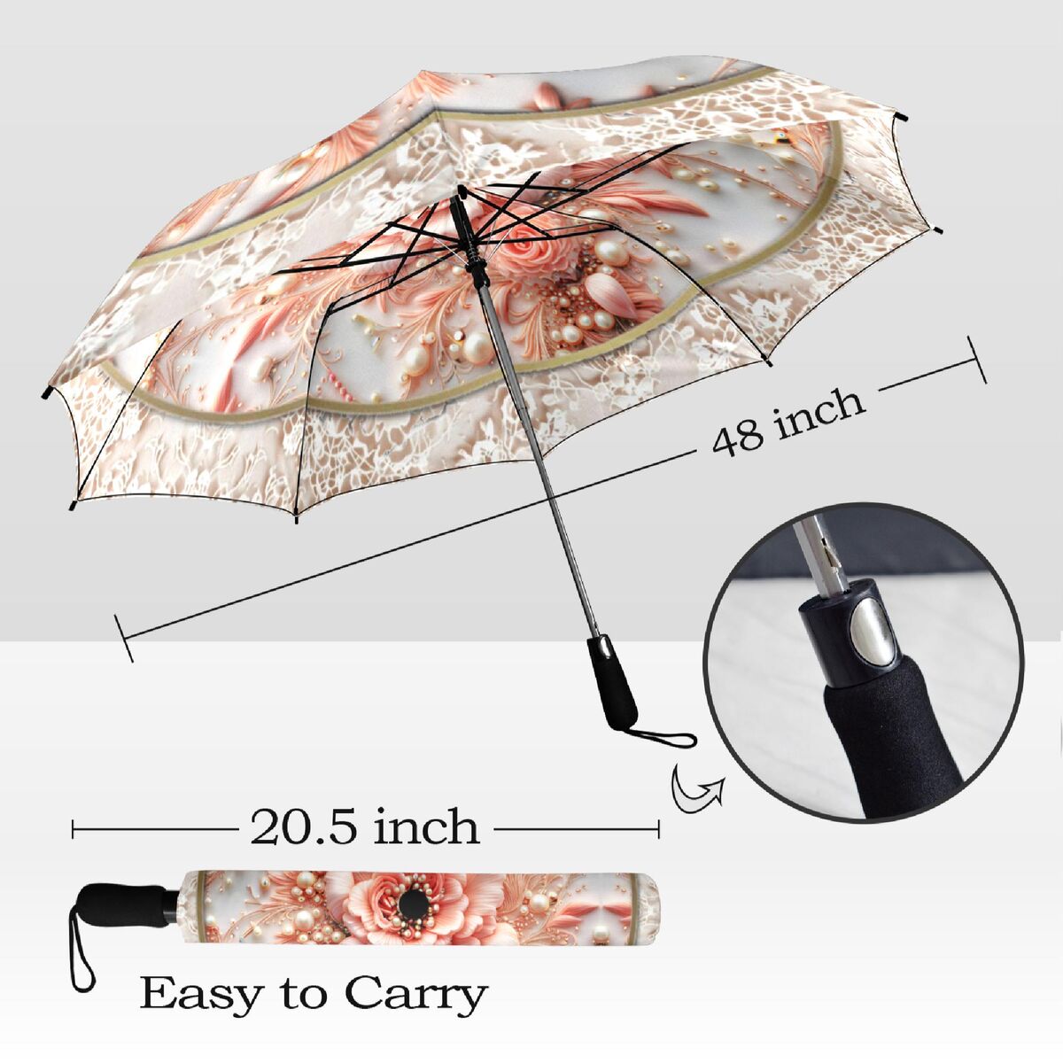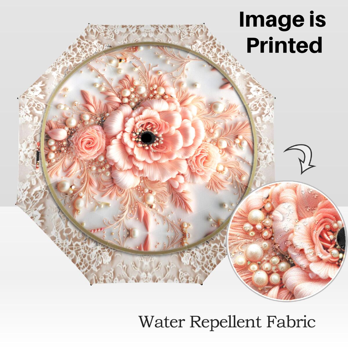 Peach Cream Flower Umbrella Unique Flower Art Nouveau Style Printed Faux Flower Lace Parasol Semi-Automatic Waterproof Foldable Umbrella