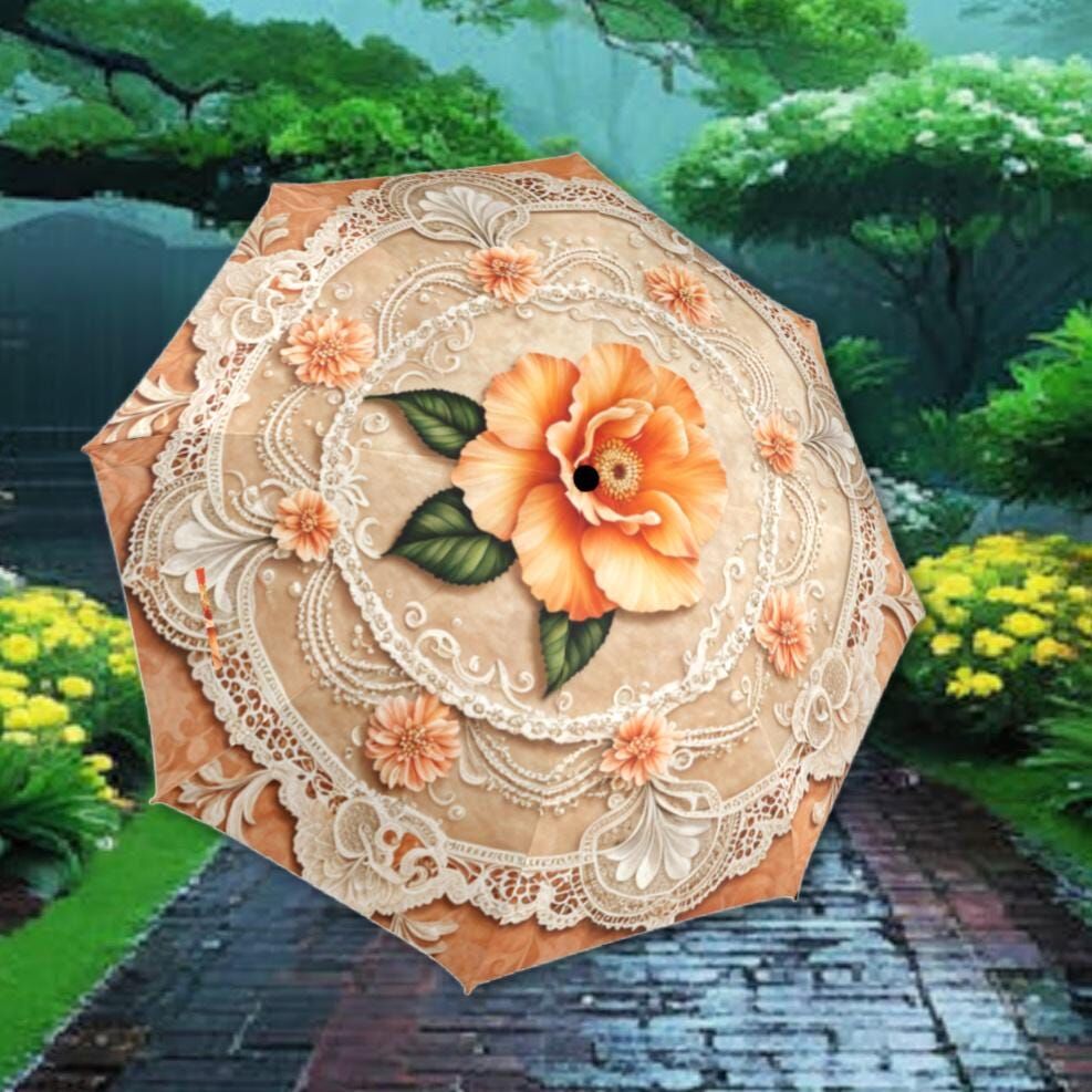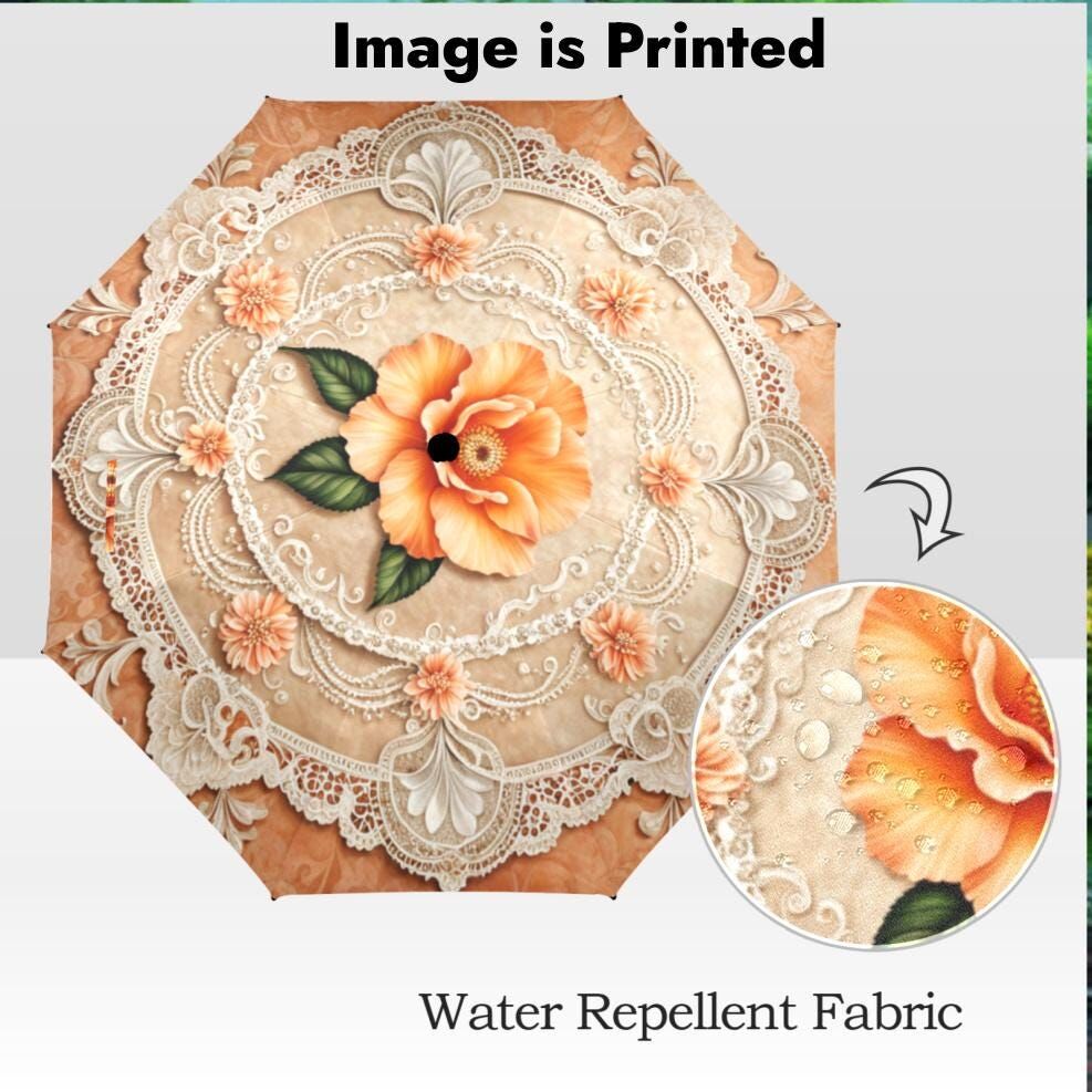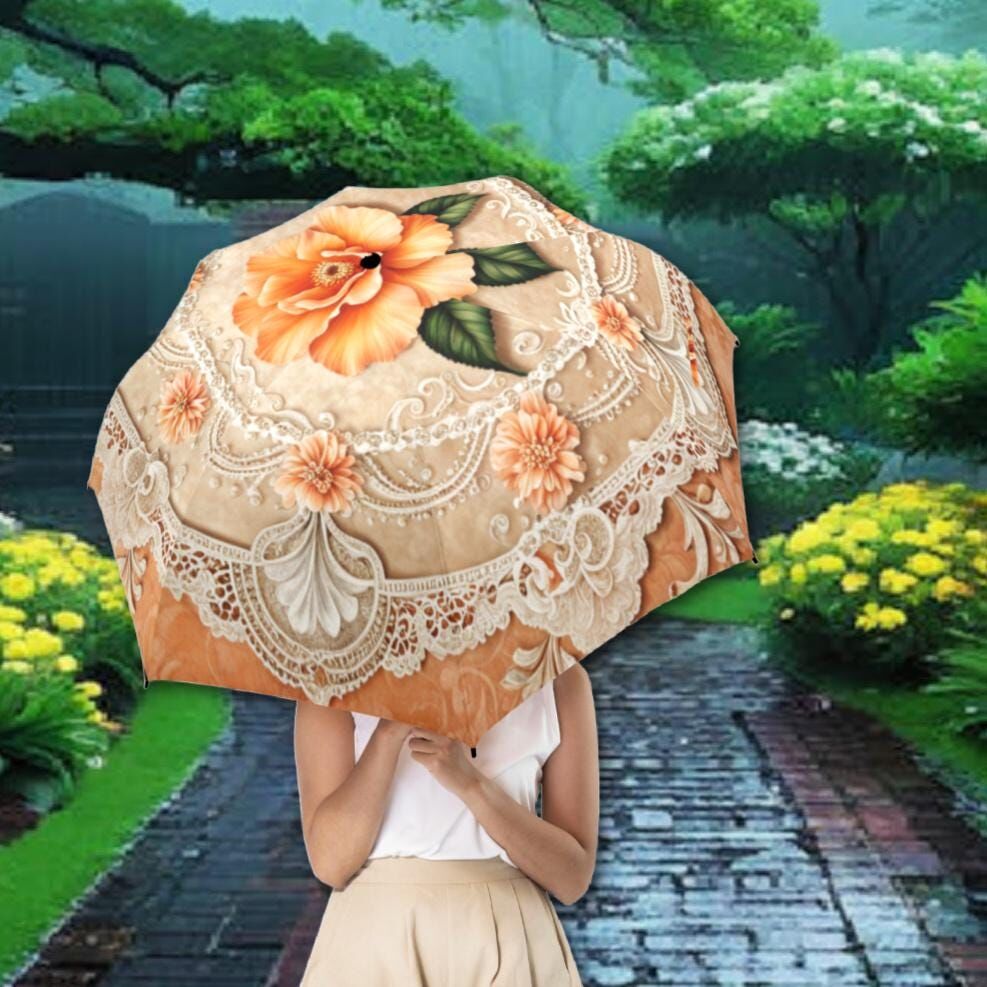 Cream Peach Romantic Umbrella Victorian Inspired Boho Flower Parasol Semi-Automatic Waterproof Foldable Umbrella