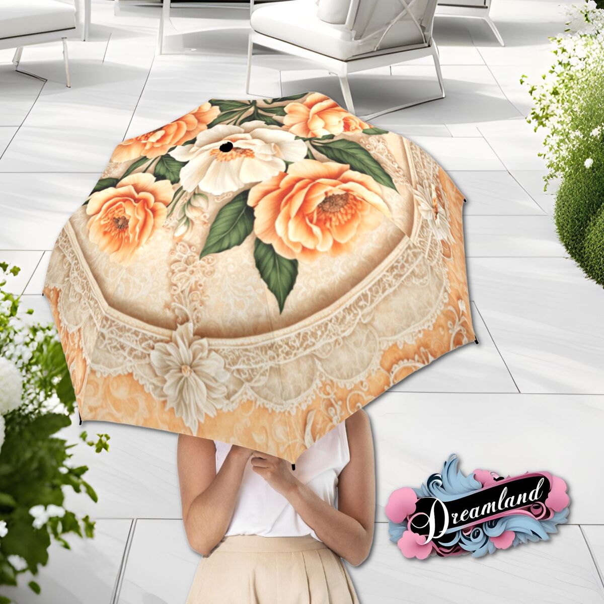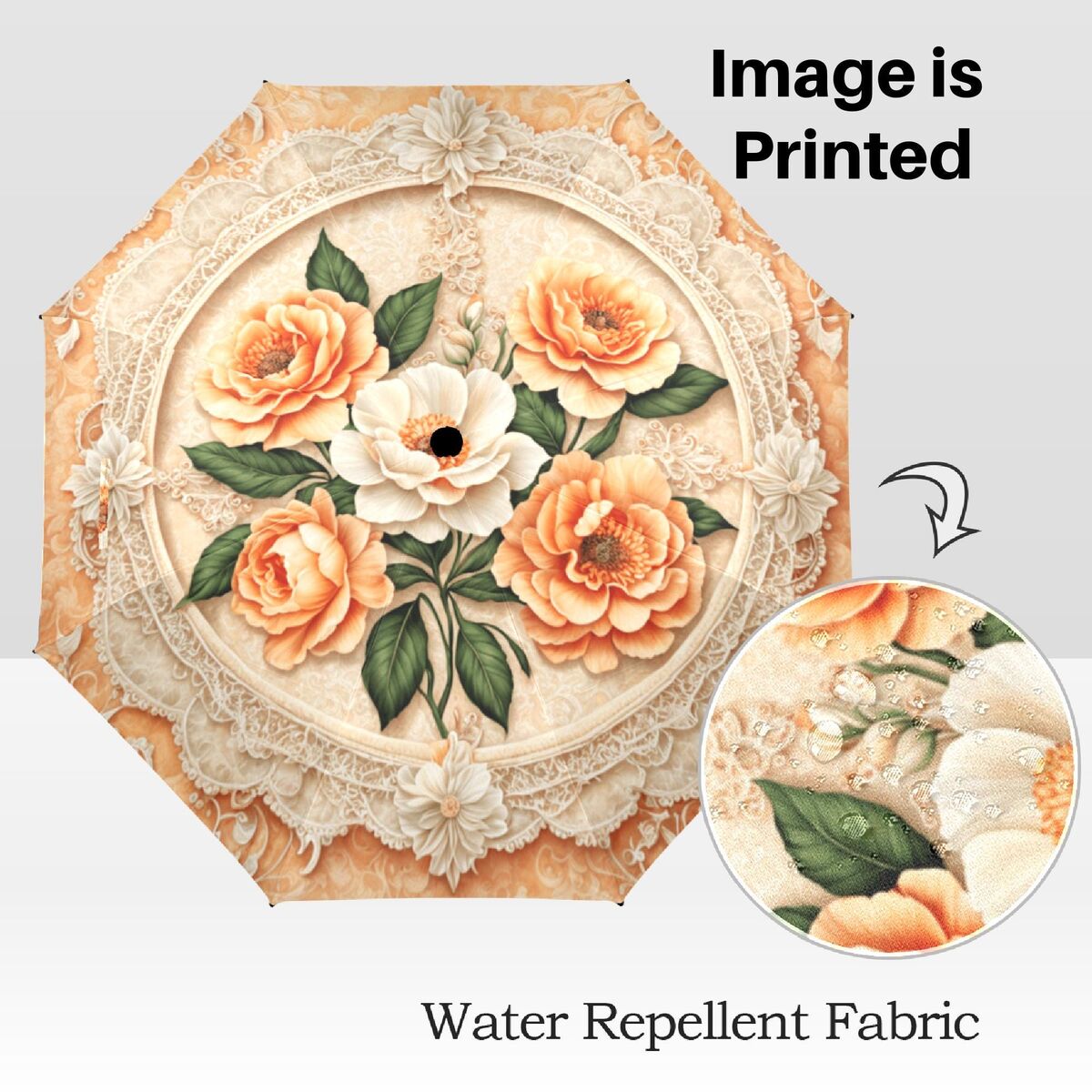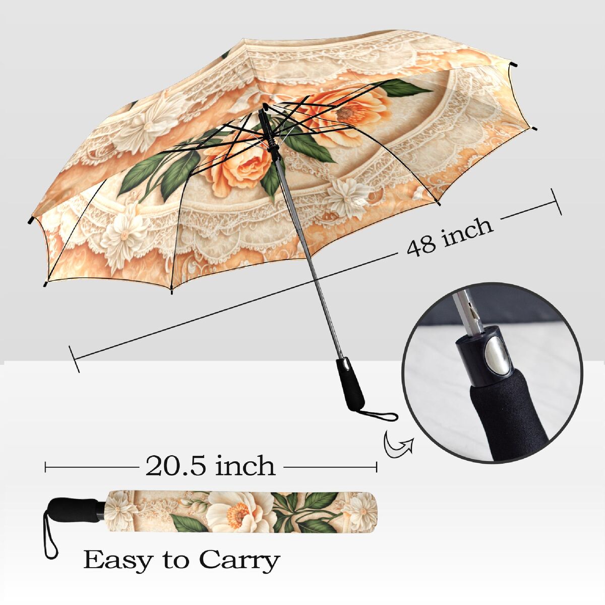 Peach Rose Flower Umbrella Romantic Art Nouveau Floral Blossoms Faux Stained Glass Parasol Semi-Automatic Waterproof Foldable Umbrella