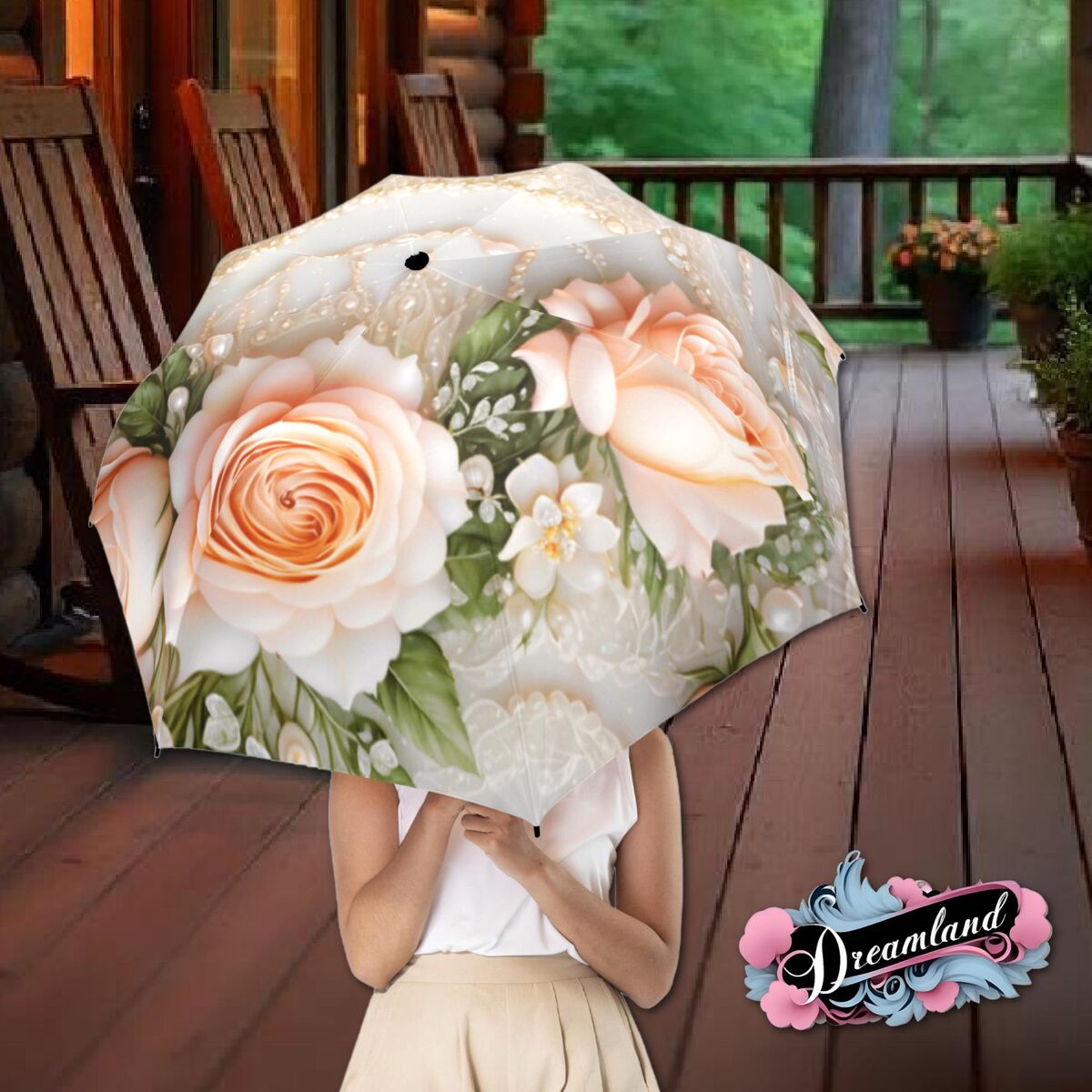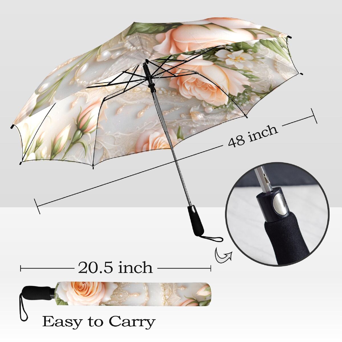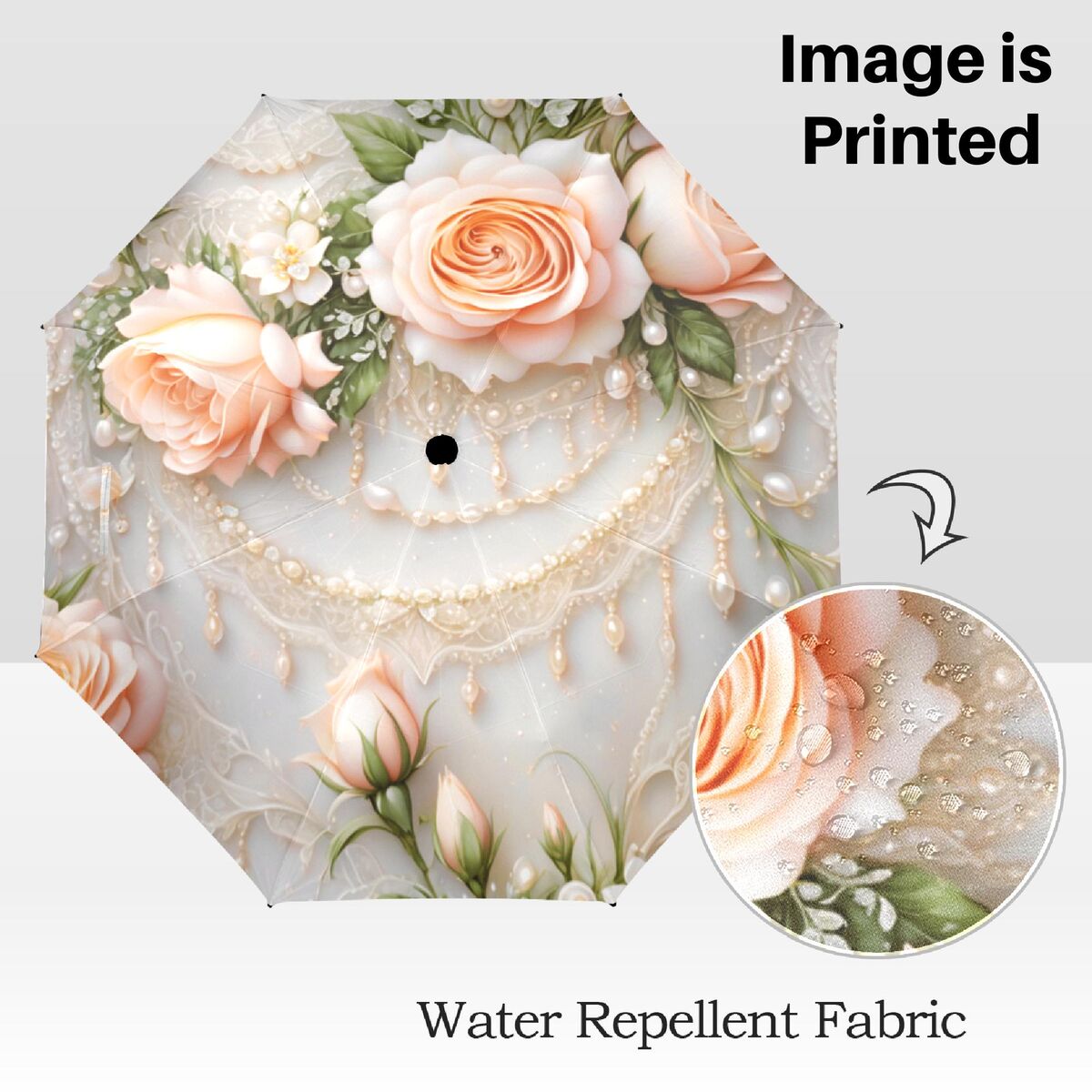 Peach Rose Umbrella Flower Floral Victorian Style Printed Faux Lsce Parasol Semi-Automatic Waterproof Foldable Umbrella