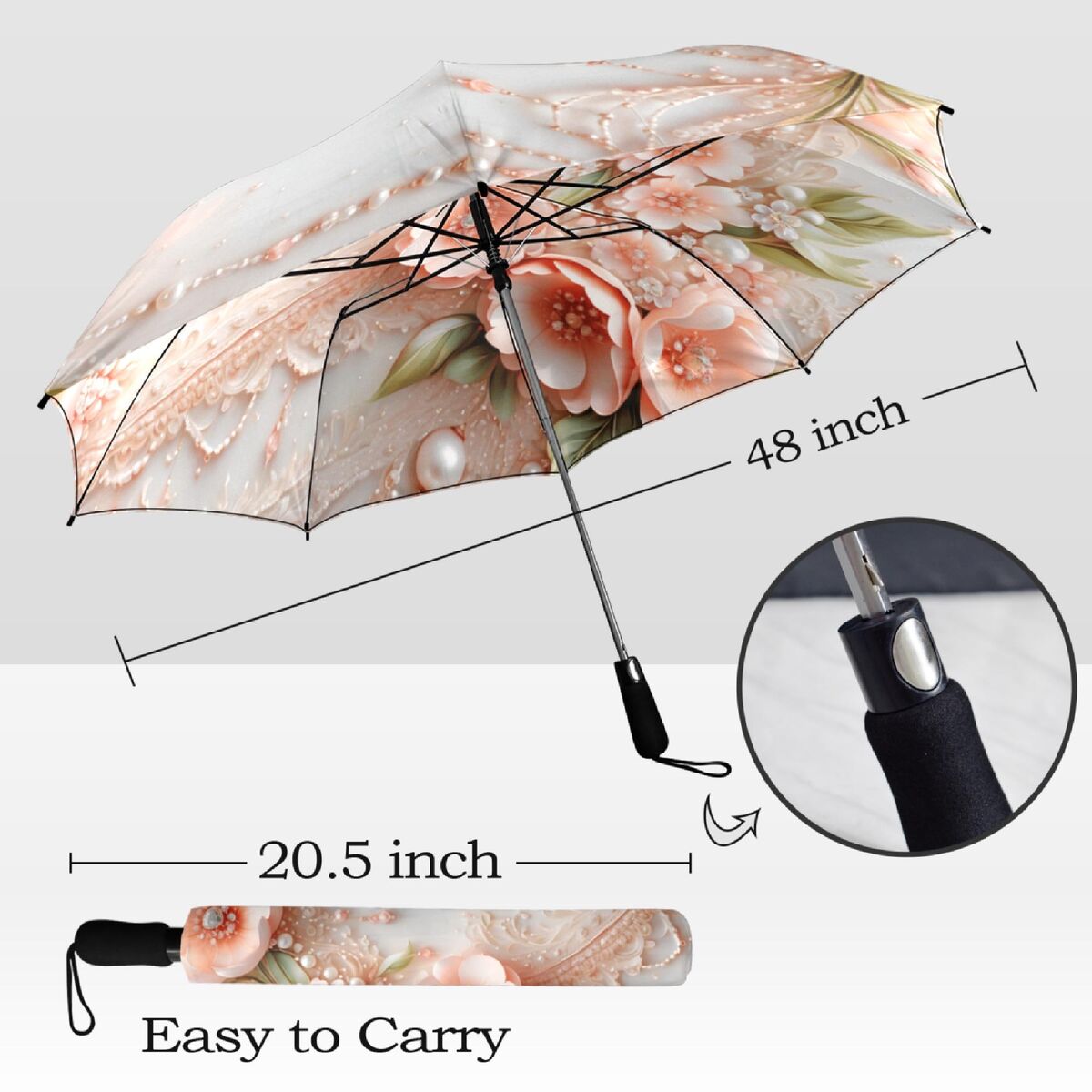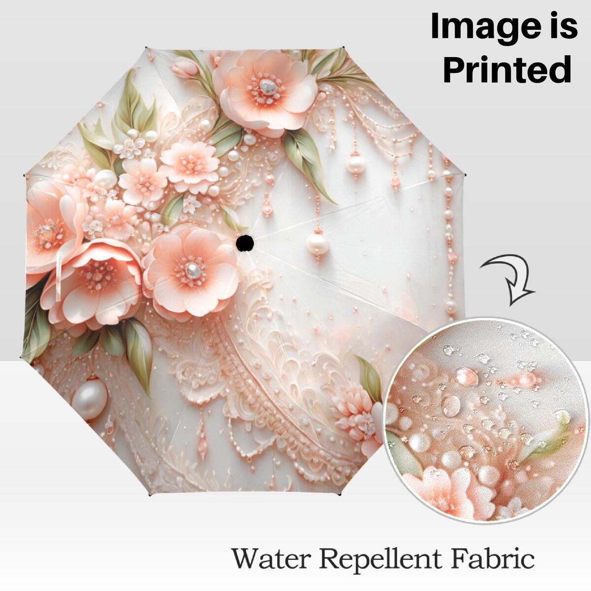 Peach Sakura Umbrella Flower Floral Victorian Style Printed Faux Lace Parasol Semi-Automatic Waterproof Foldable Umbrella