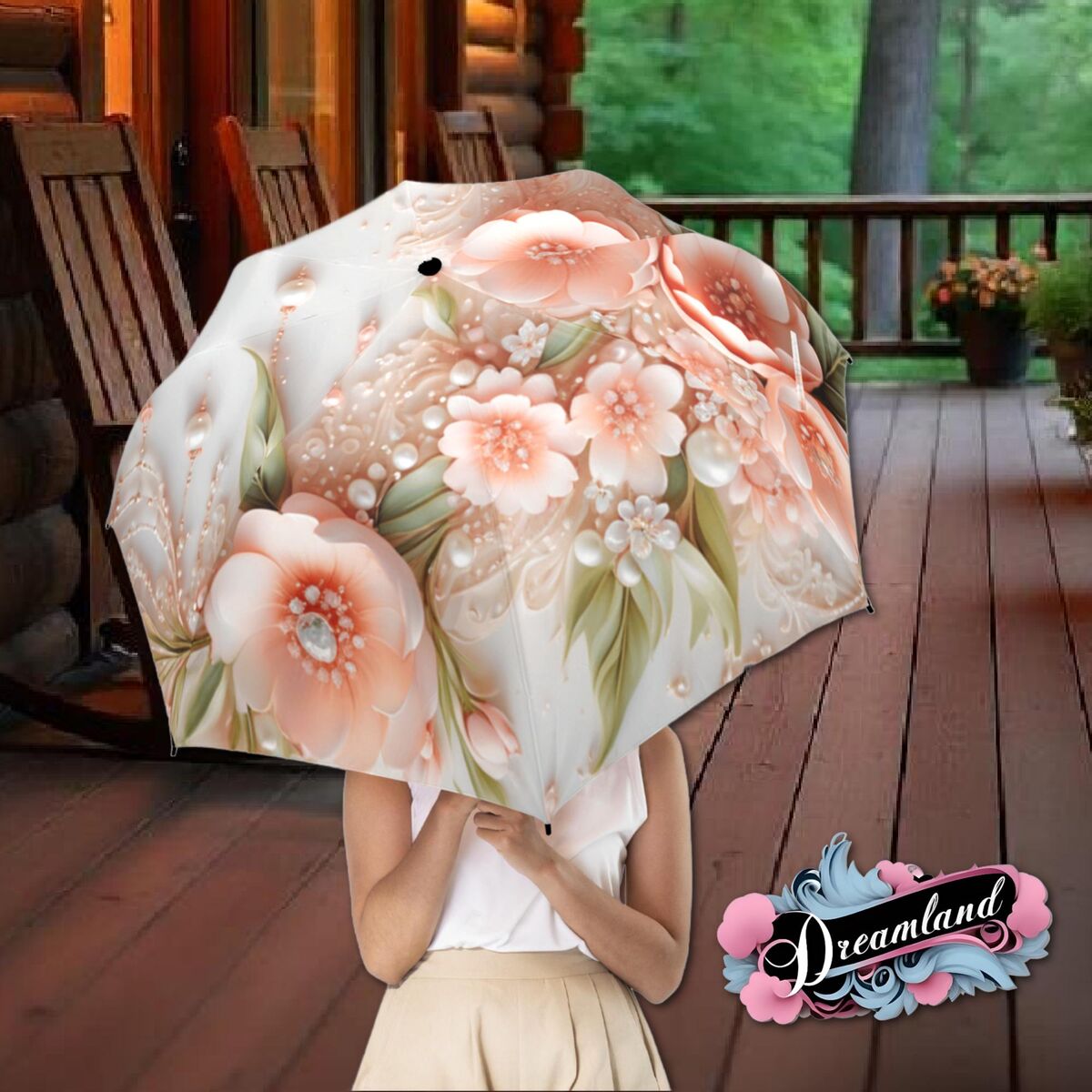 Beige Cream Flower Umbrella Art Nouveau Printed Floral Parasol Semi-Automatic Waterproof Foldable Umbrella