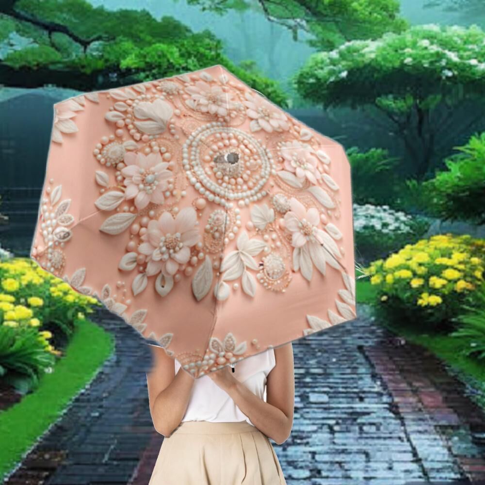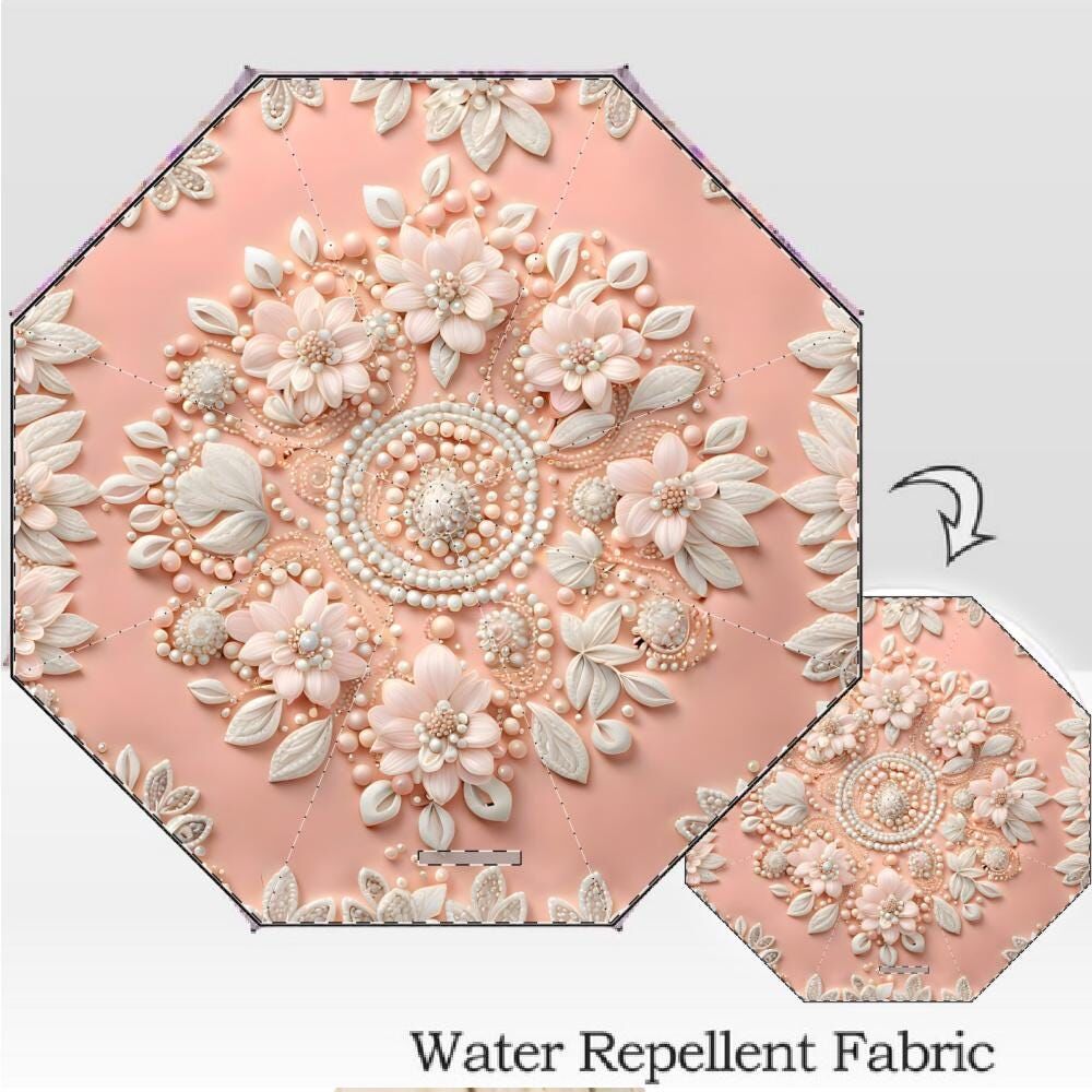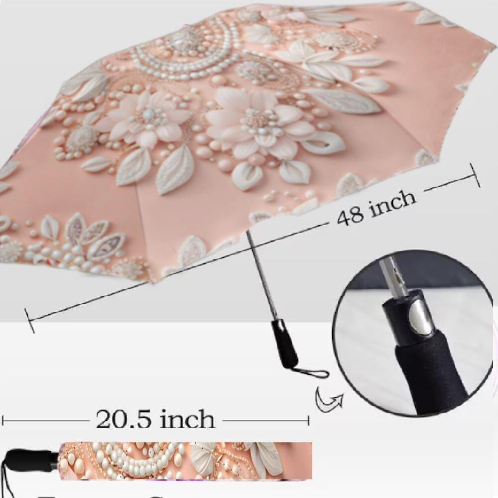 Unique Umbrella Art Nouveau Style Printed Faux Cream Peach Flowers Beads Parasol Semi-Automatic Waterproof Foldable Umbrella