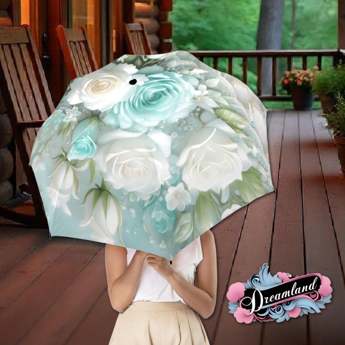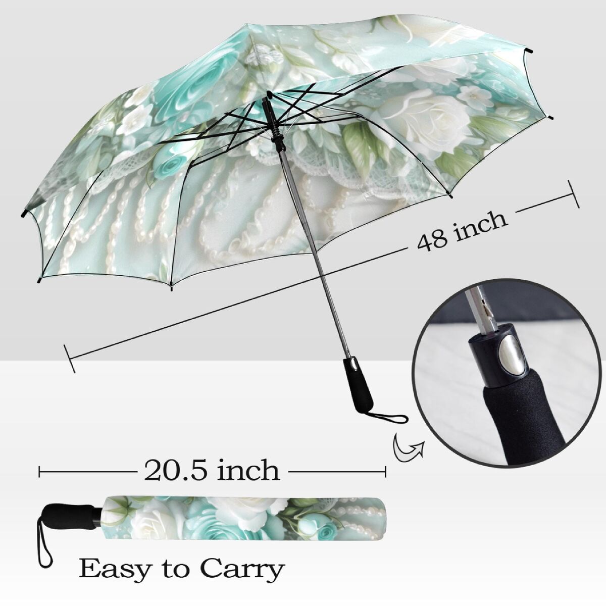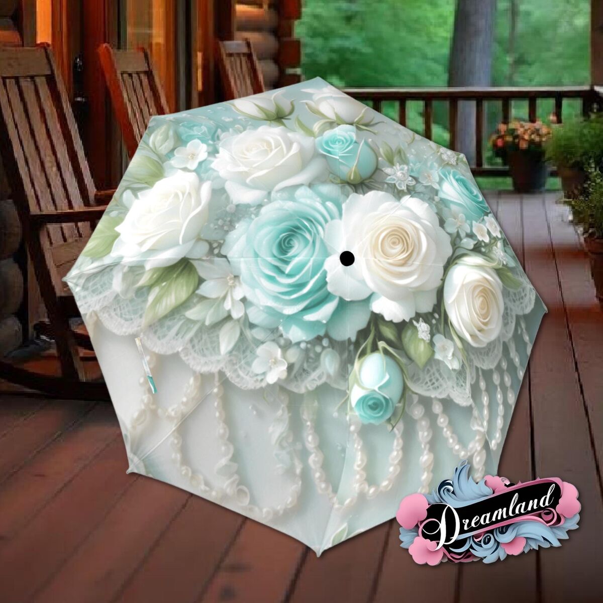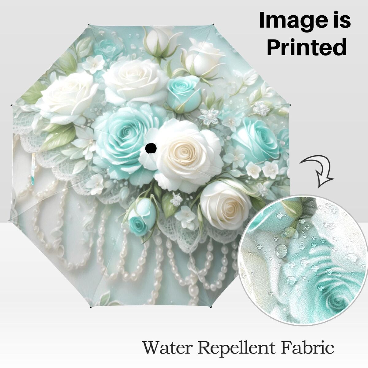 Pearls And Teal Roses Umbrella Flower Floral Victorian Style Printed Faux Lace Parasol Semi-Automatic Waterproof Foldable Umbrella