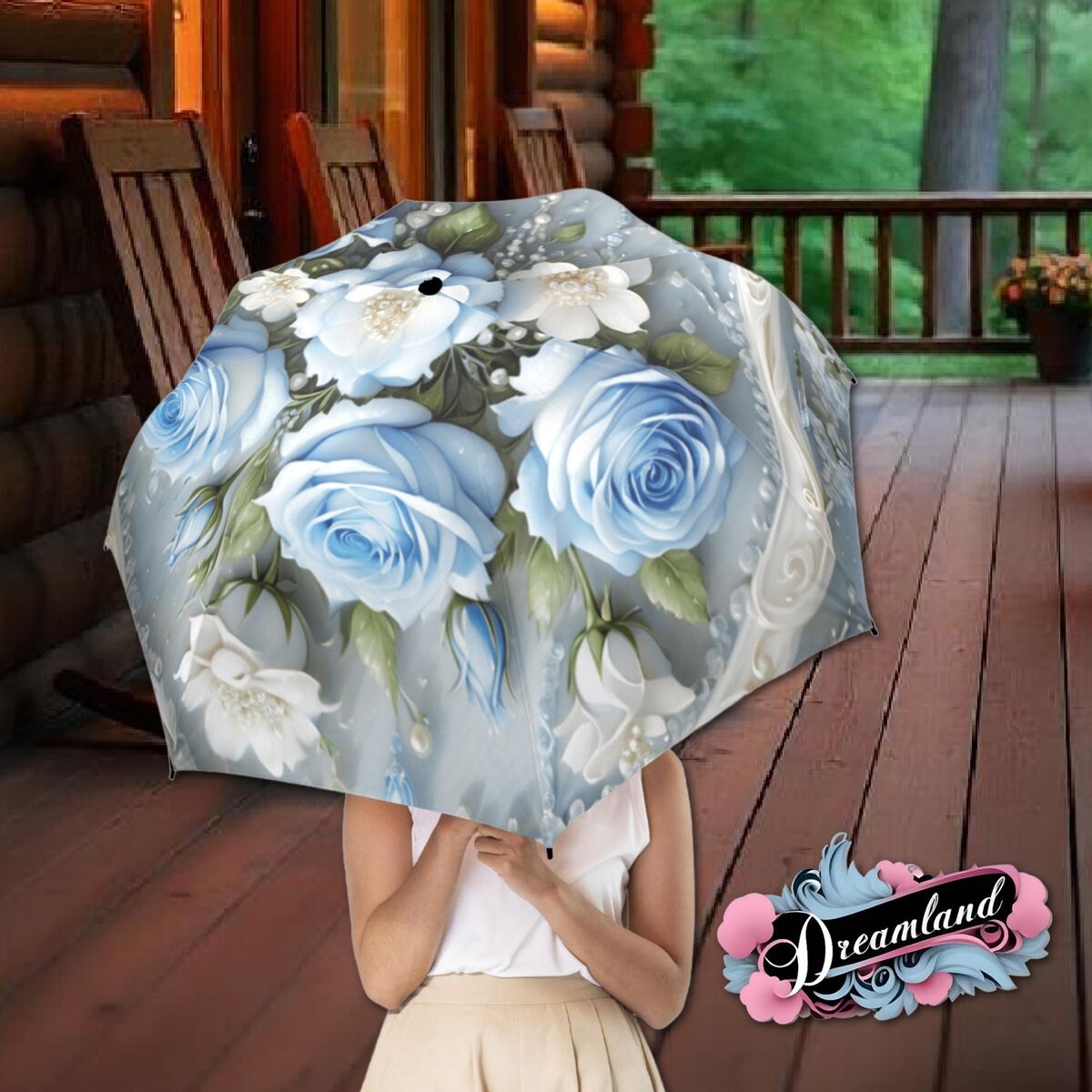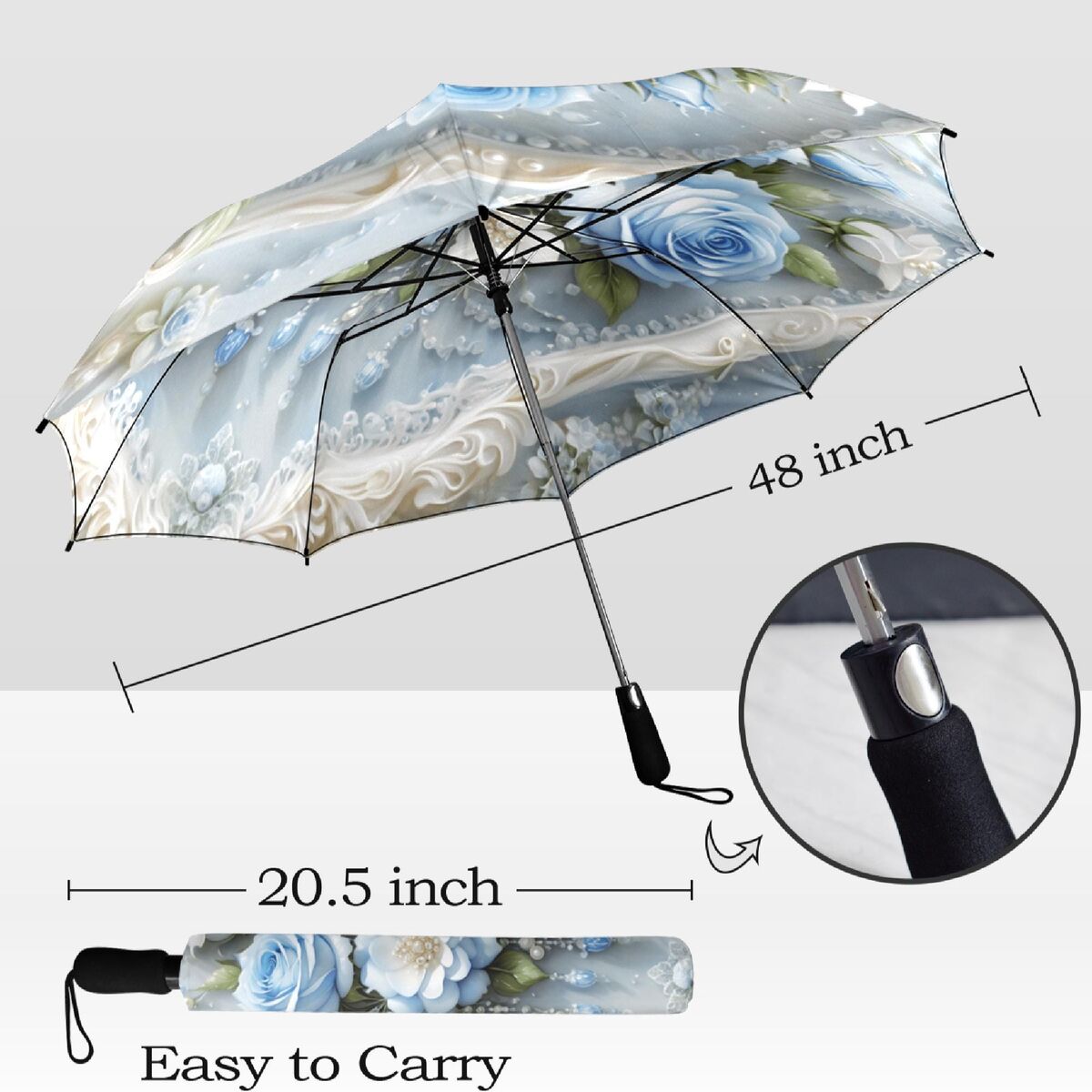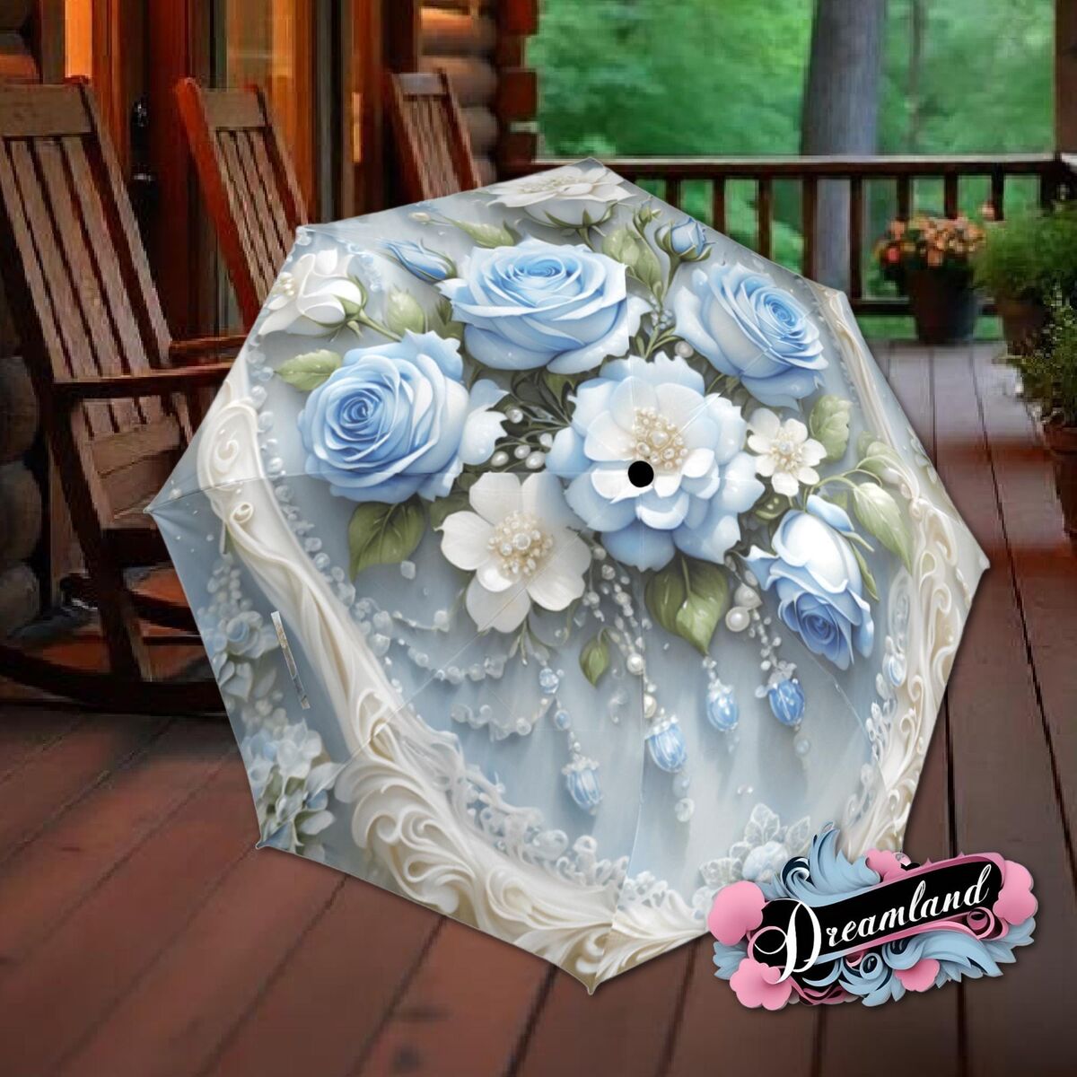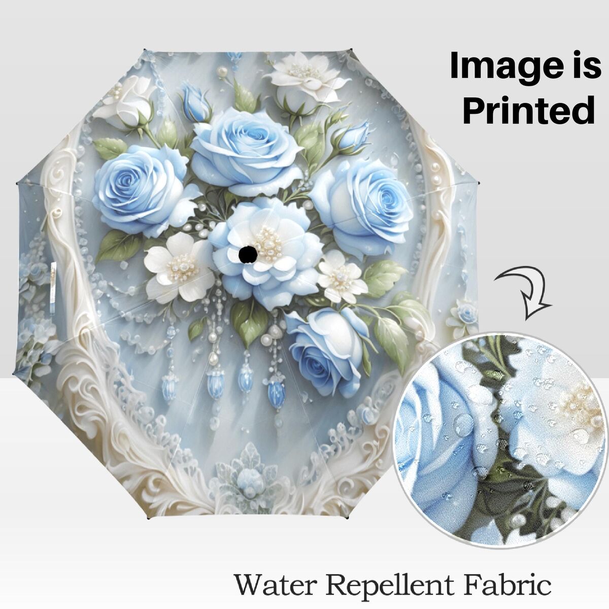 Pearls Blue Roses Umbrella Flower Floral Victorian Style Printed Faux Lace Parasol Semi-Automatic Waterproof Foldable Umbrella
