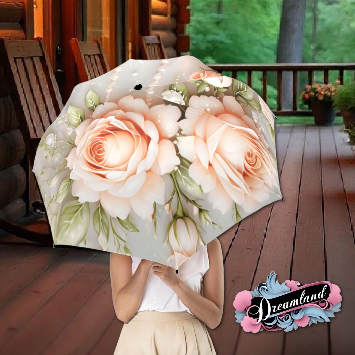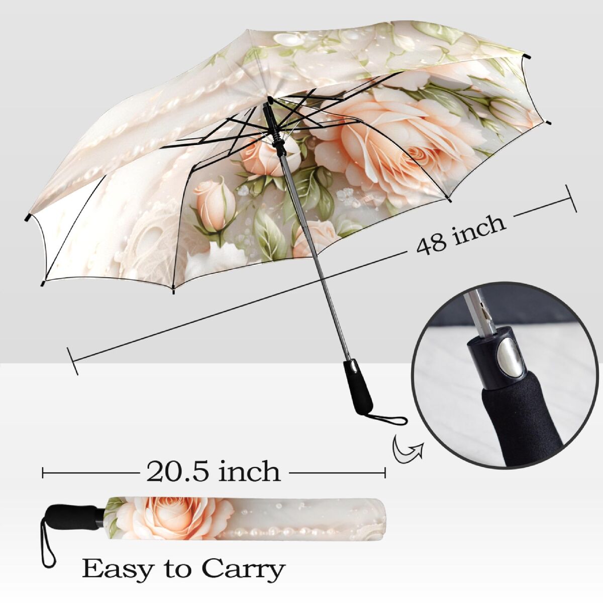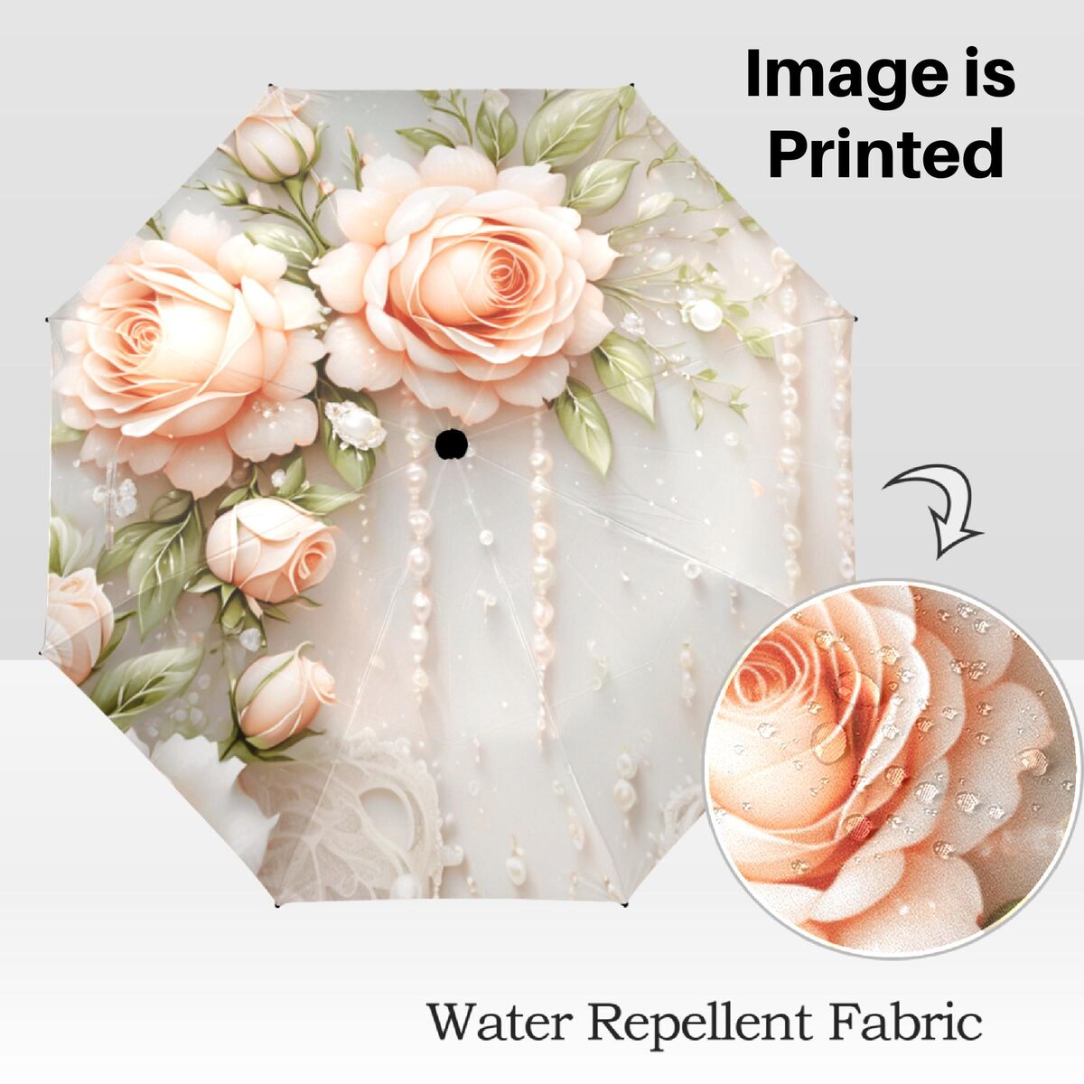 Pearls Roses Umbrella Flower Floral Victorian Style Printed Faux Lace Roses Parasol Semi-Automatic Waterproof Foldable Umbrella
