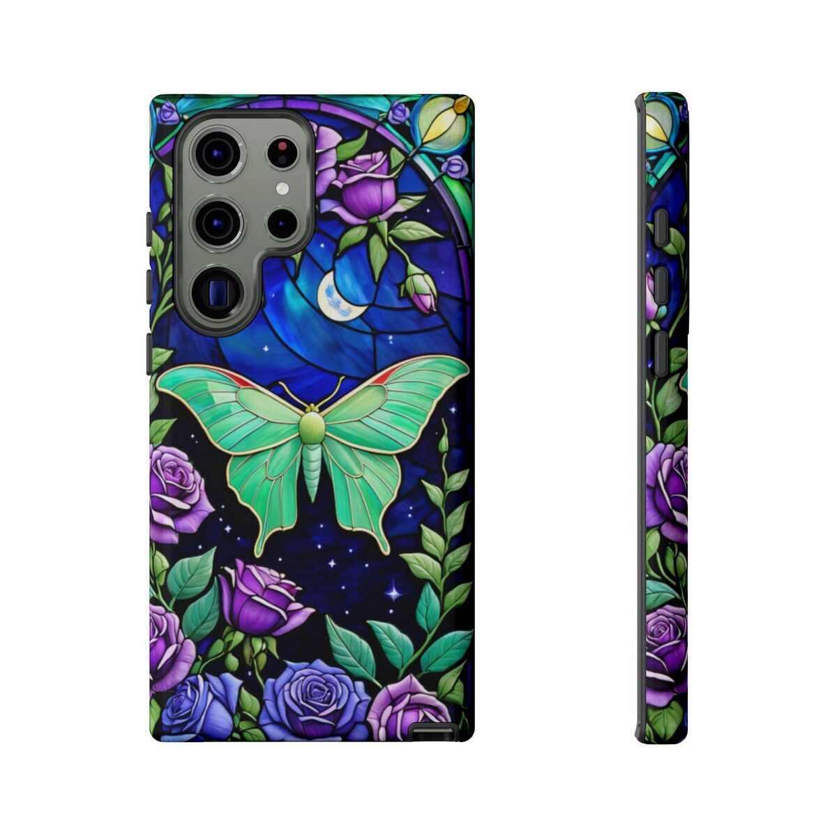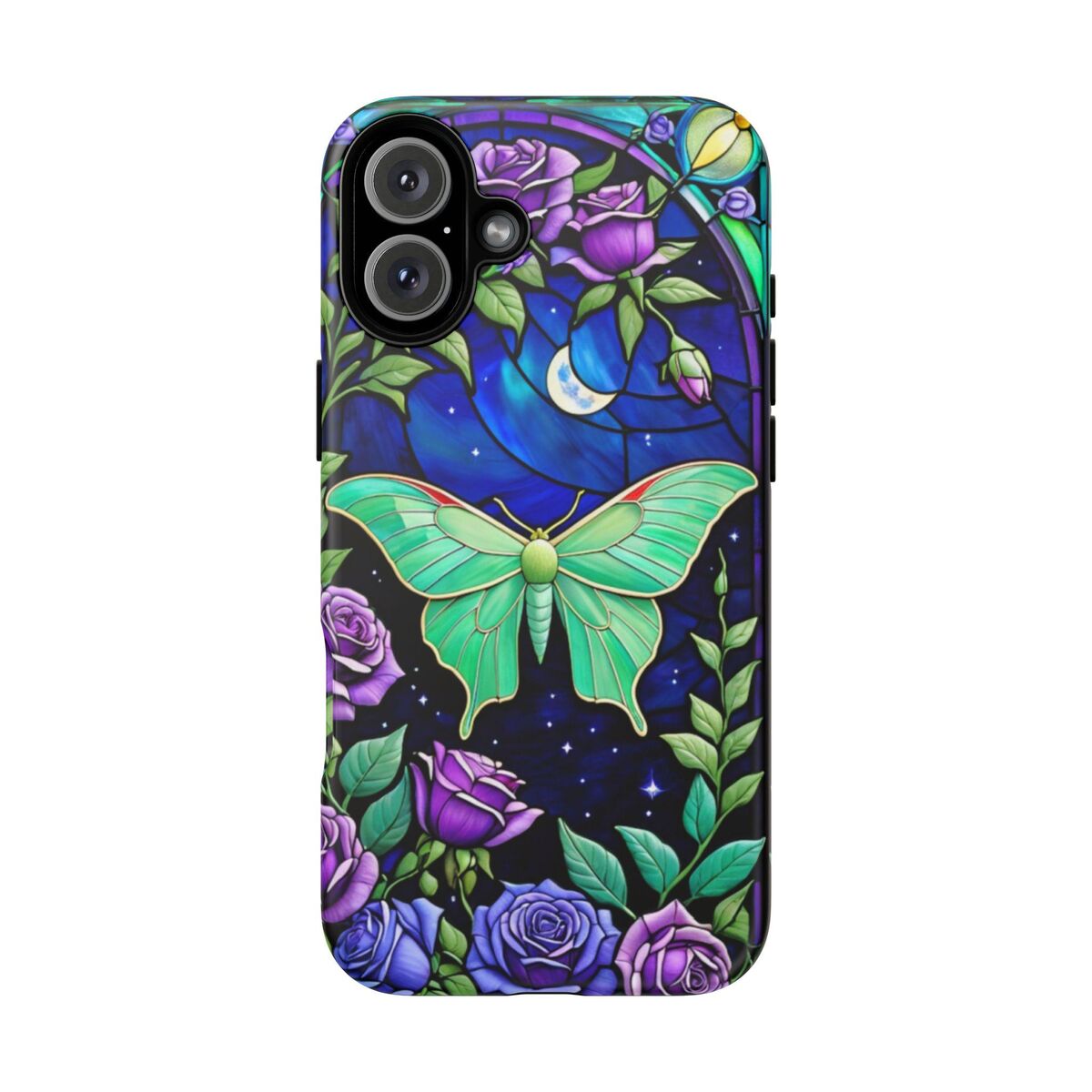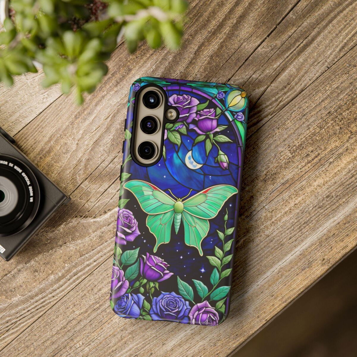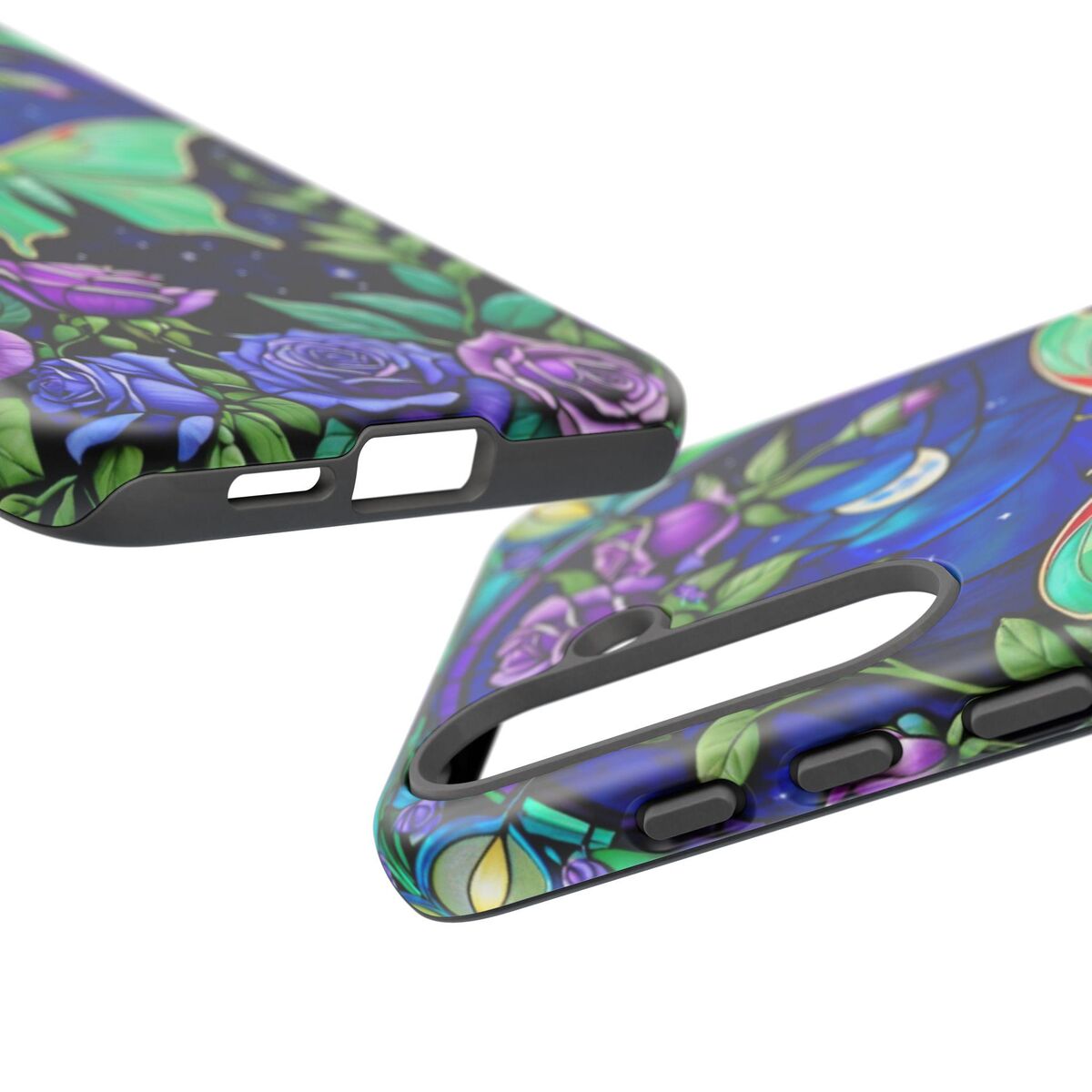 Phone Case Luna Moth Moon Phase Witchy Purple Blue Roses Unique Faux Stained Glass Fits iphone 16 15 14 13 Galaxy S25 S24 S23 Pixel And More