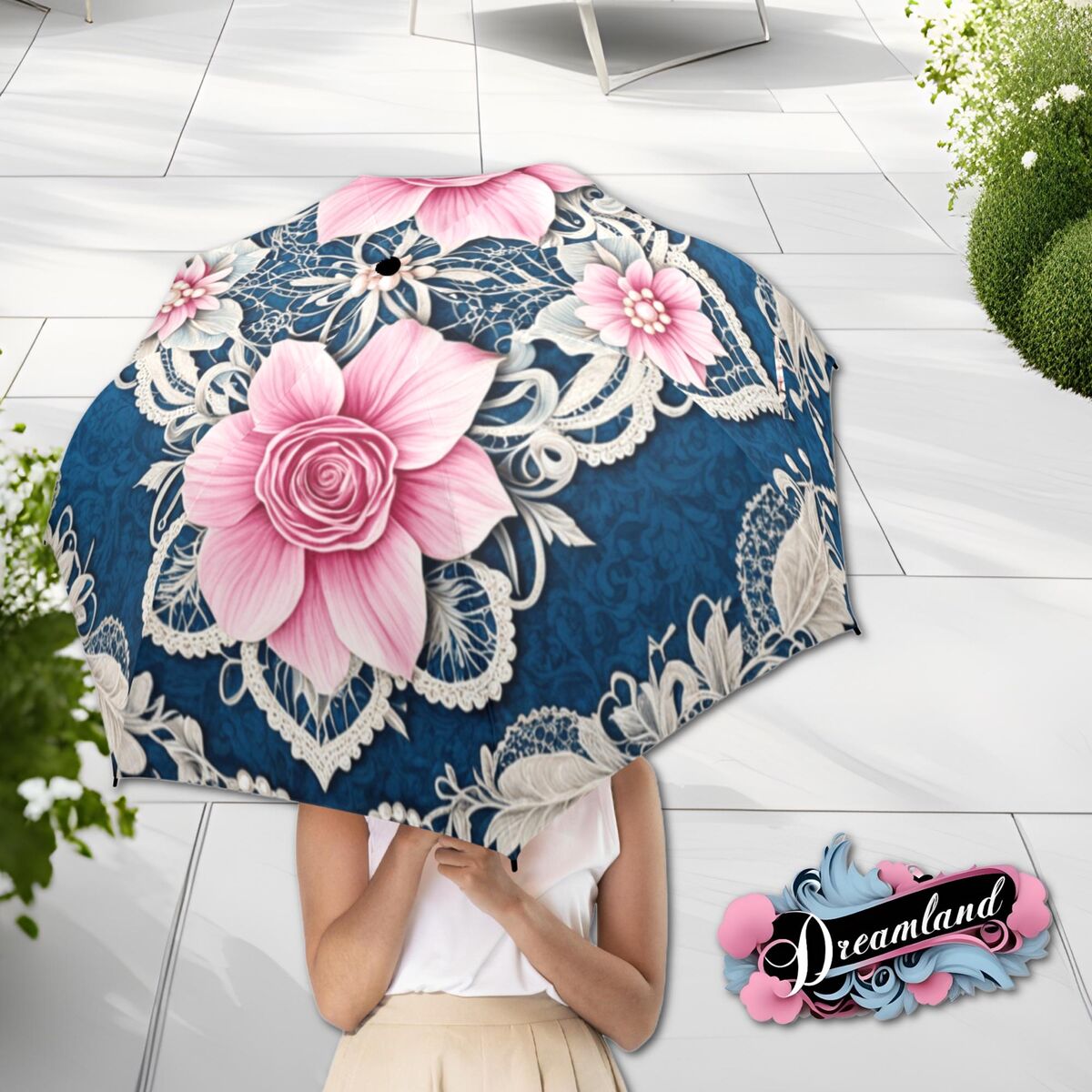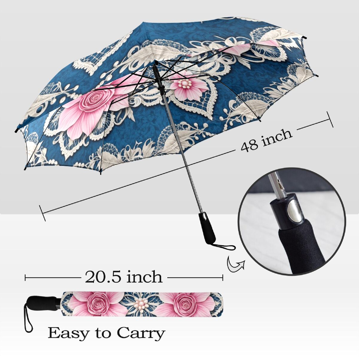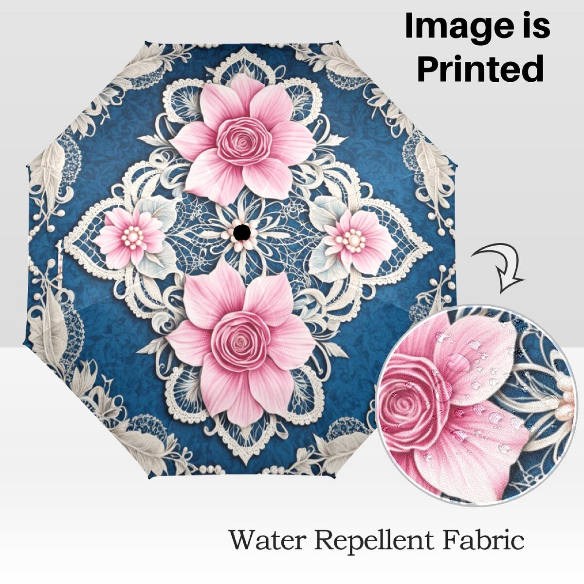 Pearls Blue Roses Umbrella Flower Floral Victorian Style Printed Faux Lace Parasol Semi-Automatic Waterproof Foldable Umbrella