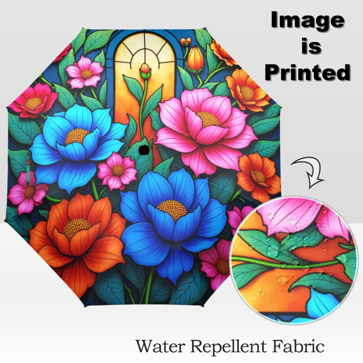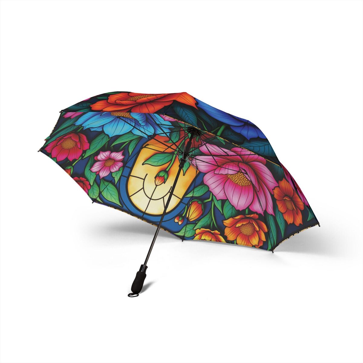 Poppy Wreath Romantic Umbrella Blossoms Faux Stained Glass Flower Parasol Semi-Automatic Waterproof Foldable Umbrella