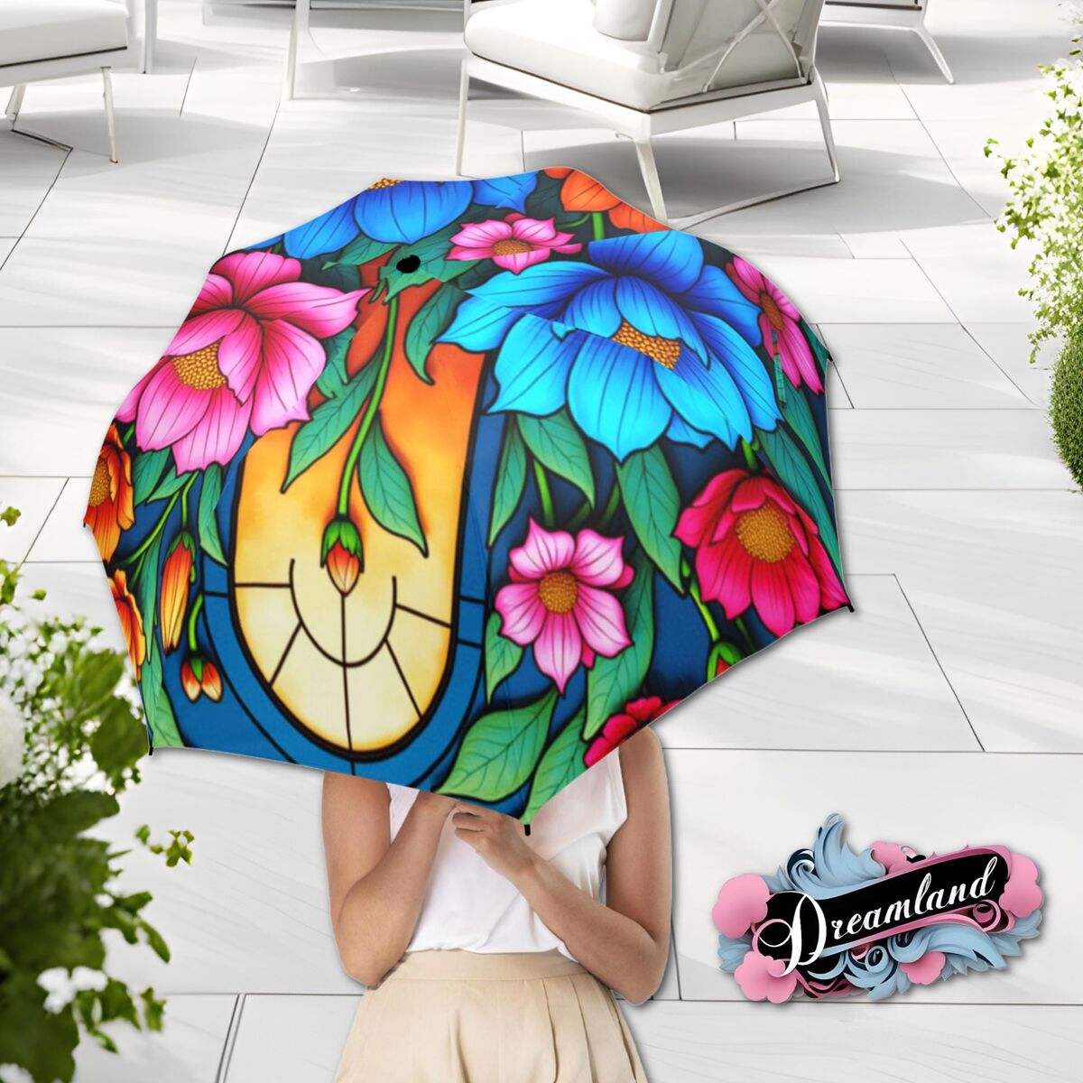 Magnolia Umbrella Romantic White Blue Gold Art Nouveau Faux Stained Glass Parasol Semi-Automatic Waterproof Foldable Umbrella