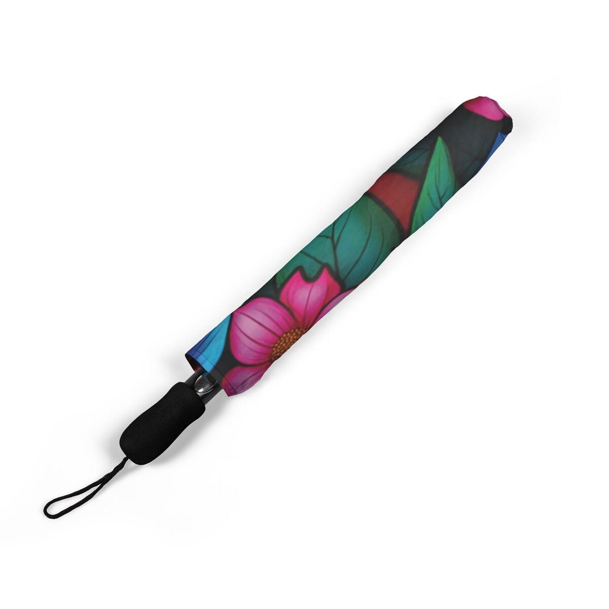 Pink Magnolia Umbrella Romantic Art Nouveau Faux Stained Glass Parasol Semi-Automatic Waterproof Foldable Umbrella
