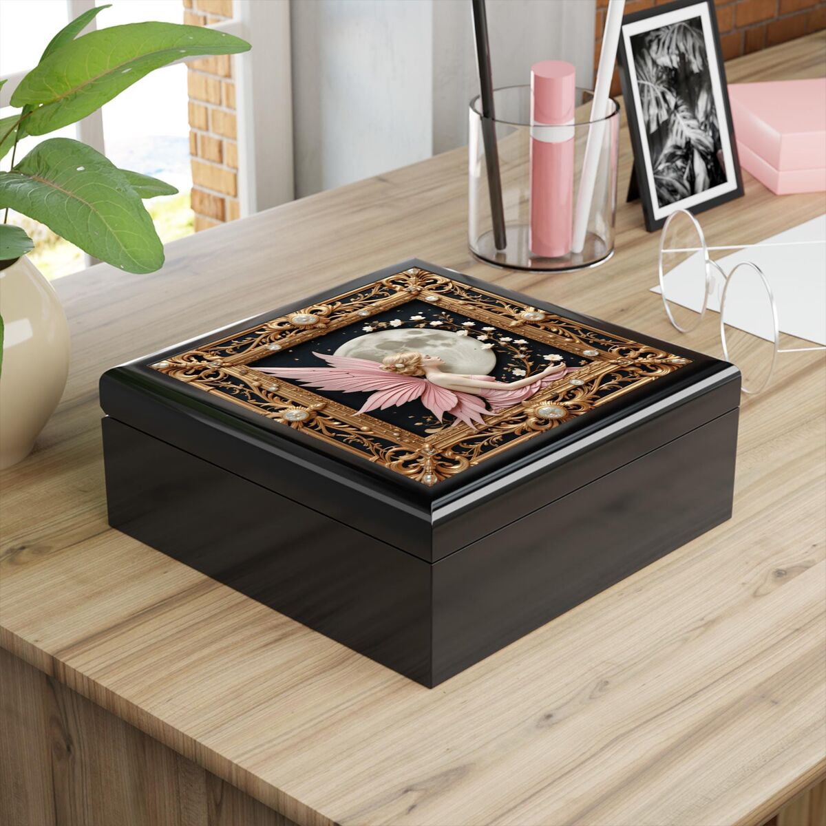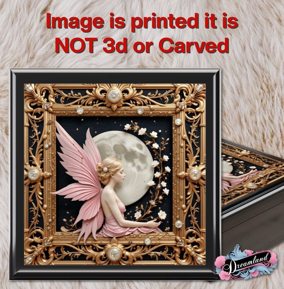 The image on the box is printed it is not carved Discover the enchanting allure of the Fairy Moon Art Nouveau Wood Jewelry Box, a stunning keepsake that beautifully marries Art Deco elegance with whimsical charm. Crafted from high-quality wood, this intricately designed box features a captivating printed style that showcases delicate fairy motifs, making it a perfect addition to any decor. Ideal for storing your cherished jewelry or treasured memories, this box is not just functional but also a striking piece of art.
