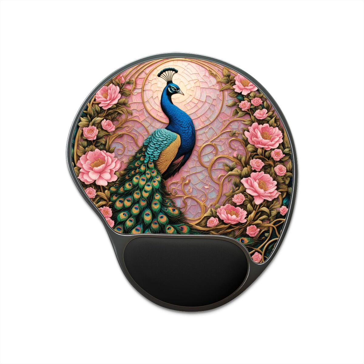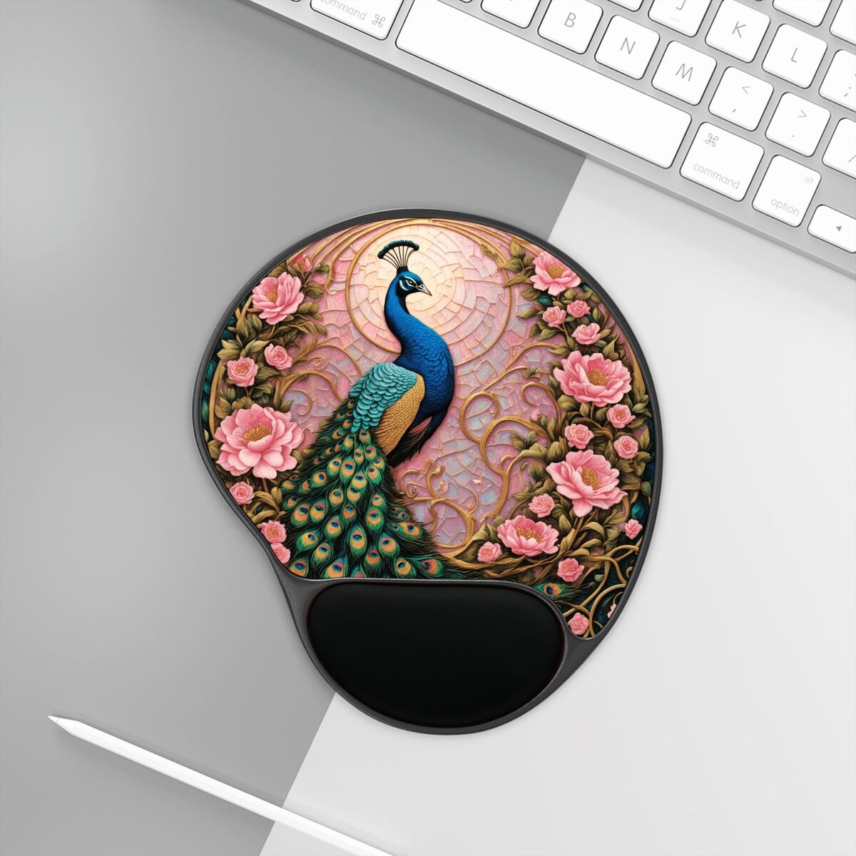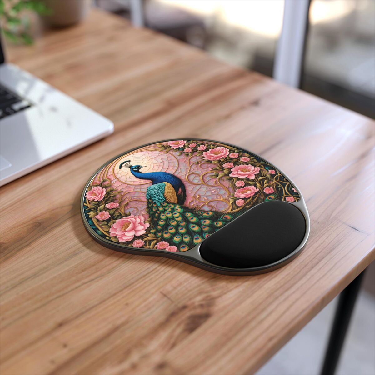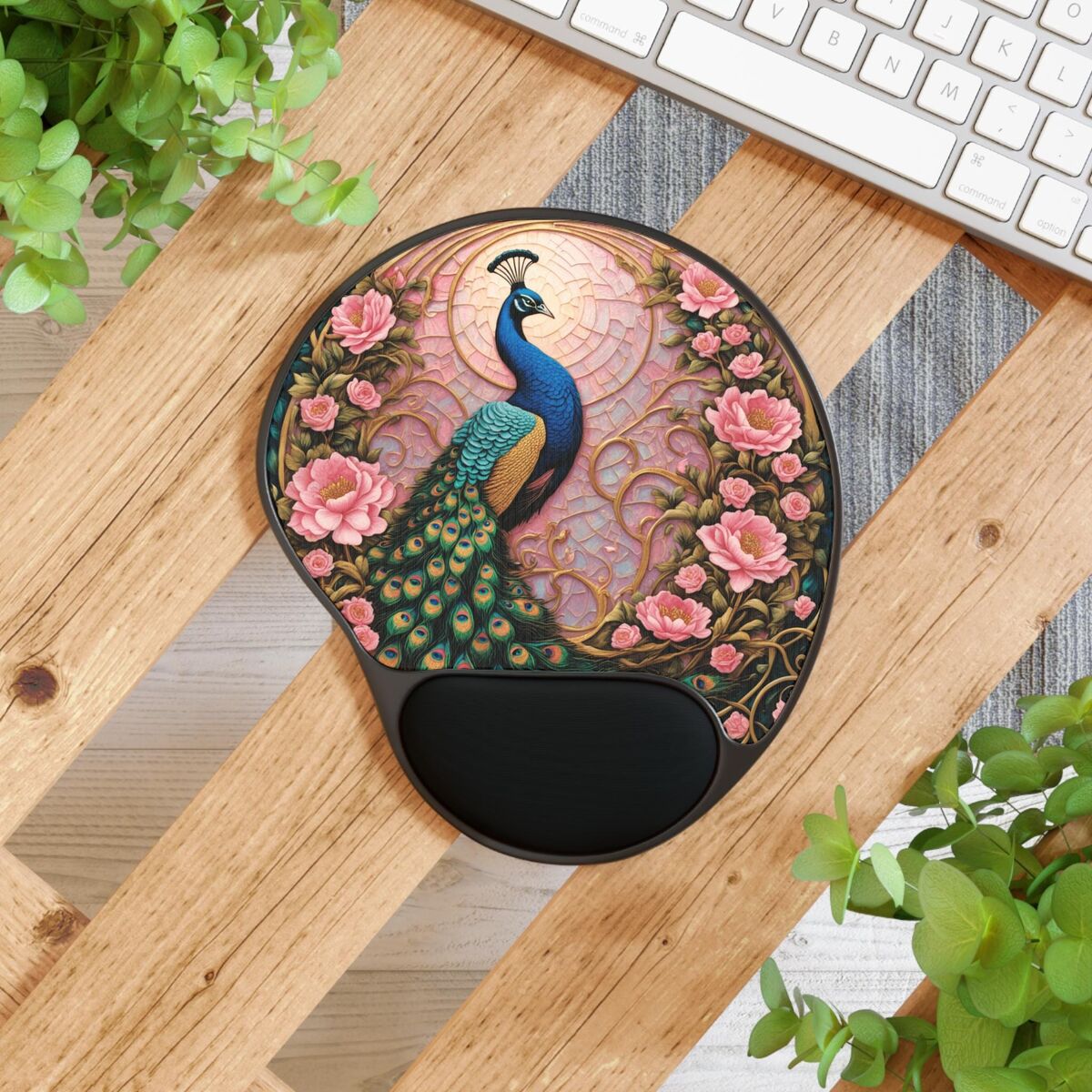 Pink Peacock Mouse Pad With Wrist Rest Faux Stained Glass Flower Floral Office Gift Desk Mat Ergonomic Home Decor