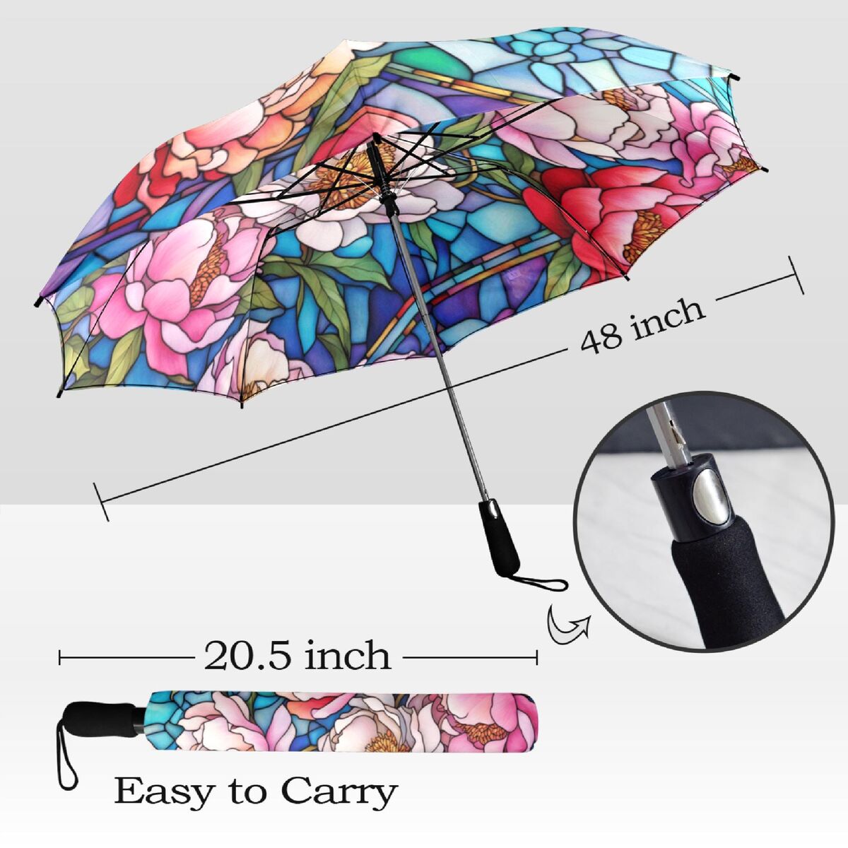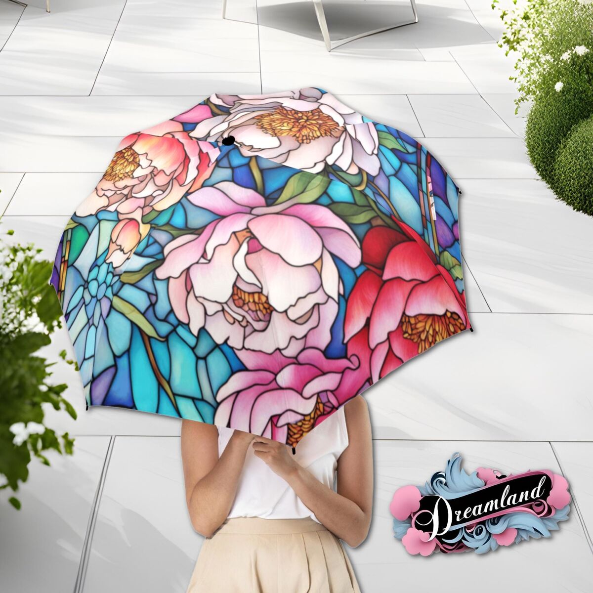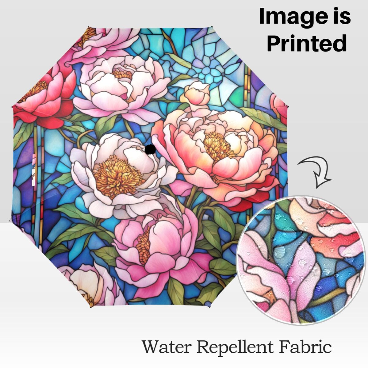 Pink Peony Umbrella Romantic Floral Blossoms Faux Stained Glass Flower Parasol Semi-Automatic Waterproof Foldable Umbrella