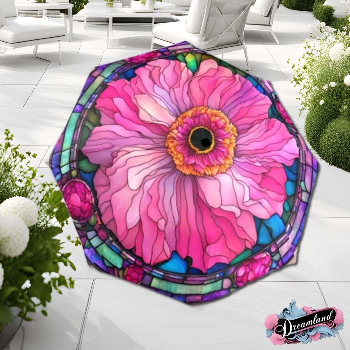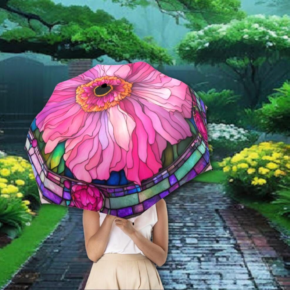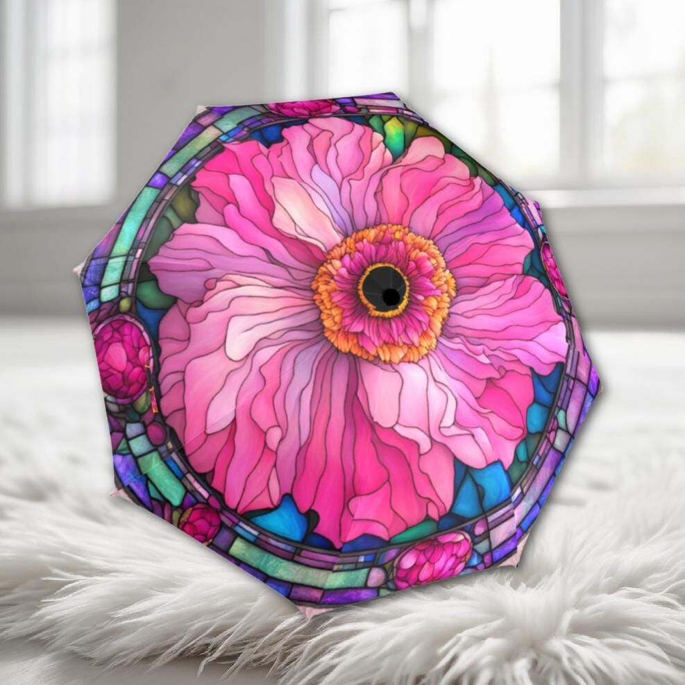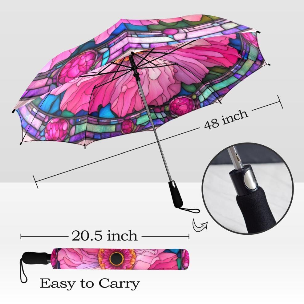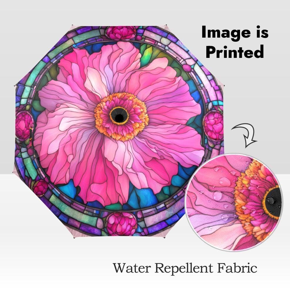 Pink Poppy Romantic Umbrella Victorian Inspired Faux Stained Glass Flower Parasol Semi-Automatic Waterproof Foldable Umbrella