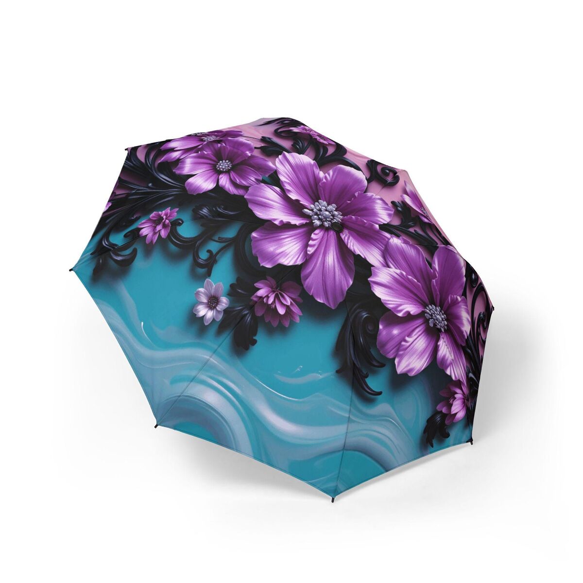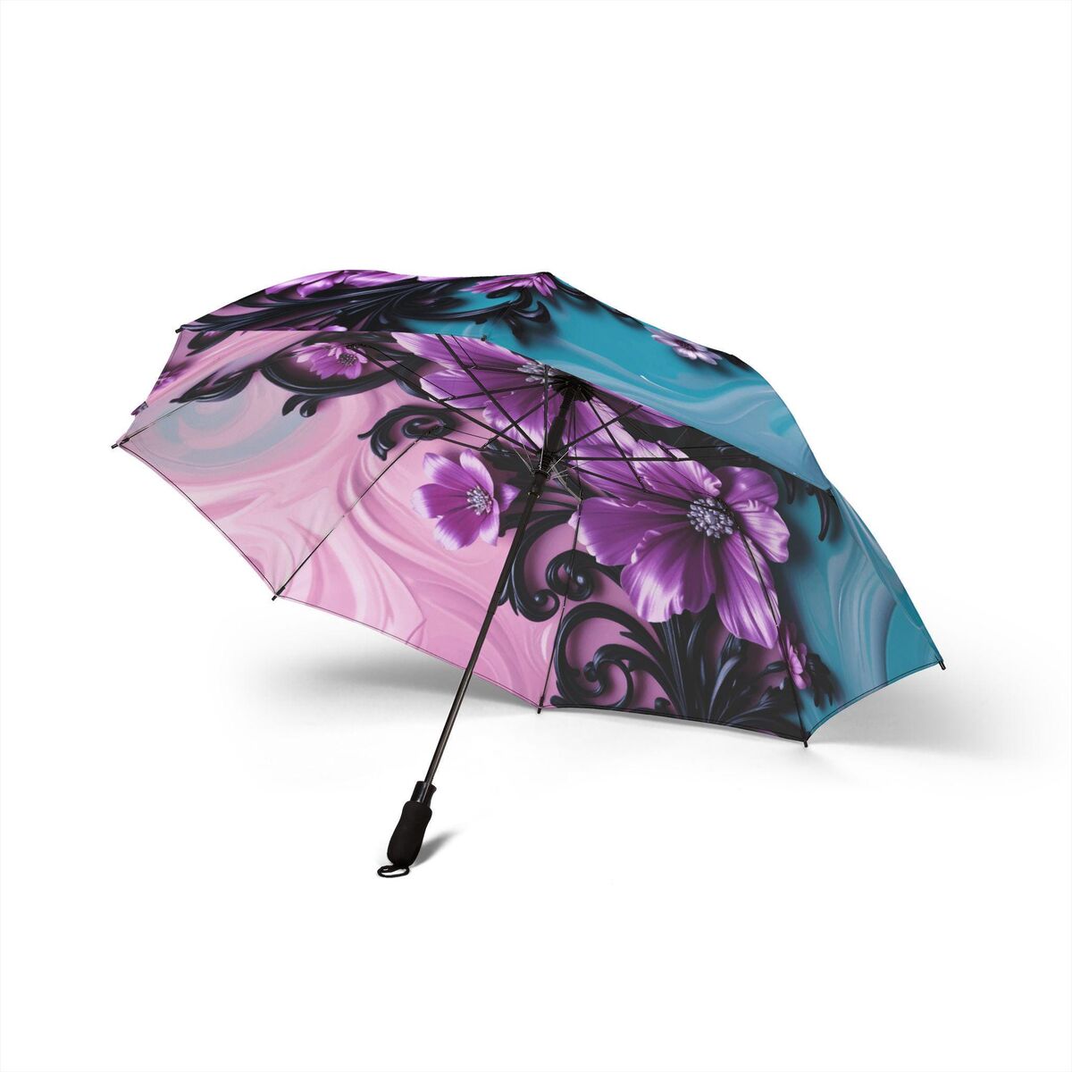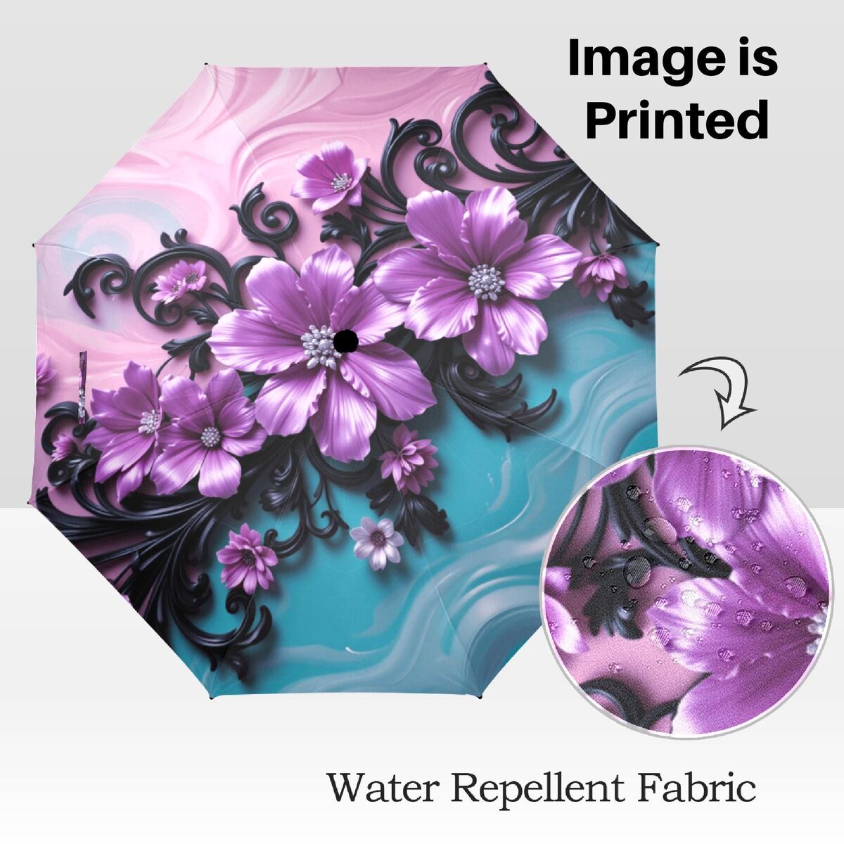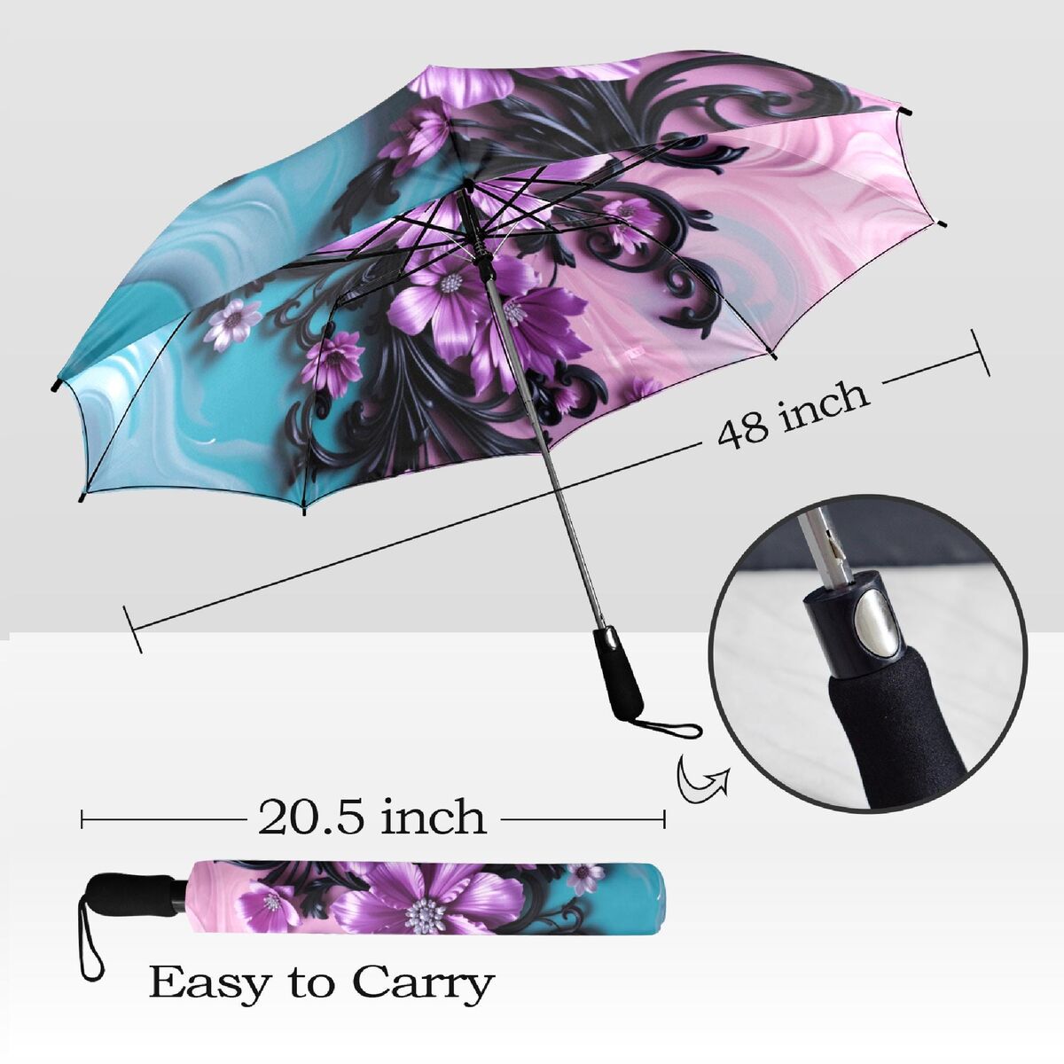 Pink Purple Flower Umbrella Blue Art Nouveau Printed Flowers Floral Parasol Semi-Automatic Waterproof Foldable Umbrella