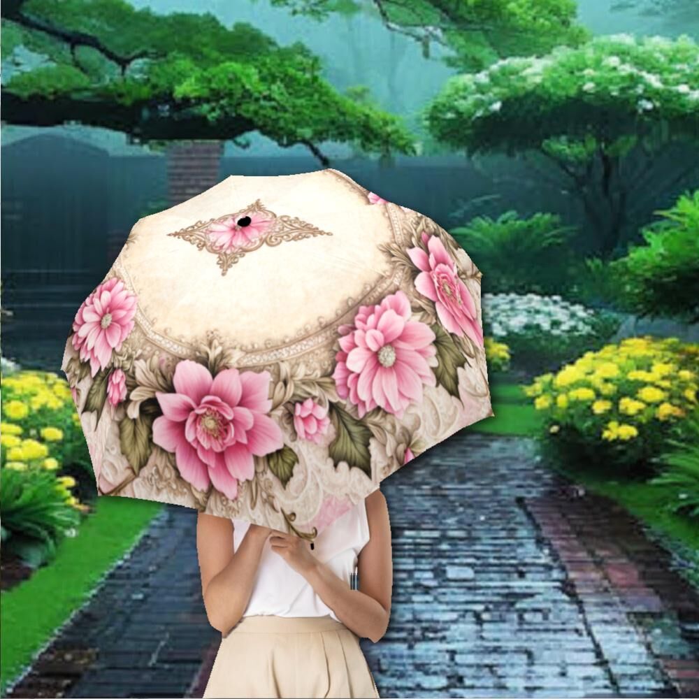 Umbrella Romantic Pink Flower Floral Art Nouveau Style Printed Faux Floral Lace Parasol Semi-Automatic Waterproof Foldable Umbrella