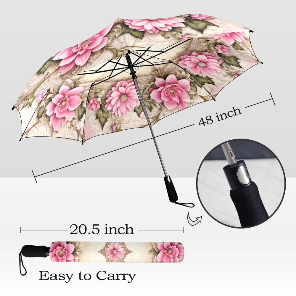 Pink White Unique Umbrella Flower Floral Art Nouveau Style Printed Faux Floral Beads Parasol Semi-Automatic Waterproof Foldable Umbrella