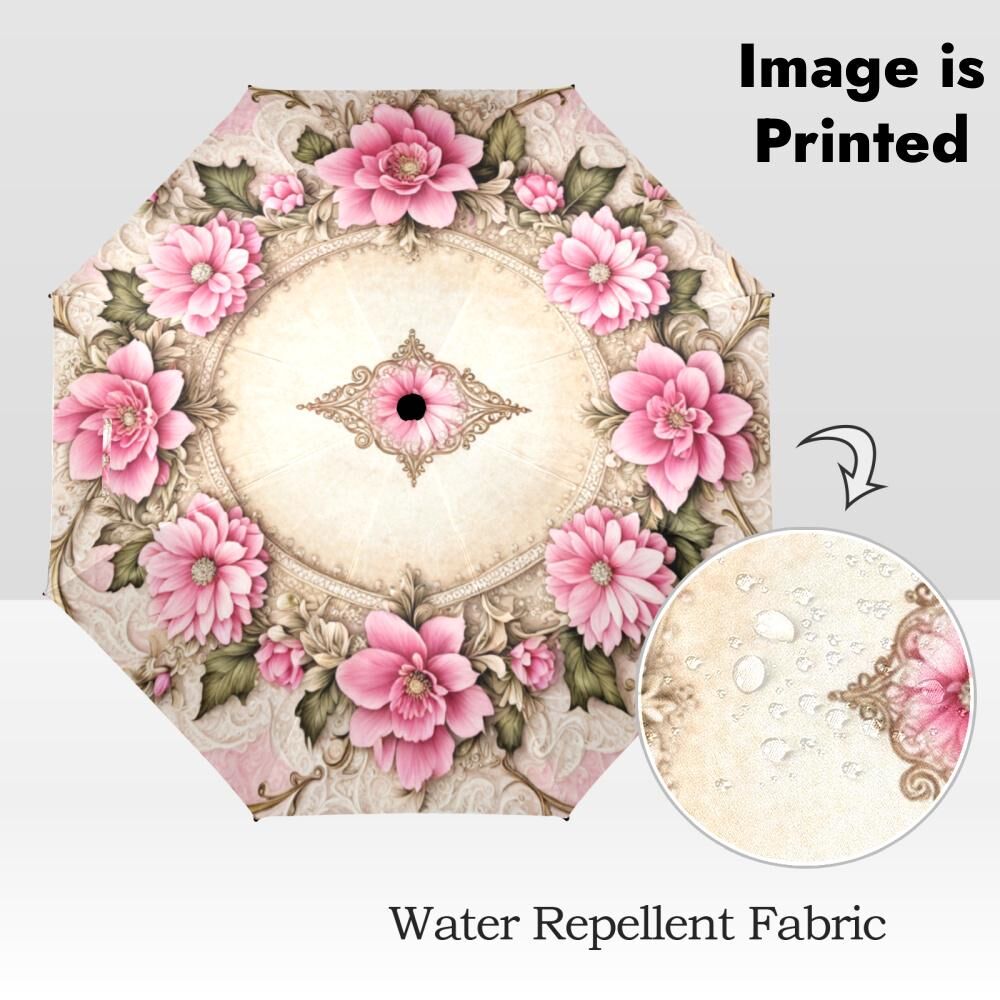 Pastel Pink Umbrella Romantic Flower Floral Art Nouveau Style Printed Faux Floral Lace Parasol Semi-Automatic Waterproof Foldable Umbrella