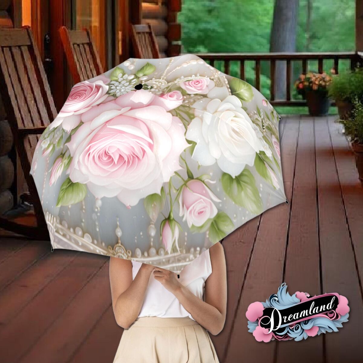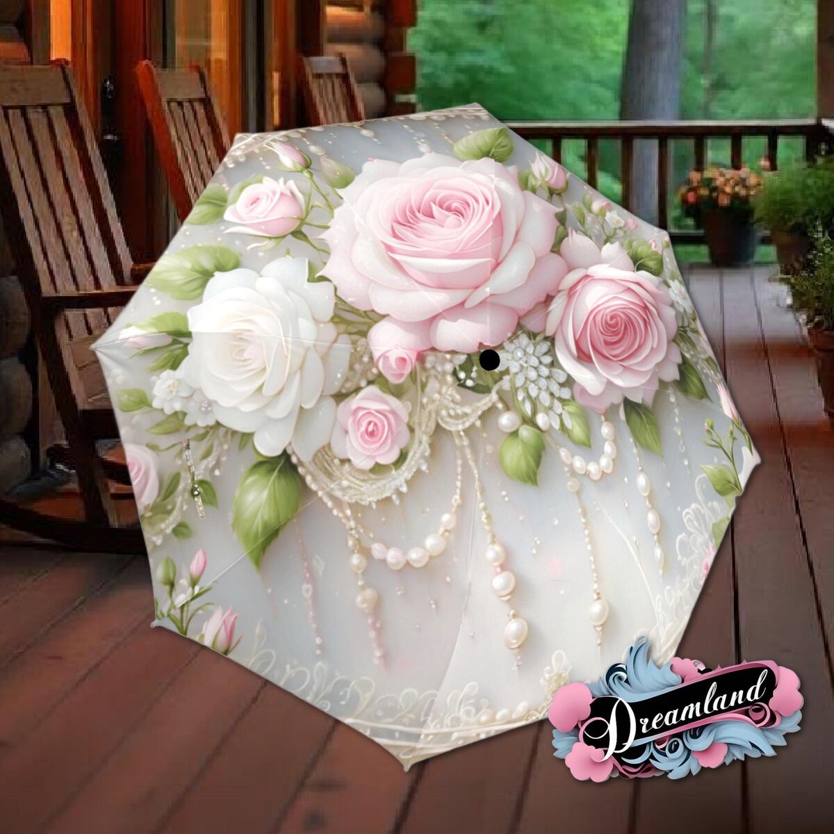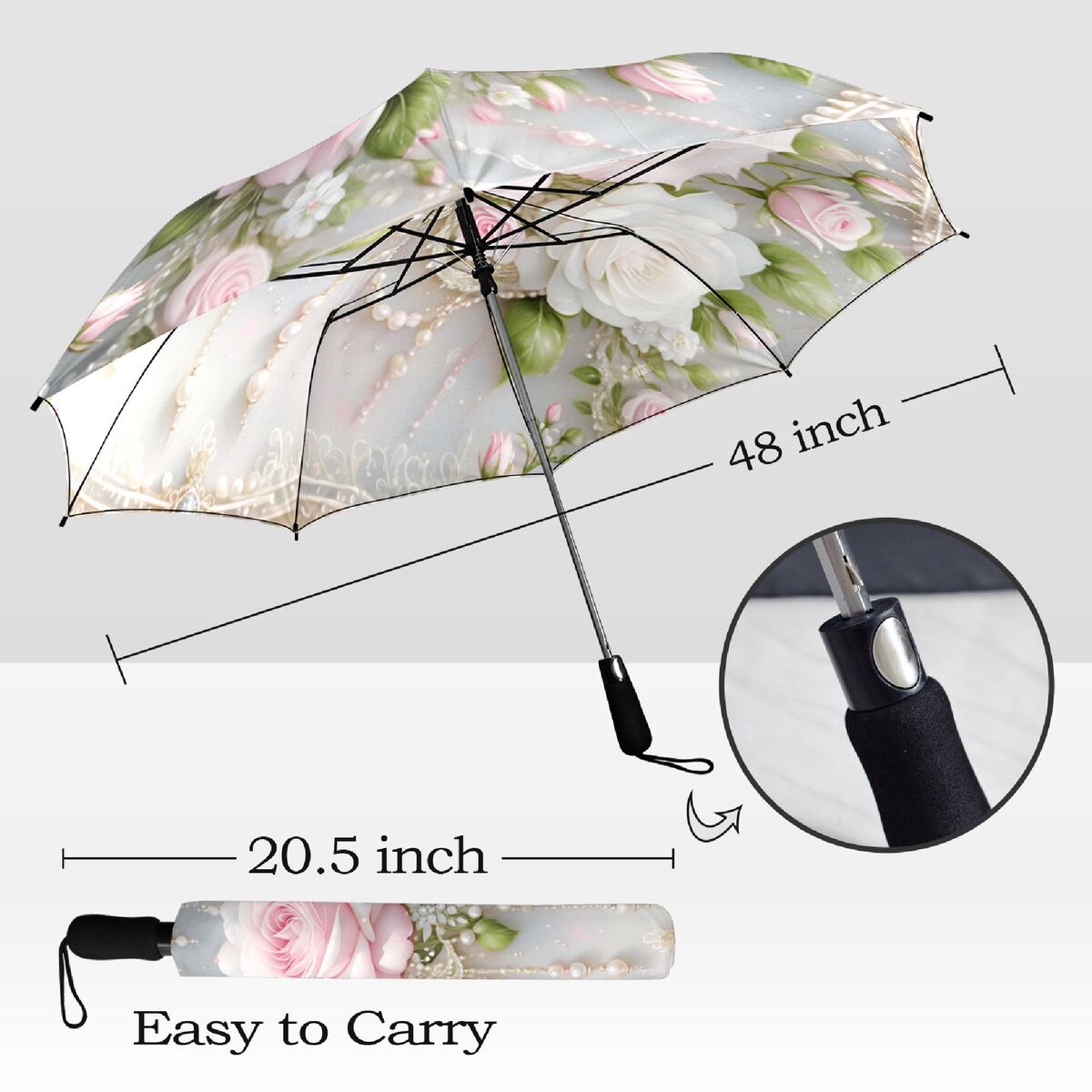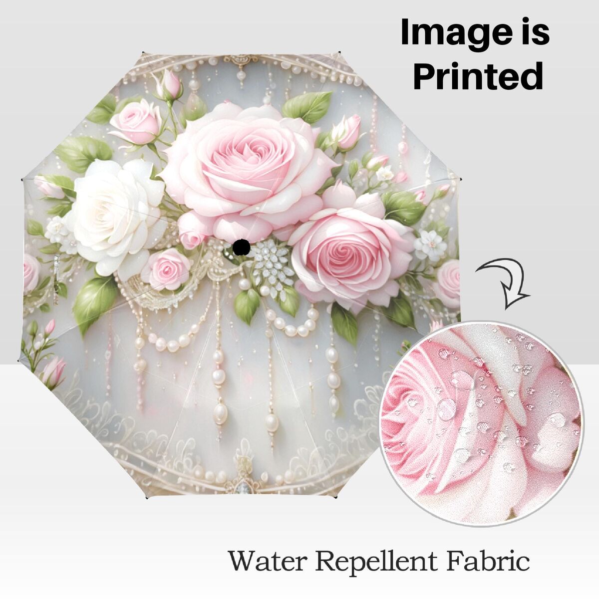Pink Rose Umbrella Flower Floral Victorian Style Printed Faux Lsce Parasol Semi-Automatic Waterproof Foldable Umbrella