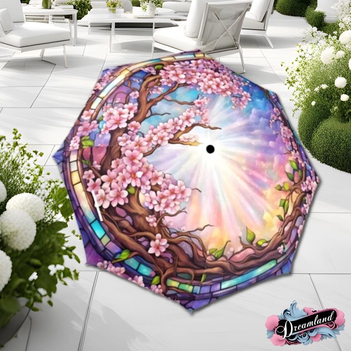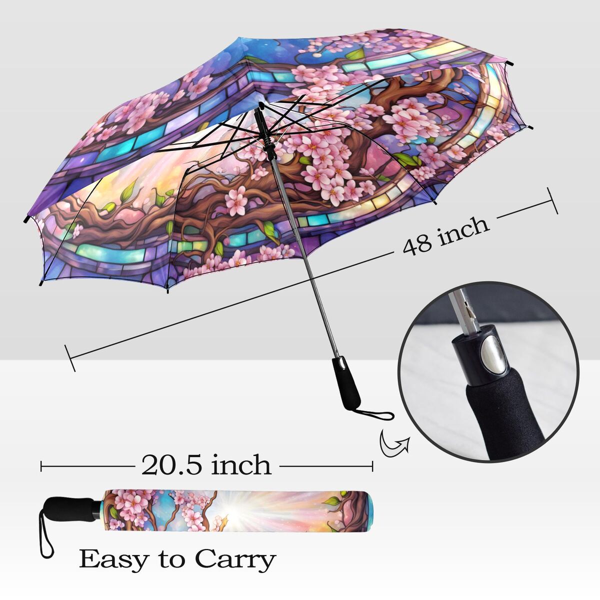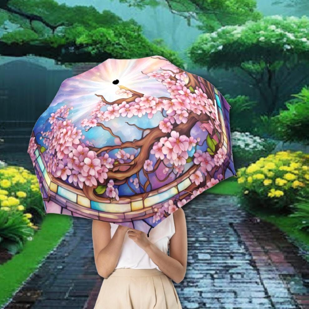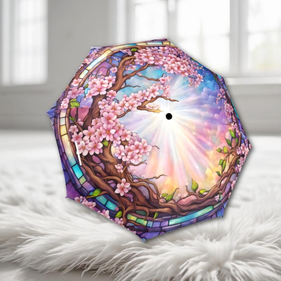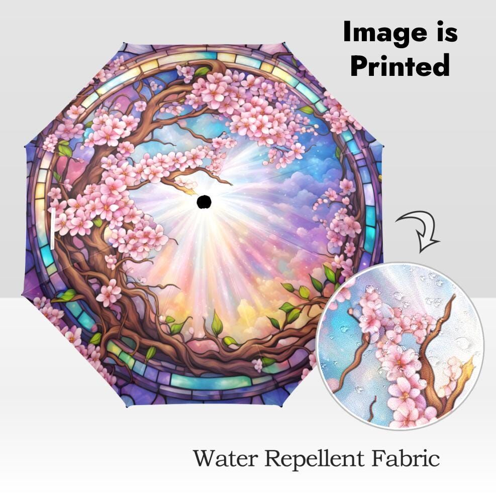 Pink Sakura Romantic Umbrella Cherry Tree Blossoms Faux Stained Glass Flower Parasol Semi-Automatic Waterproof Foldable Umbrella
