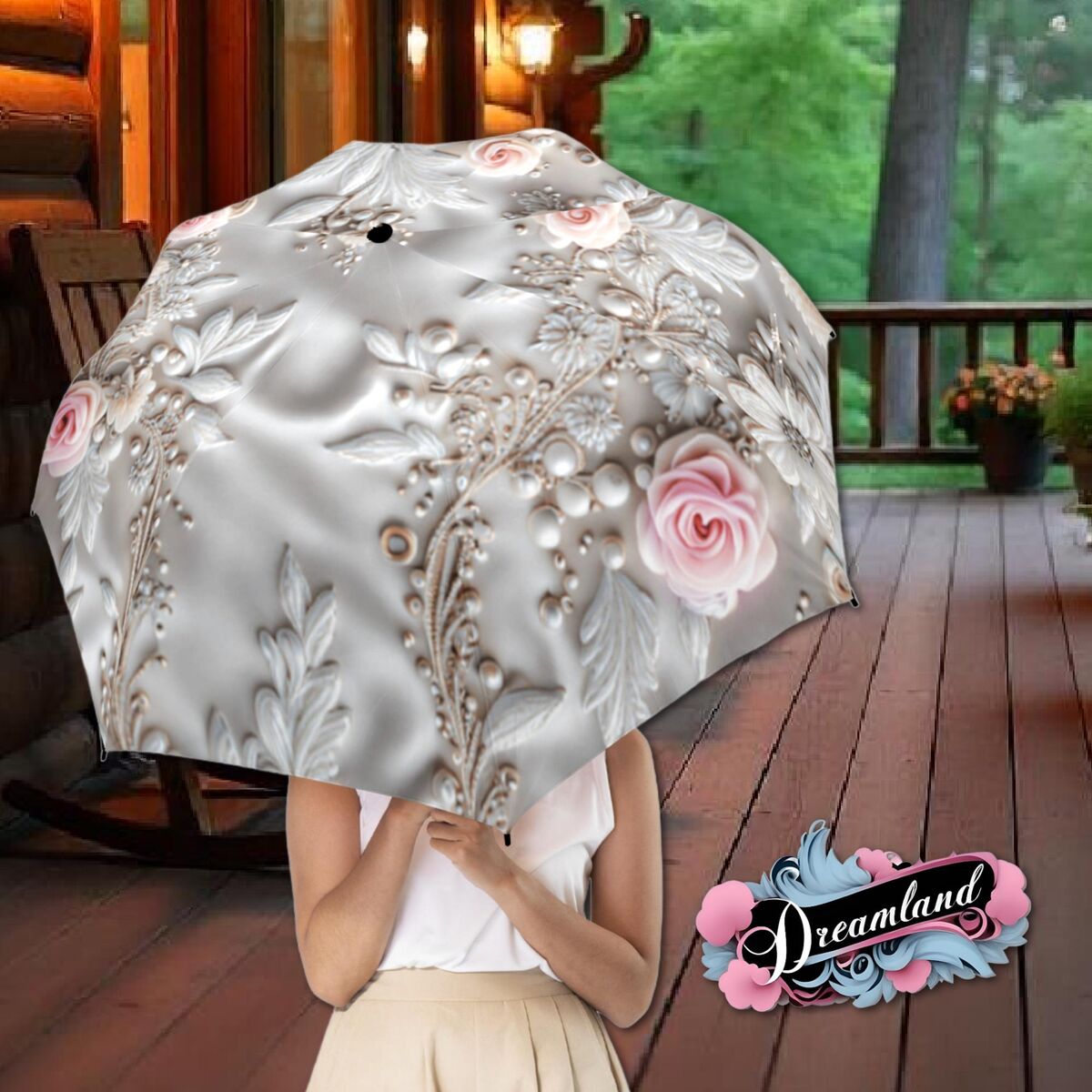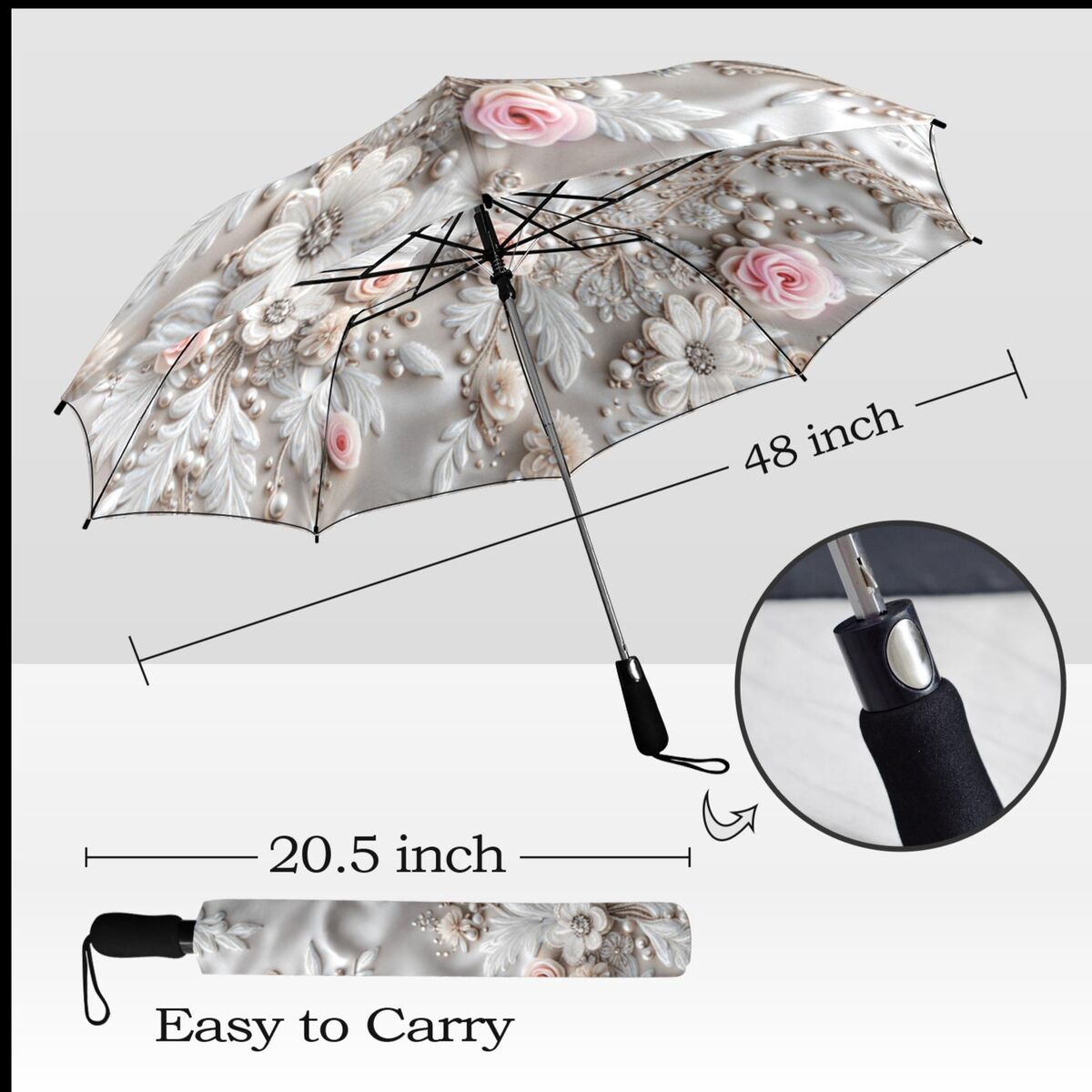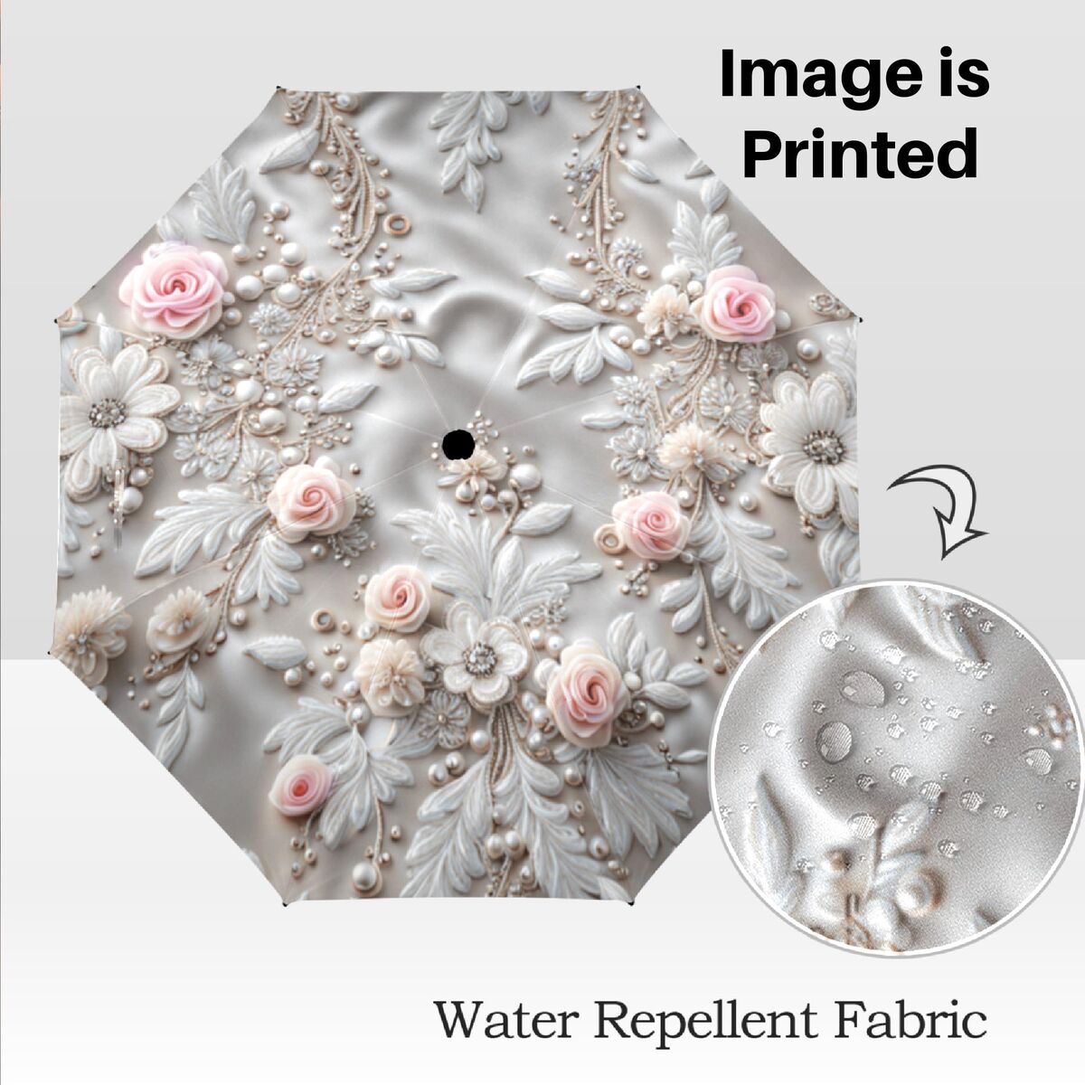 Pink Silver Gray Umbrella Flower Floral Art Nouveau Style Printed Faux Floral Beads Parasol Semi-Automatic Waterproof Foldable Umbrella