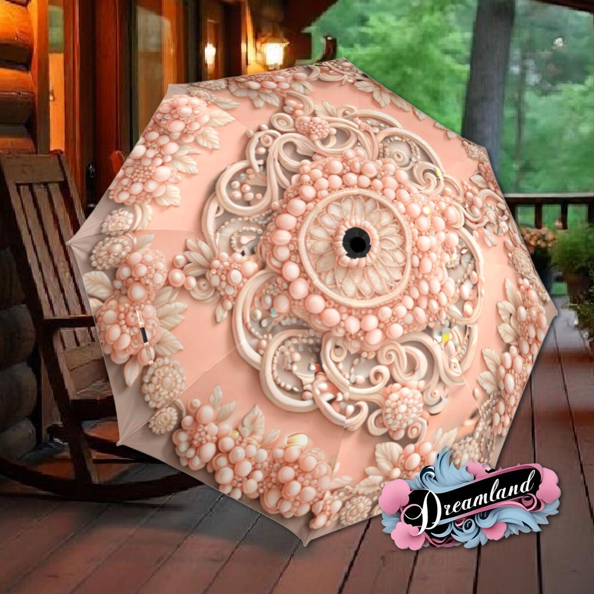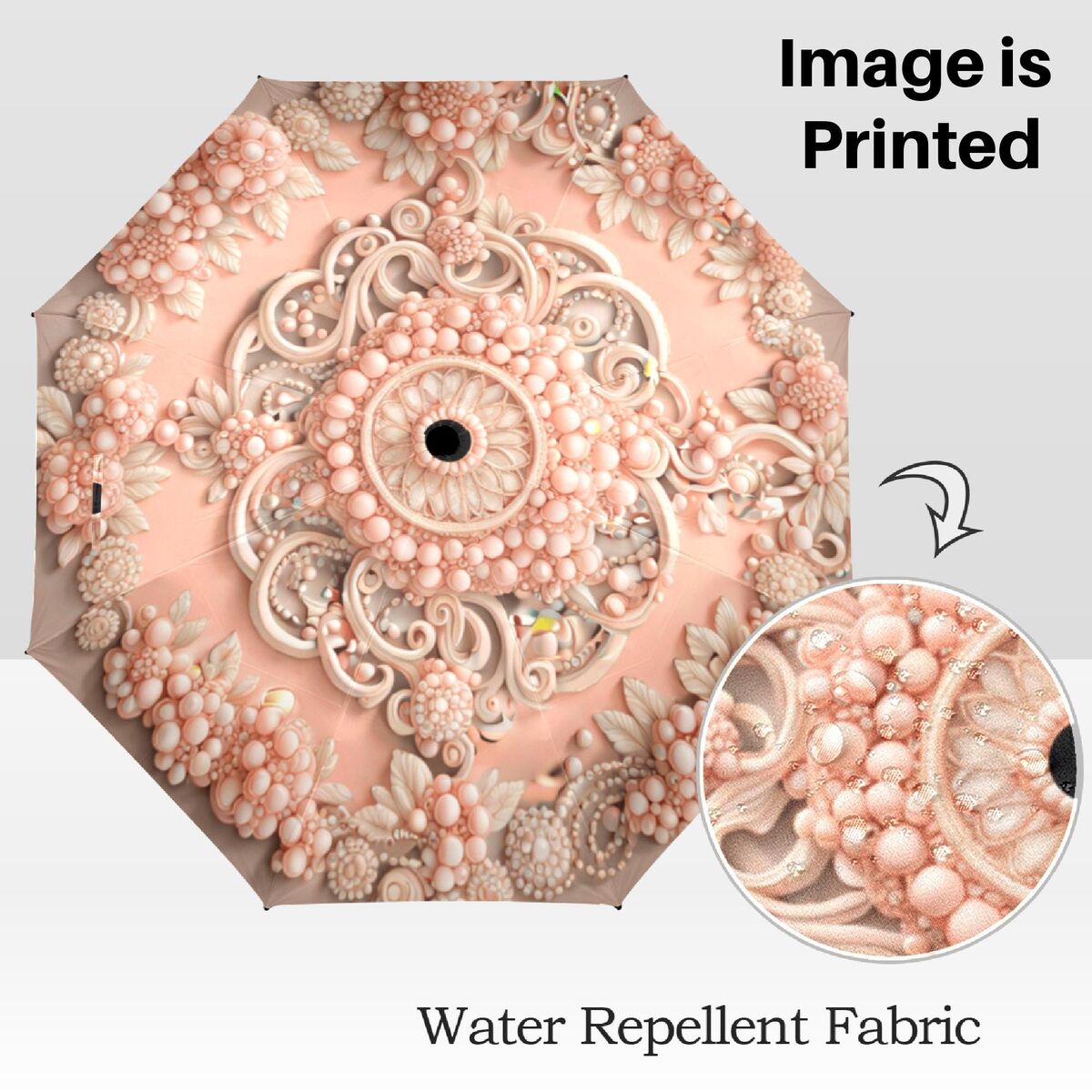 Pink Umbrella Flower Art Nouveau Unique Style Printed Faux Flower Beads Parasol Semi-Automatic Waterproof Foldable Umbrella