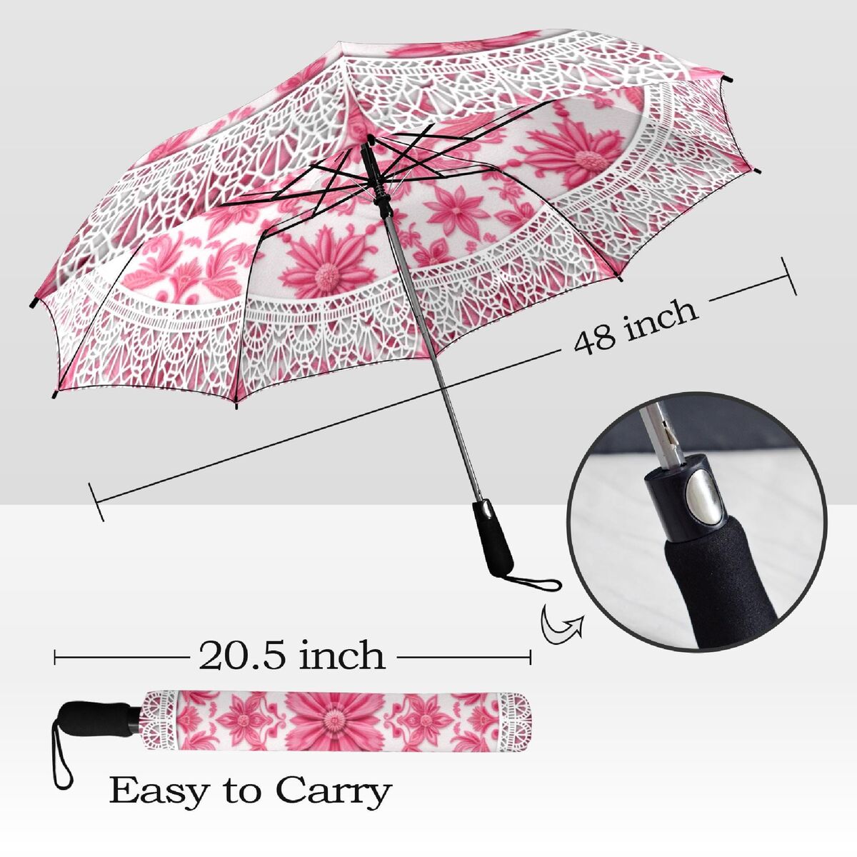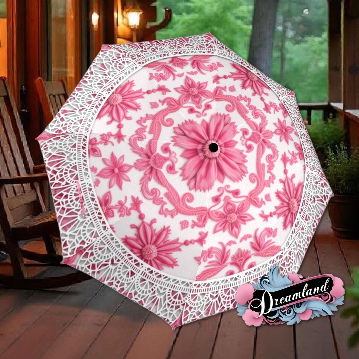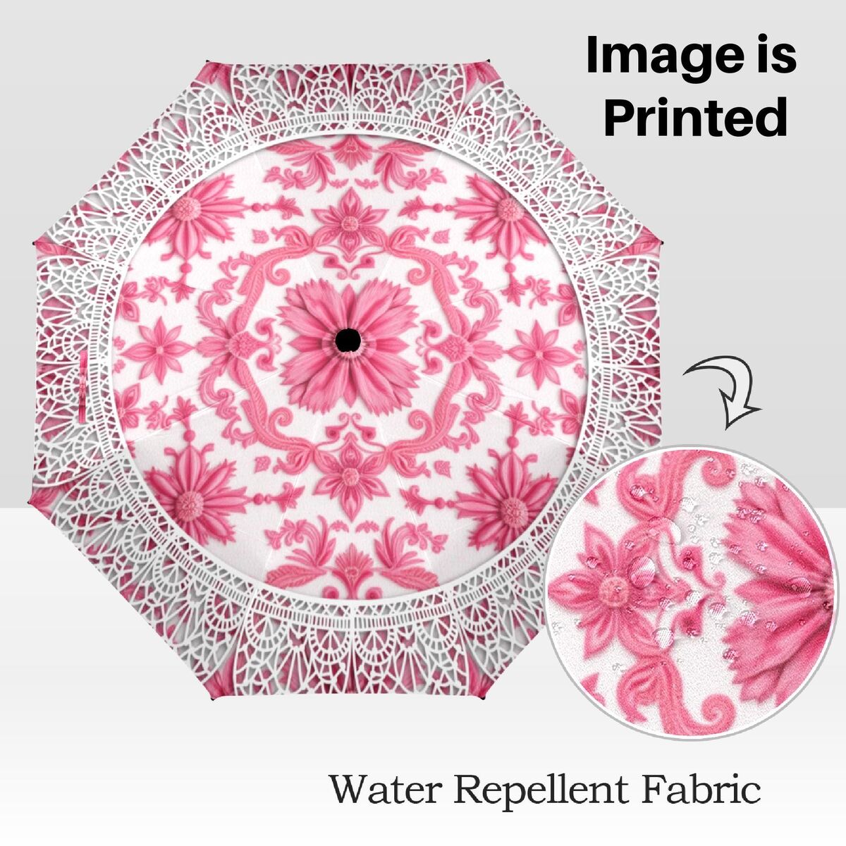 Pink White Umbrella Flower Romantic Art Nouveau Floral Faux Printed Lace Parasol Semi-Automatic Waterproof Foldable Umbrella