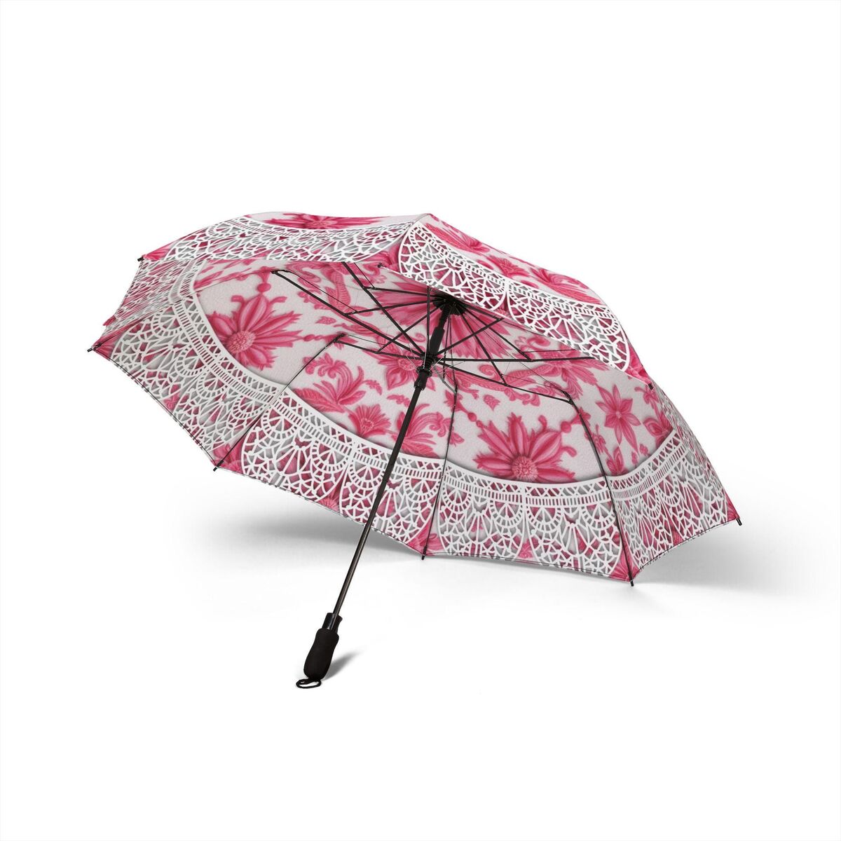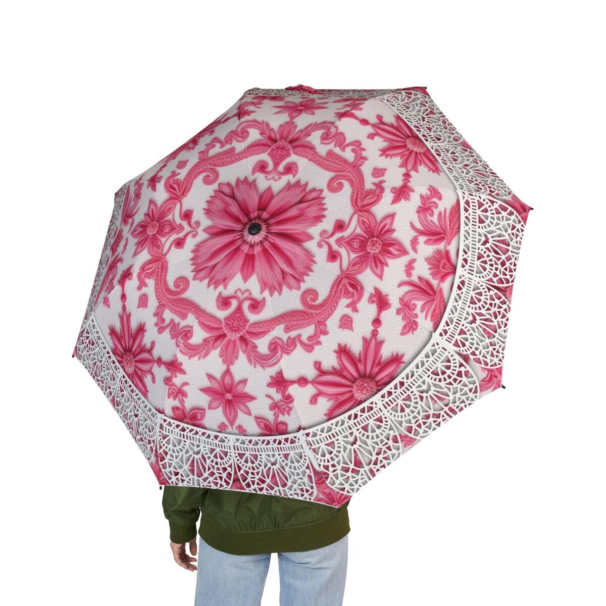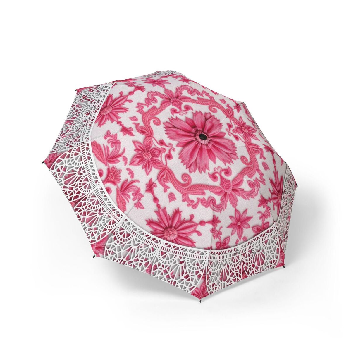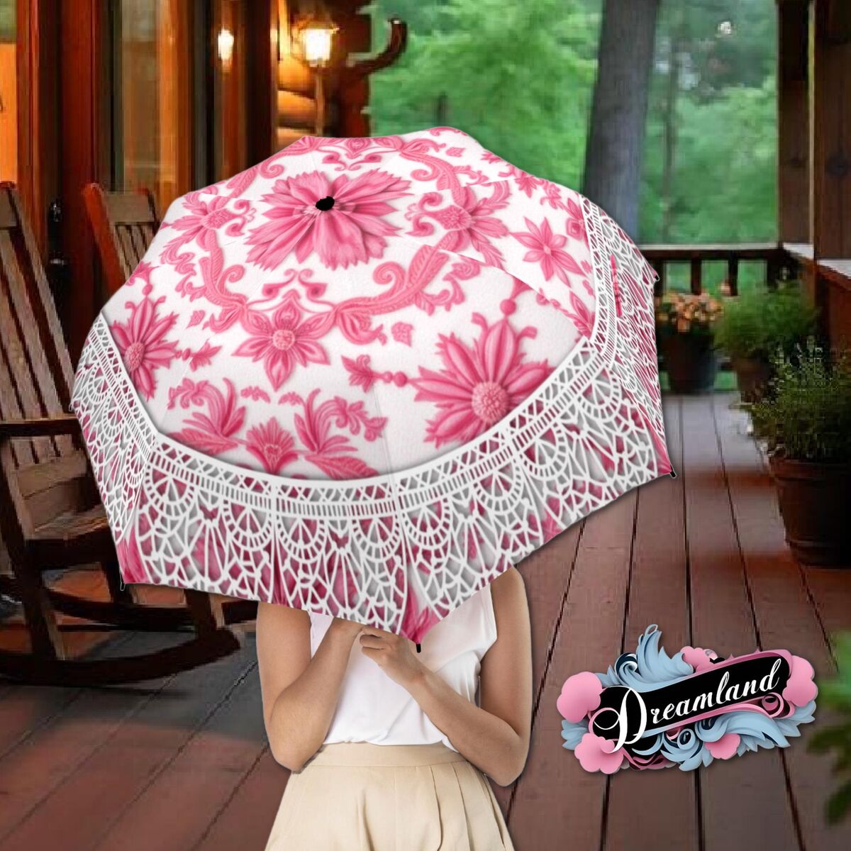 Pink White Umbrella Flower Romantic Art Nouveau Floral Faux Printed Lace Parasol Semi-Automatic Waterproof Foldable Umbrella