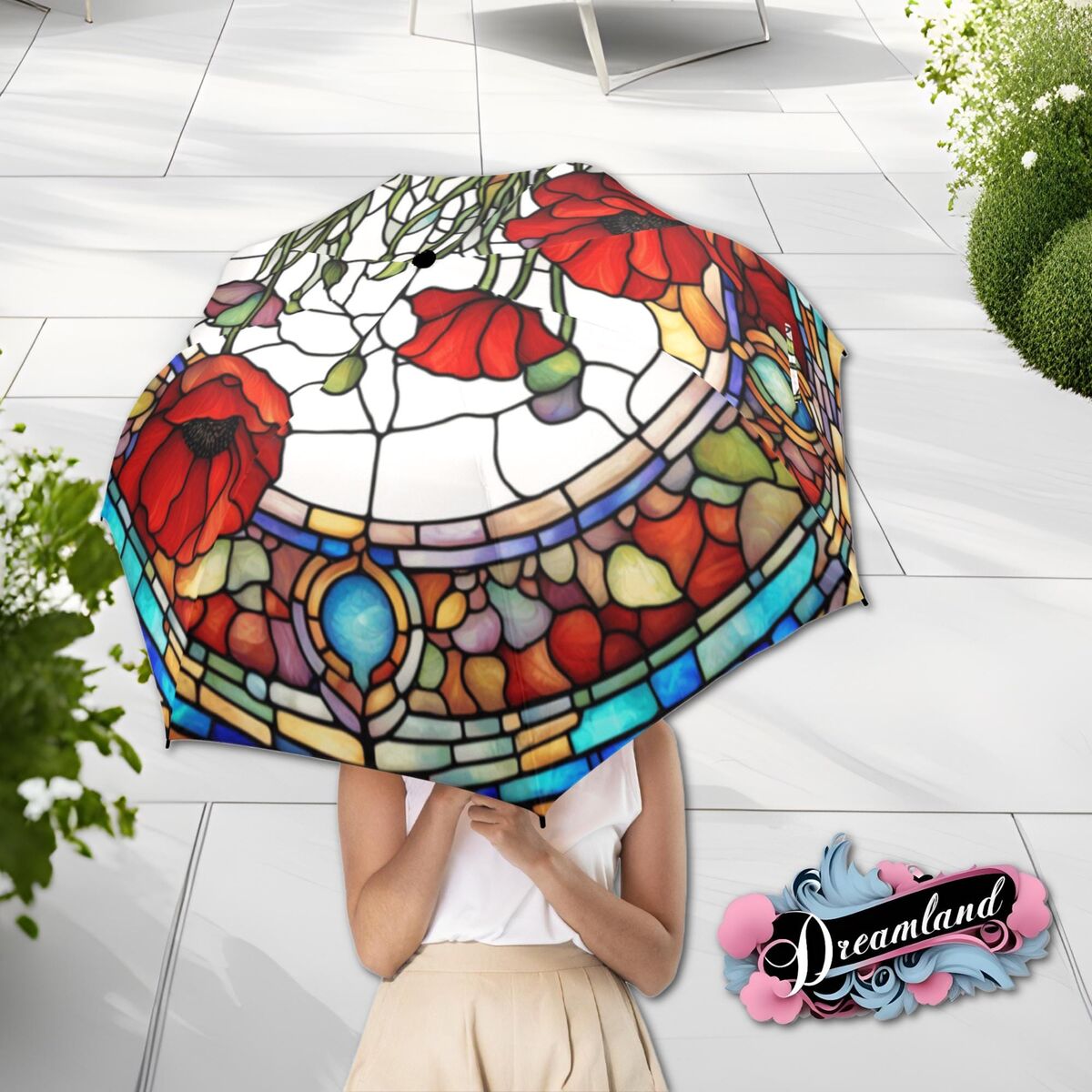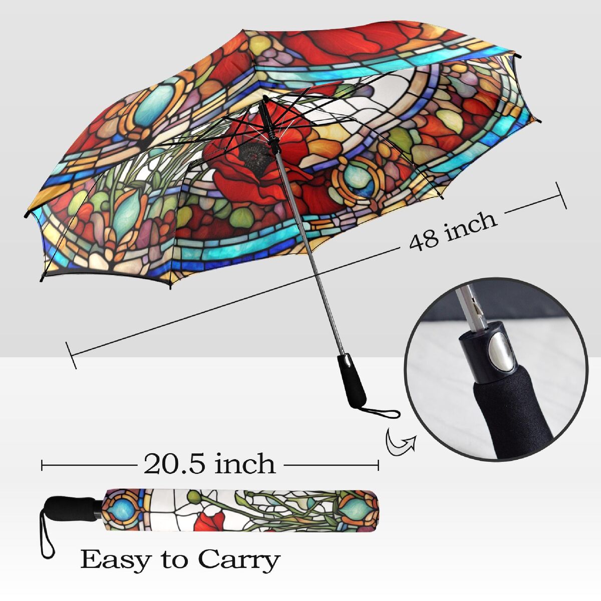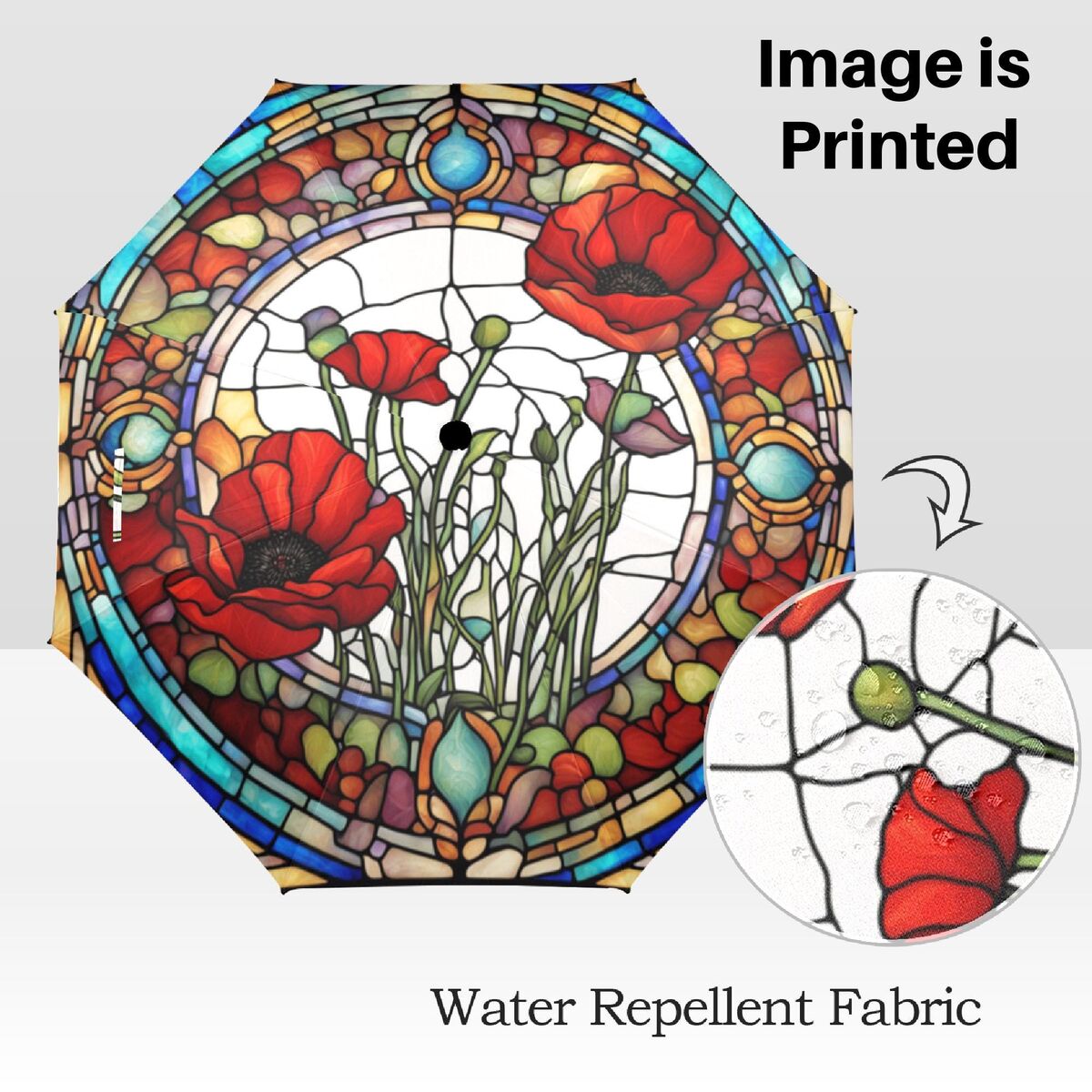 Poppy Field Flower Red White Umbrella Romantic Floral Blossoms Faux Stained Glass Flower Parasol Semi-Automatic Waterproof Foldable Umbrella
