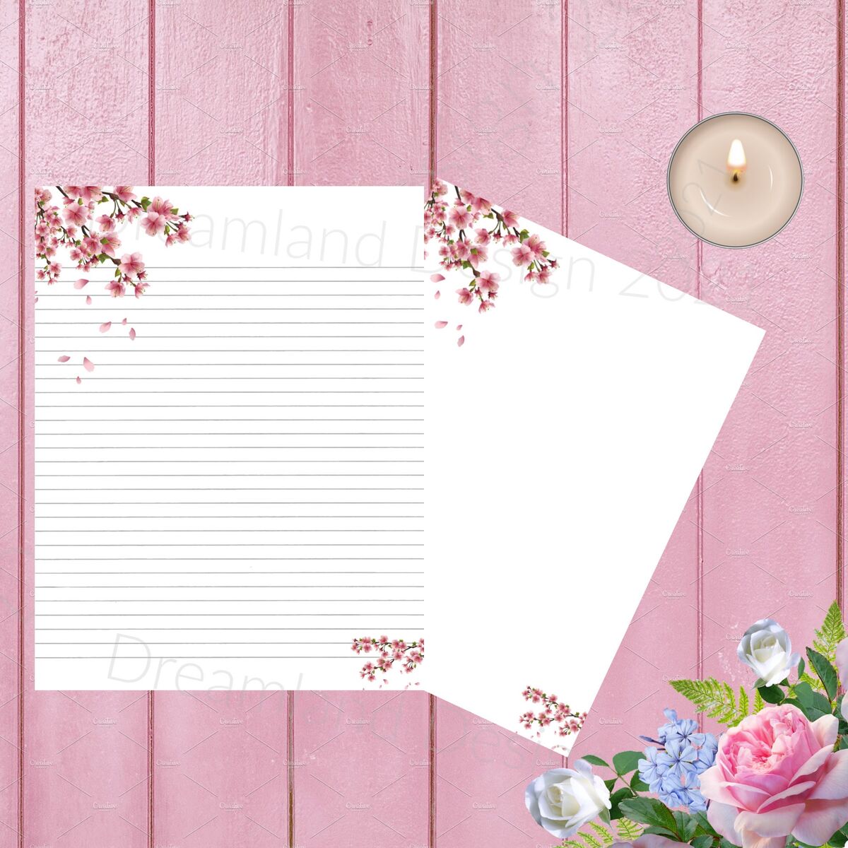 Printable Stationary Cherry Blossums Blank Digital Writing Paper Lined Note Book Flower Watercolor Roses Paper