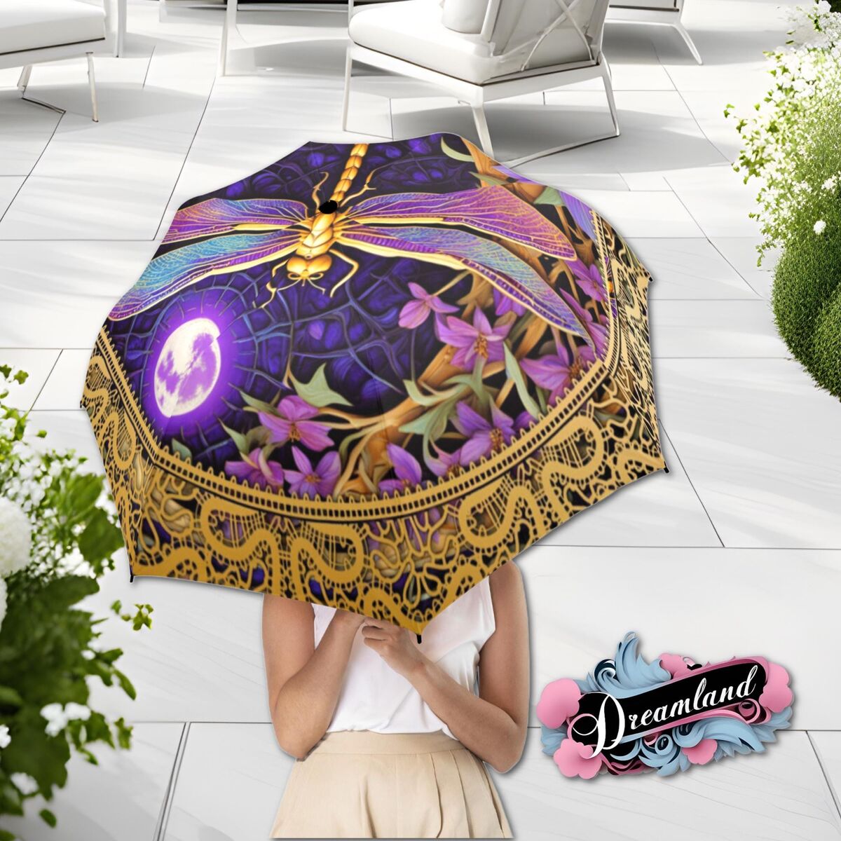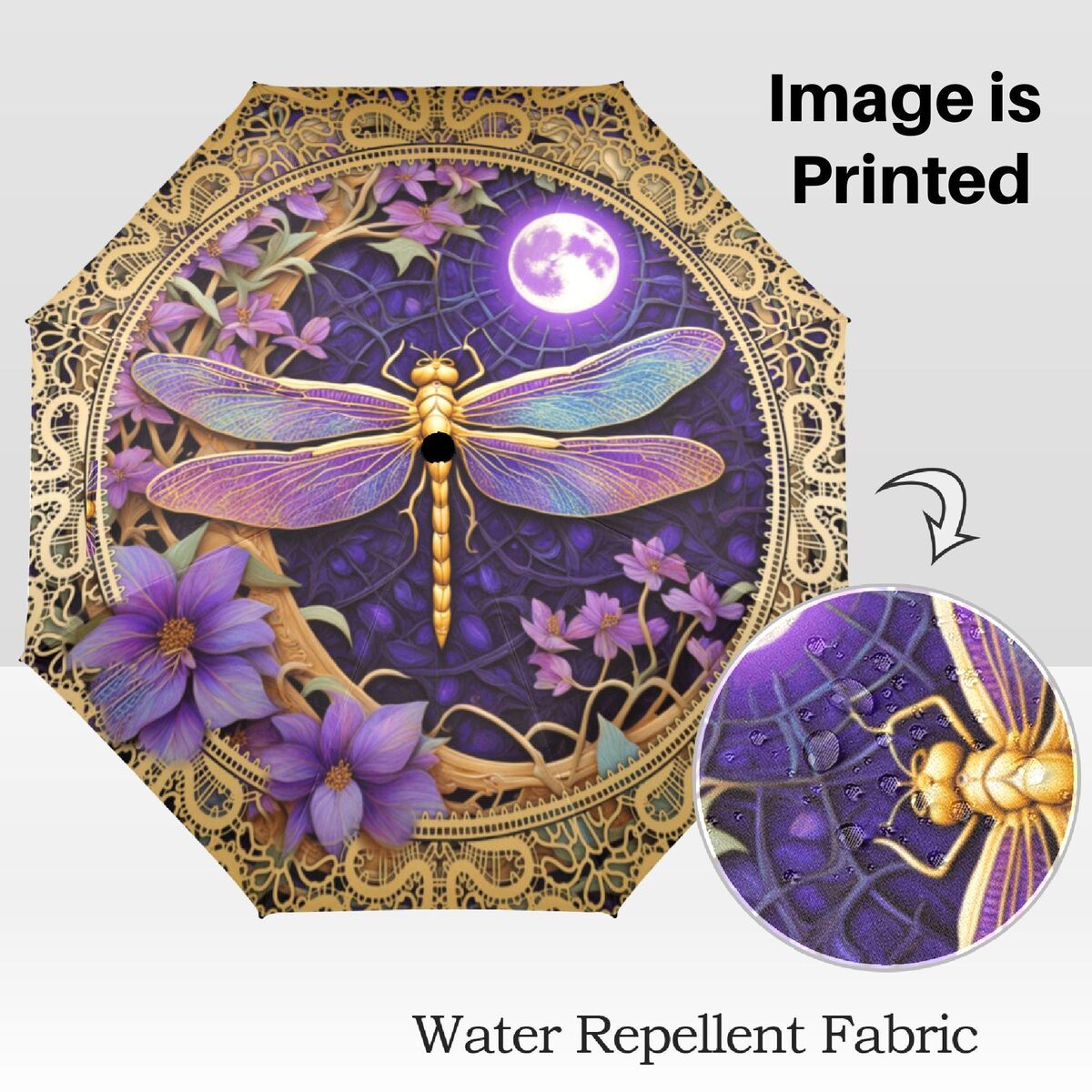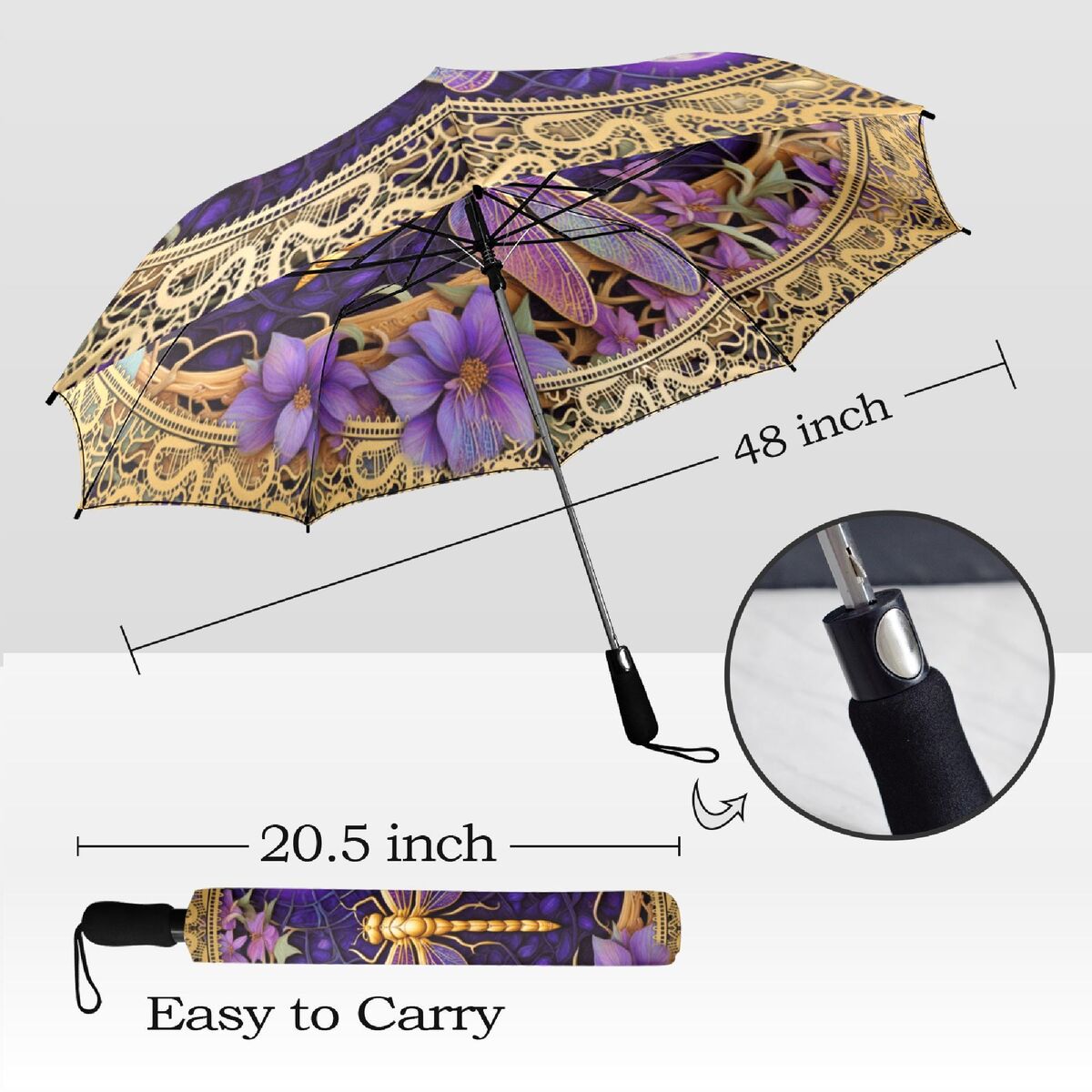 Purple Dragonfly Umbrella Romantic Art Nouveau Floral Flower Blossoms Faux Stained Glass Parasol Semi-Automatic Waterproof Foldable Umbrella