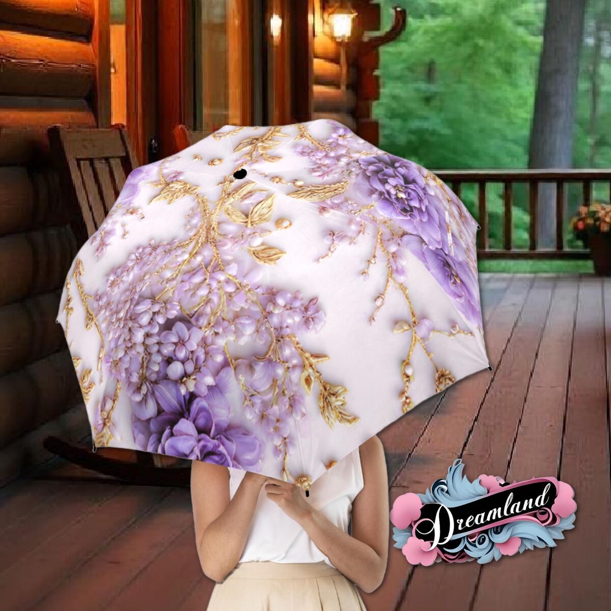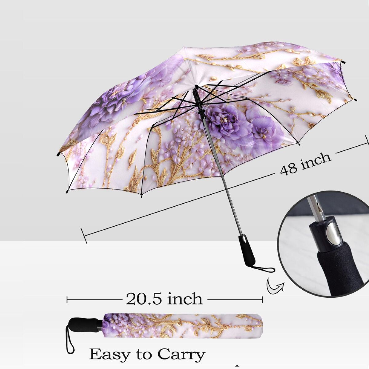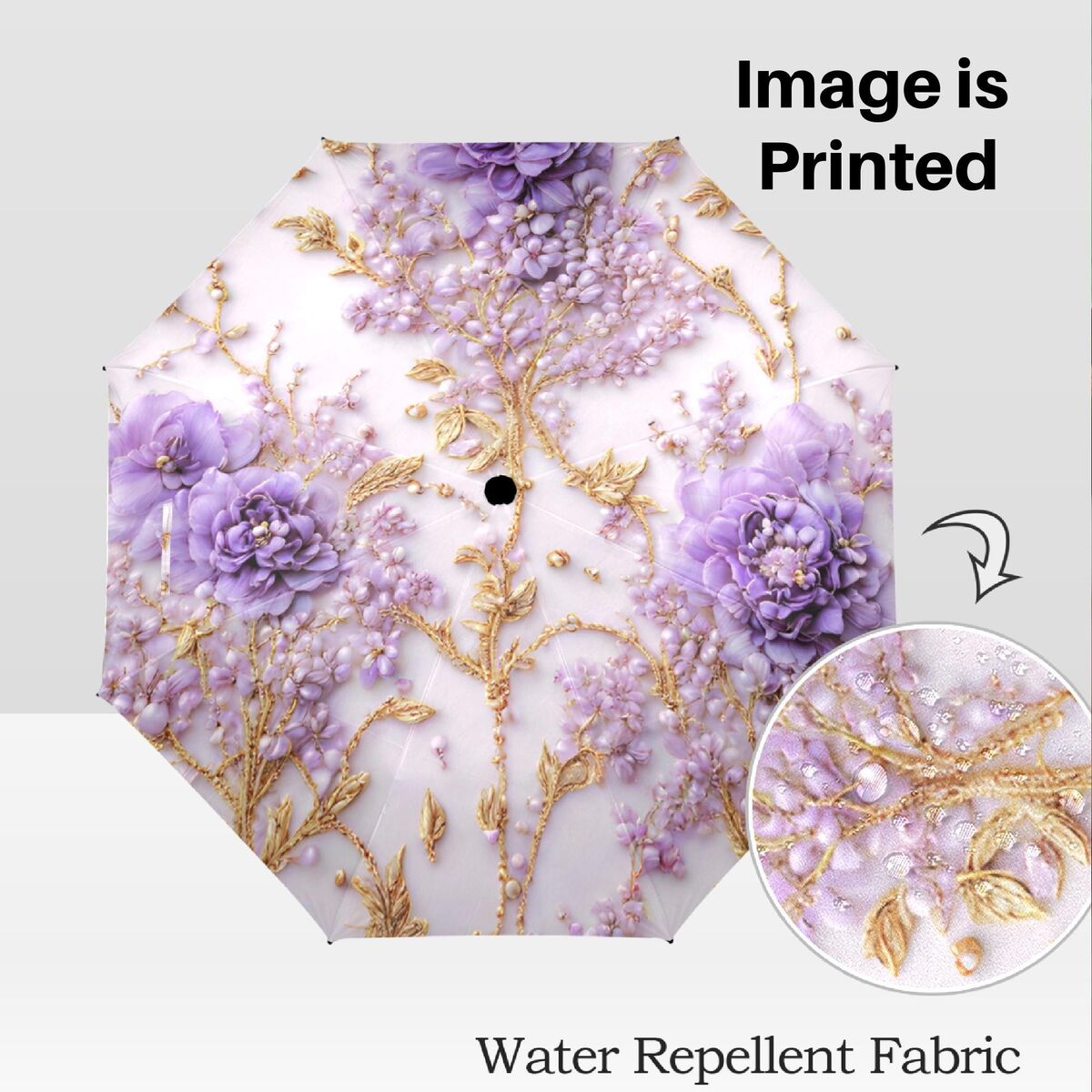 Purple Gold White Floral Unique Umbrella Art Nouveau Style Printed Faux Flowers Beads Parasol Semi-Automatic Waterproof Foldable Umbrella
